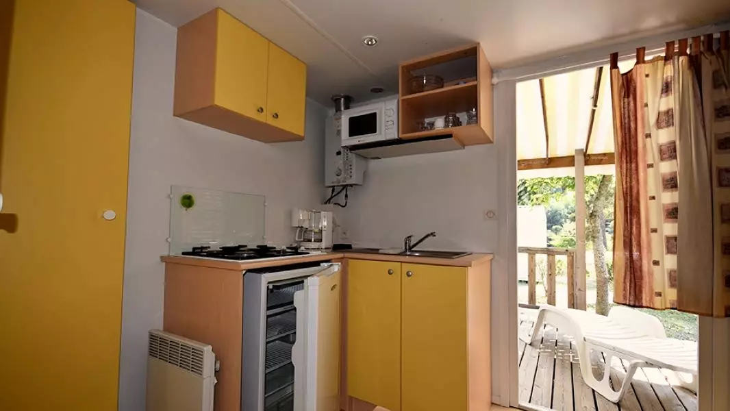 Mobil-home de luxe pour 4/6 personnes max., avec cuisine équipée, lave-vaisselle, plaque de cuisson, machine à café, réfrigérateur avec congélateur. Séjour avec télévision et vue sur la rivière, air conditionné, salle de douche, lavabo et sèche-cheveux, WC séparé. Une terrasse plein sud avec vue sur la rivière, salon de jardin, chaises longues et parasol.