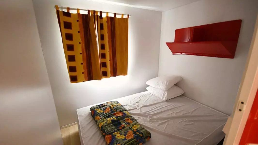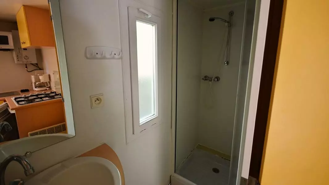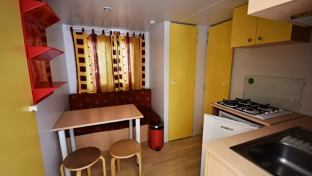Mobil-home pour max 6 personnes avec 3 chambres à coucher, une salle de douche entièrement équipée avec lavabo, douche, sèche-cheveux. Une cuisine avec lave-vaisselle, machine à café, plaque de cuisson, micro-ondes, réfrigérateur avec congélateur. Toilettes séparés. Un salon confortable avec télévision, air conditionné et vue sur la terrasse.