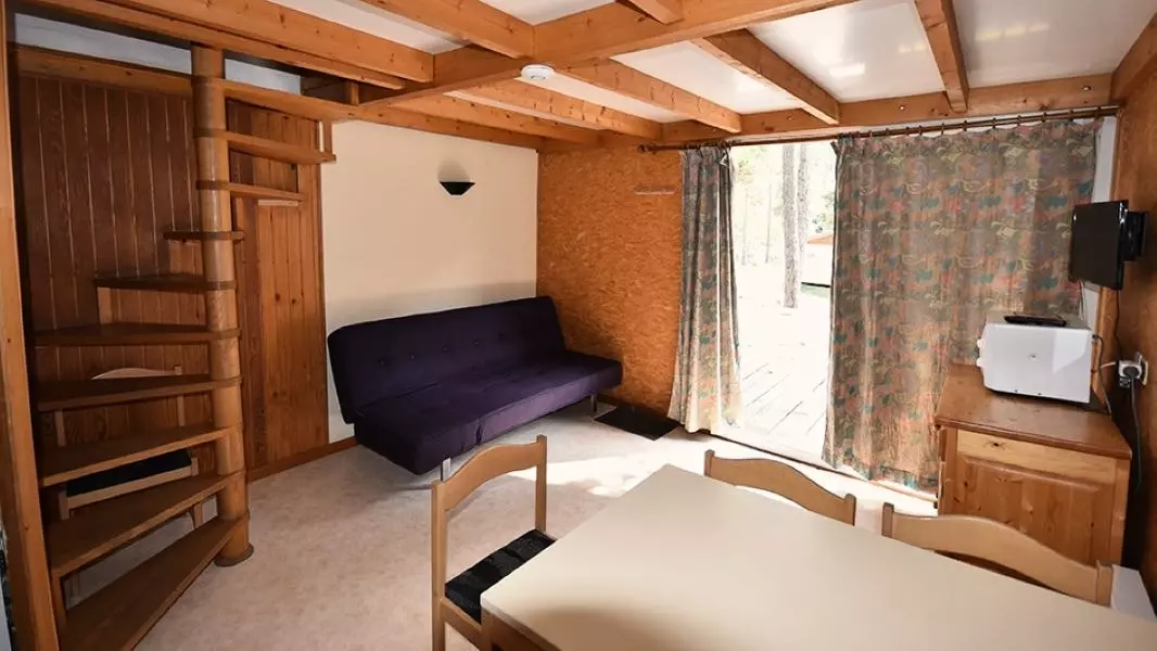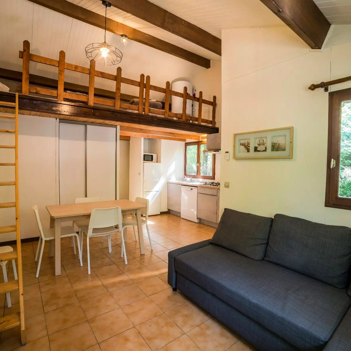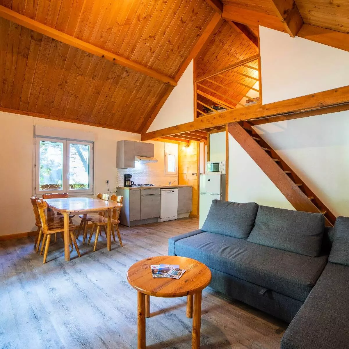 Chalet confortable pour max. 6 personnes, avec 1 chambre, et une mezzanine (cet espace n'est pas adapté à des enfants en bas âge), cuisine équipée avec feu à gaz, micro-ondes, réfrigérateur avec congélateur, lave-vaisselle, cafetière, salle de séjour avec prise TV, climatisation, salle de douche, toilette et lavabo, une terrasse avec mobilier de jardin, parasol et chaises longues et un petit jardin .