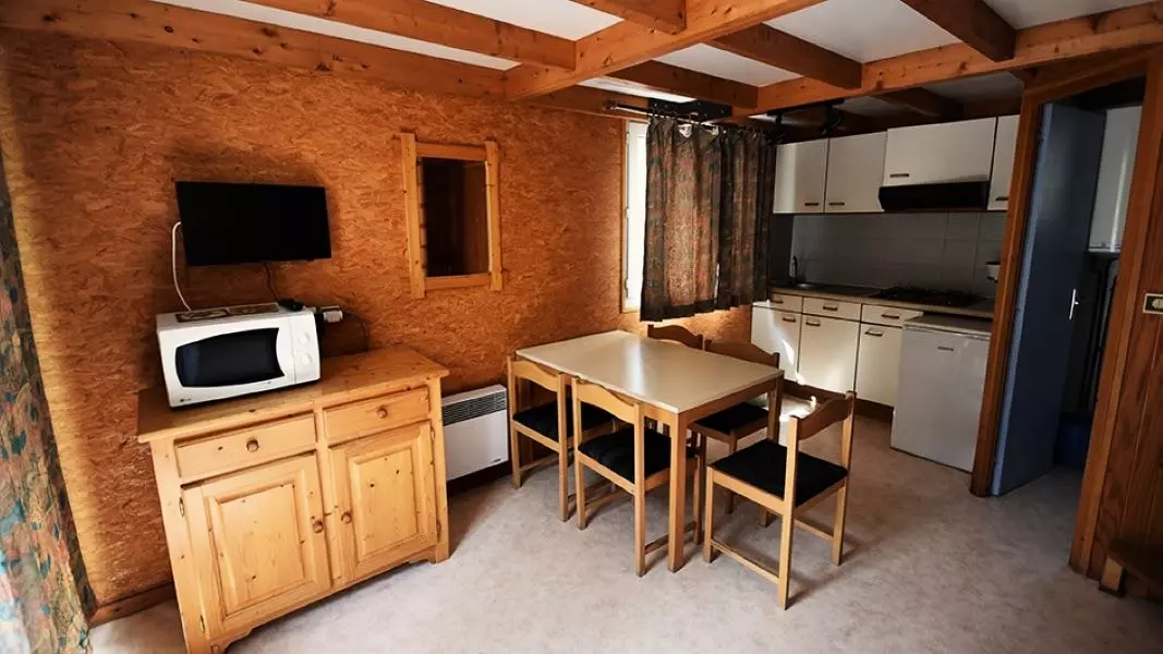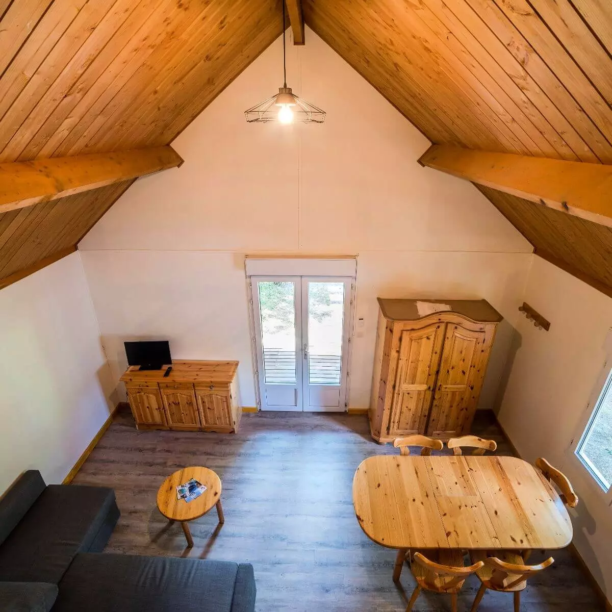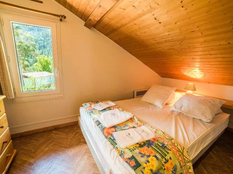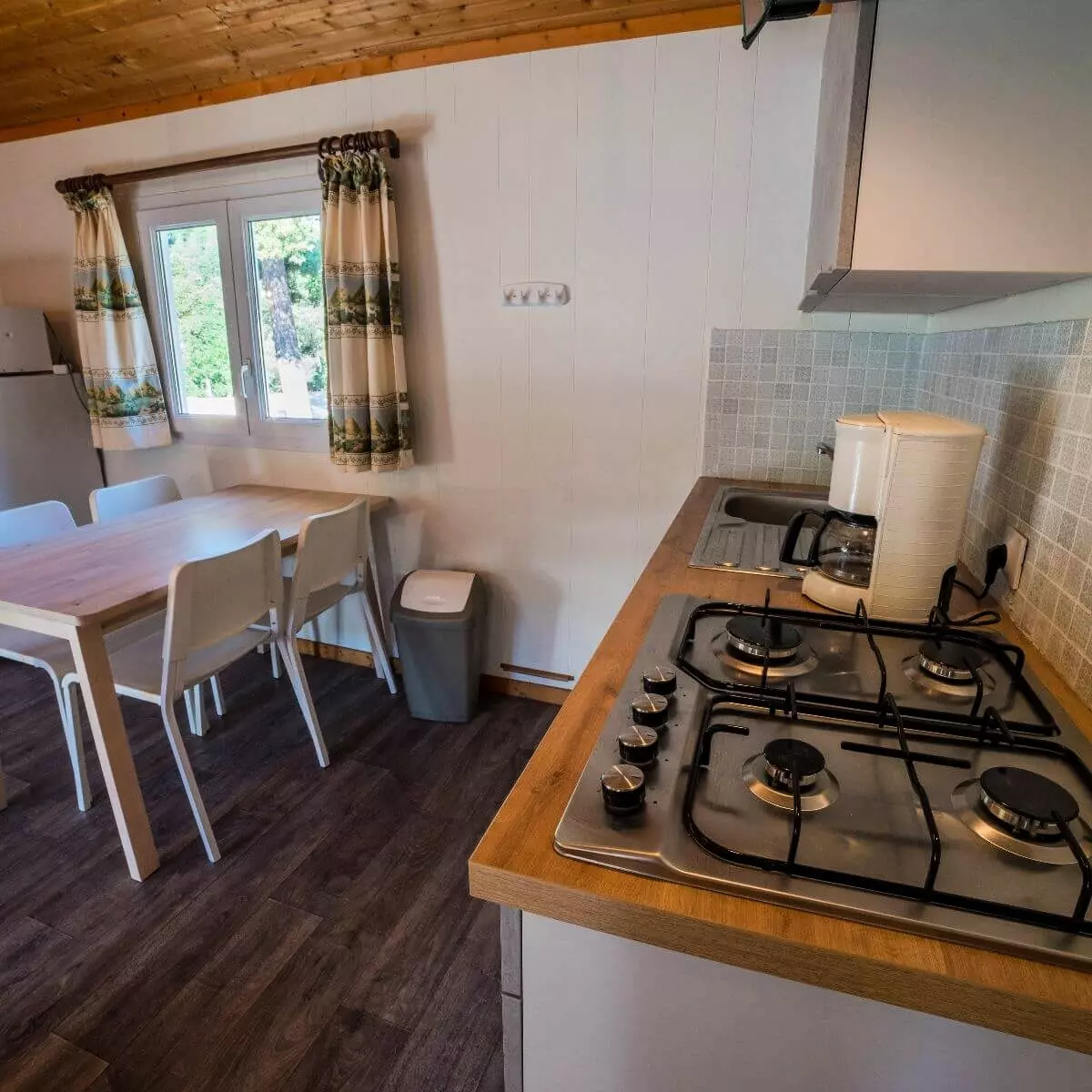 Chalet confortable pour max. 6 personnes, avec 1 chambre, et une mezzanine (cet espace n'est pas adapté à des enfants en bas âge), cuisine équipée avec feu à gaz, micro-ondes, réfrigérateur avec congélateur, lave-vaisselle, cafetière, salle de séjour avec prise TV, climatisation, salle de douche, toilette et lavabo, une terrasse avec mobilier de jardin, parasol et chaises longues et un petit jardin .