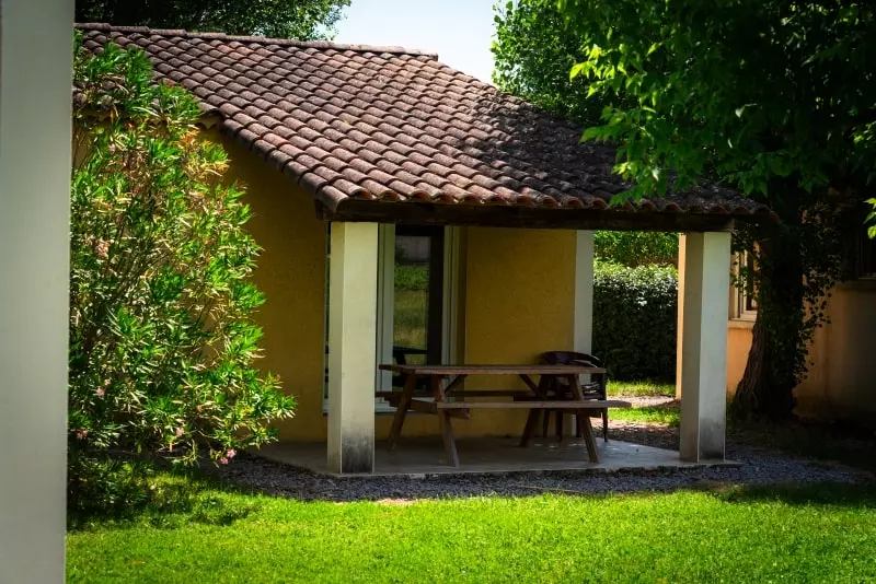 À l'extérieur, une terrasse couverte avec une table en bois vous invite à partager vos repas en plein air.