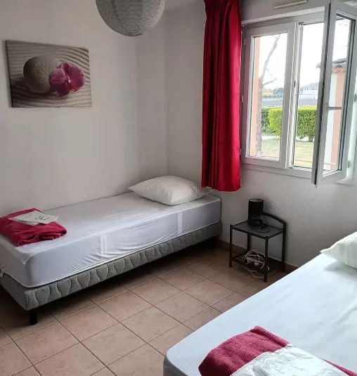 Le gîte comprend deux chambres confortables : une chambre avec un lit double en 160 cm et une seconde chambre avec deux lits simples, offrant une literie très confortable. La salle d'eau est séparée des WC pour plus de praticité.