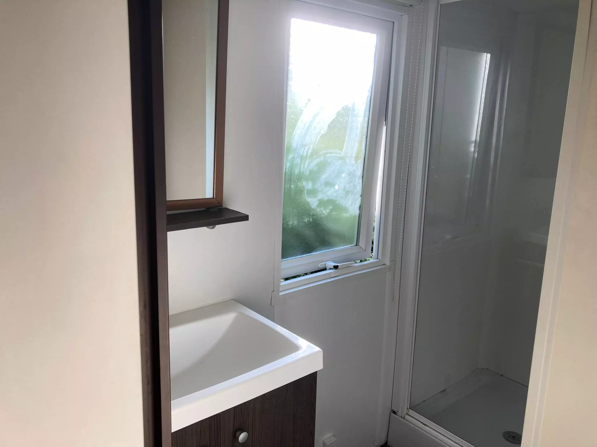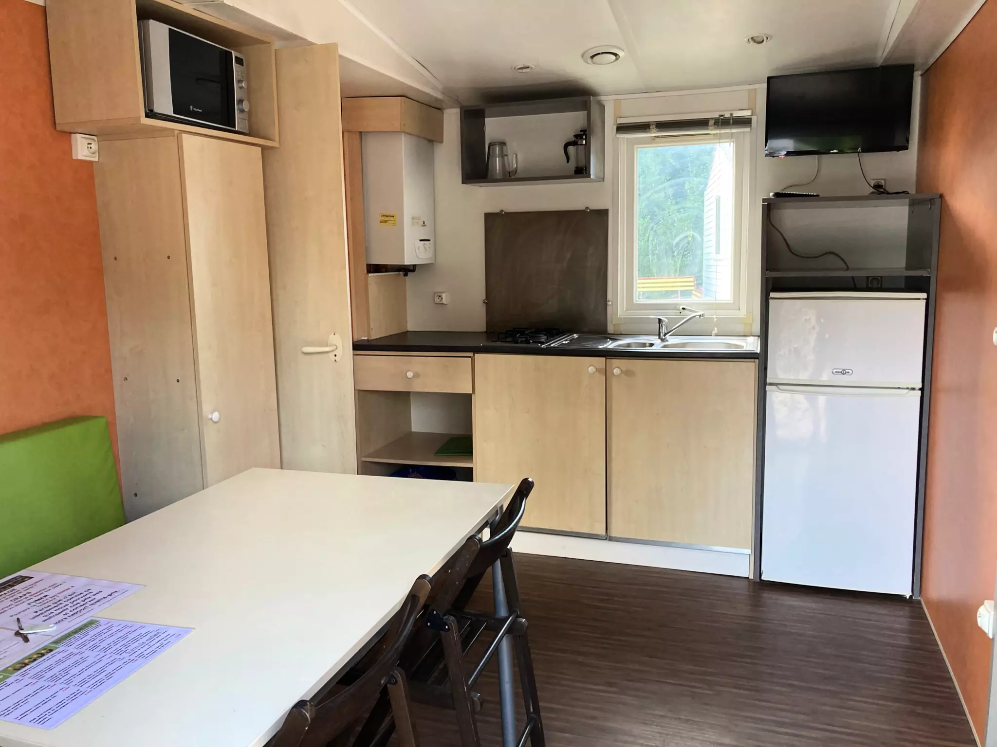 Ce mobilhome confort compte une pièce à vivre spacieuse avec avec table, 4 chaises, banquette d'angle et une télévision. Dans la pièce à vivre se trouve la kitchenette avec un frigo avec compartiment congélateur, 4 plaques gaz et micro-ondes, équipés des ustensiles de cuisine, assiettes, verres, tasses, couverts, casseroles, etc.La salle d'eau comprend une cabine de douche un et lavabo, le cabinet de toilettes est séparé.