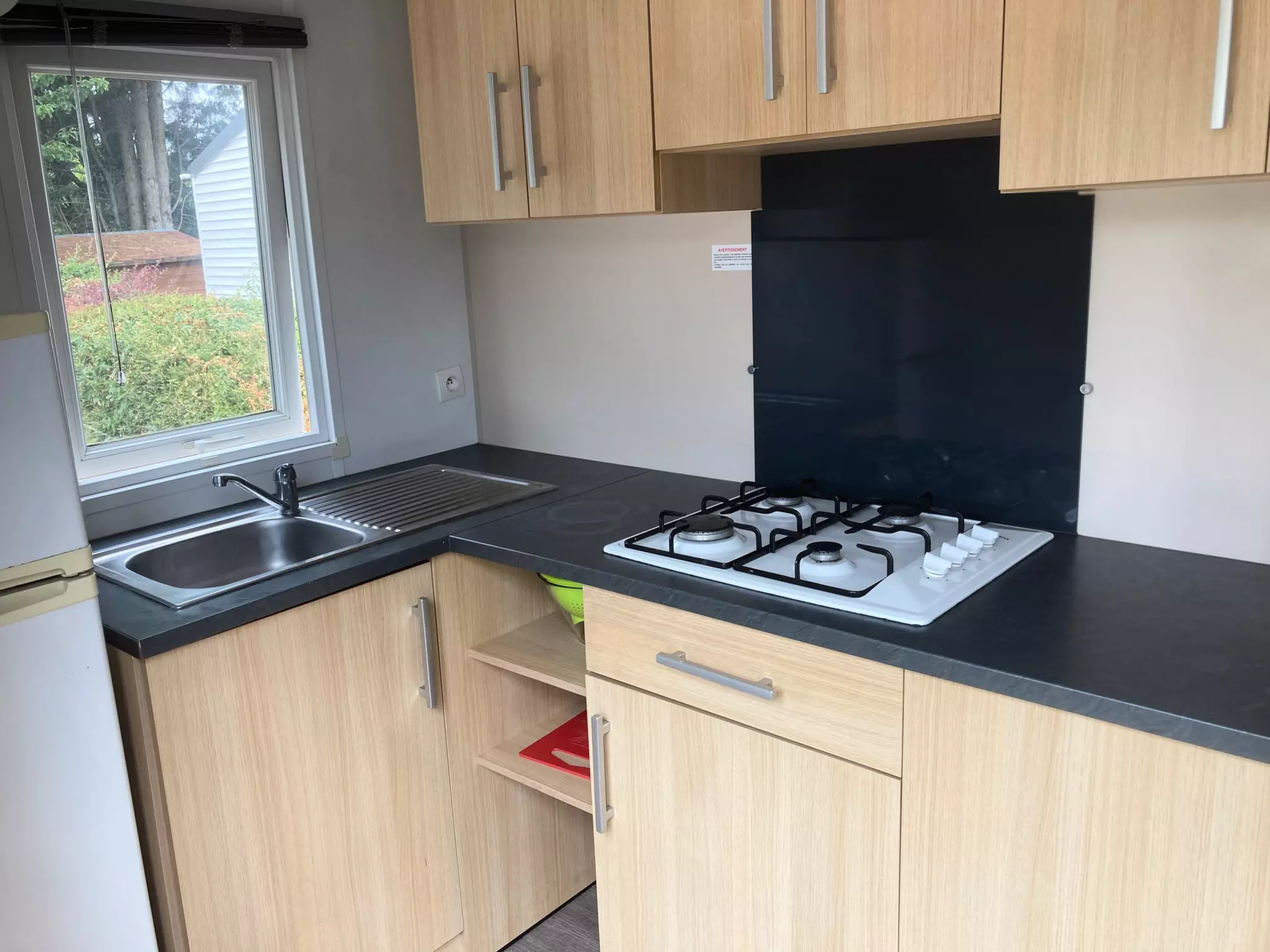 La cuisine est équipée de quatre plaques gaz, un frigo et un four micro-ondes.