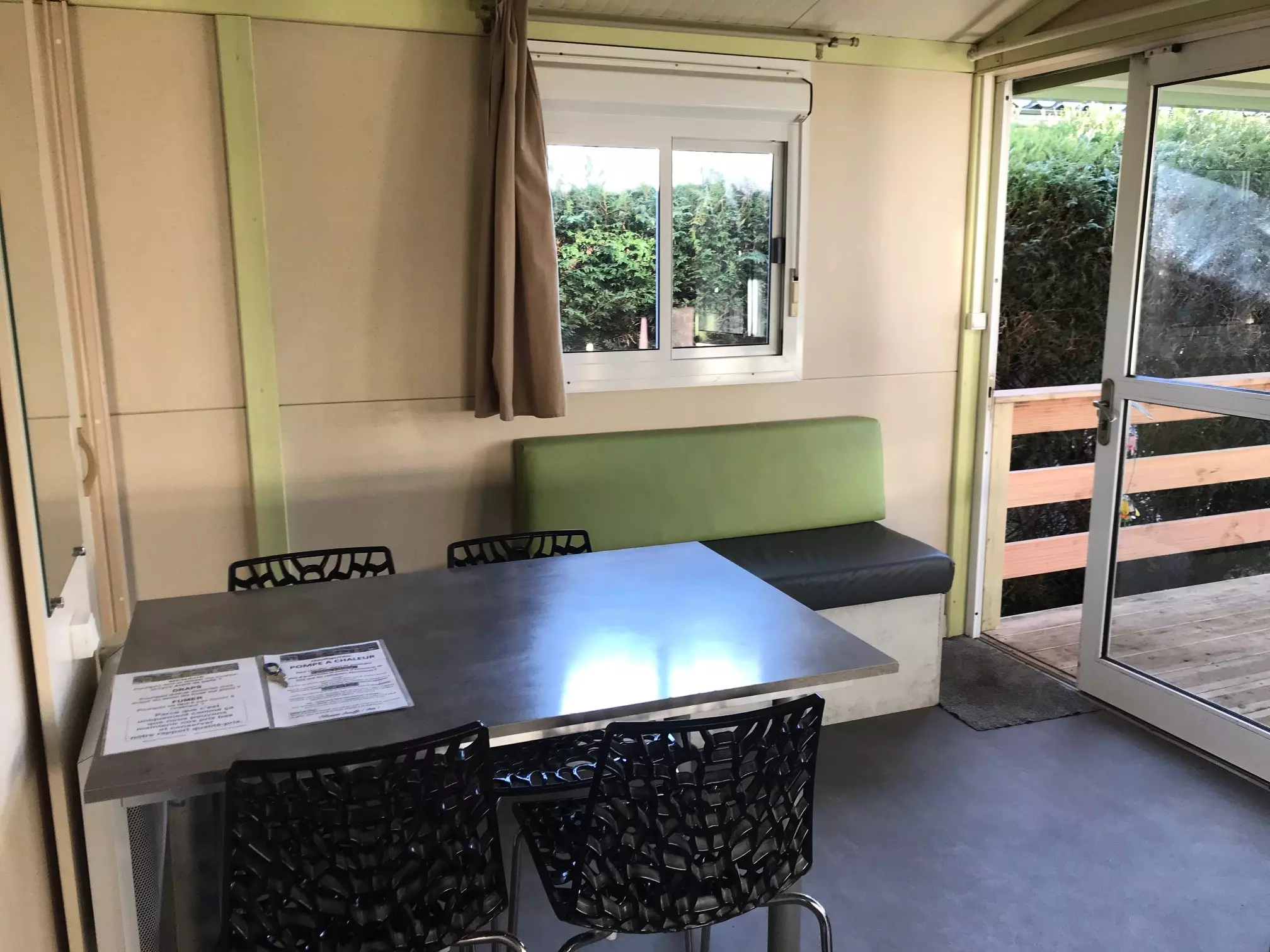 Le mobil home compte deux chambres : une chambre parentale avec lit double 140*190 et une chambre avec trois lits simples 90*190, dont deux superposés. Table avec bancs en bois dehors. Chauffage agréable en hiver par pompe à chaleur et climatisation en été par le même appareil !