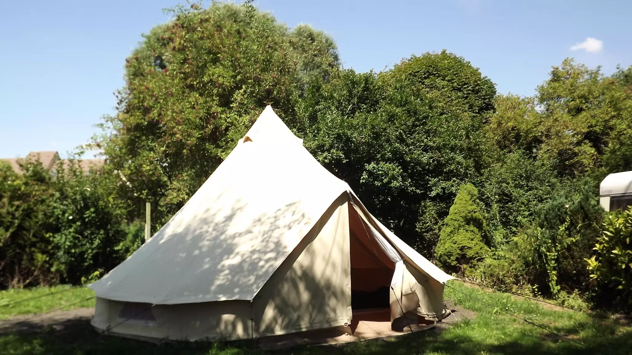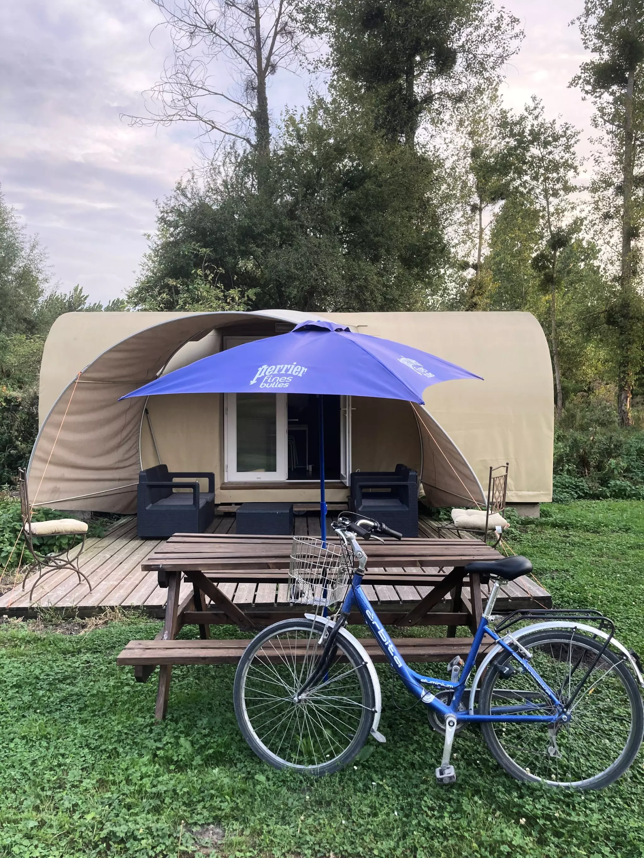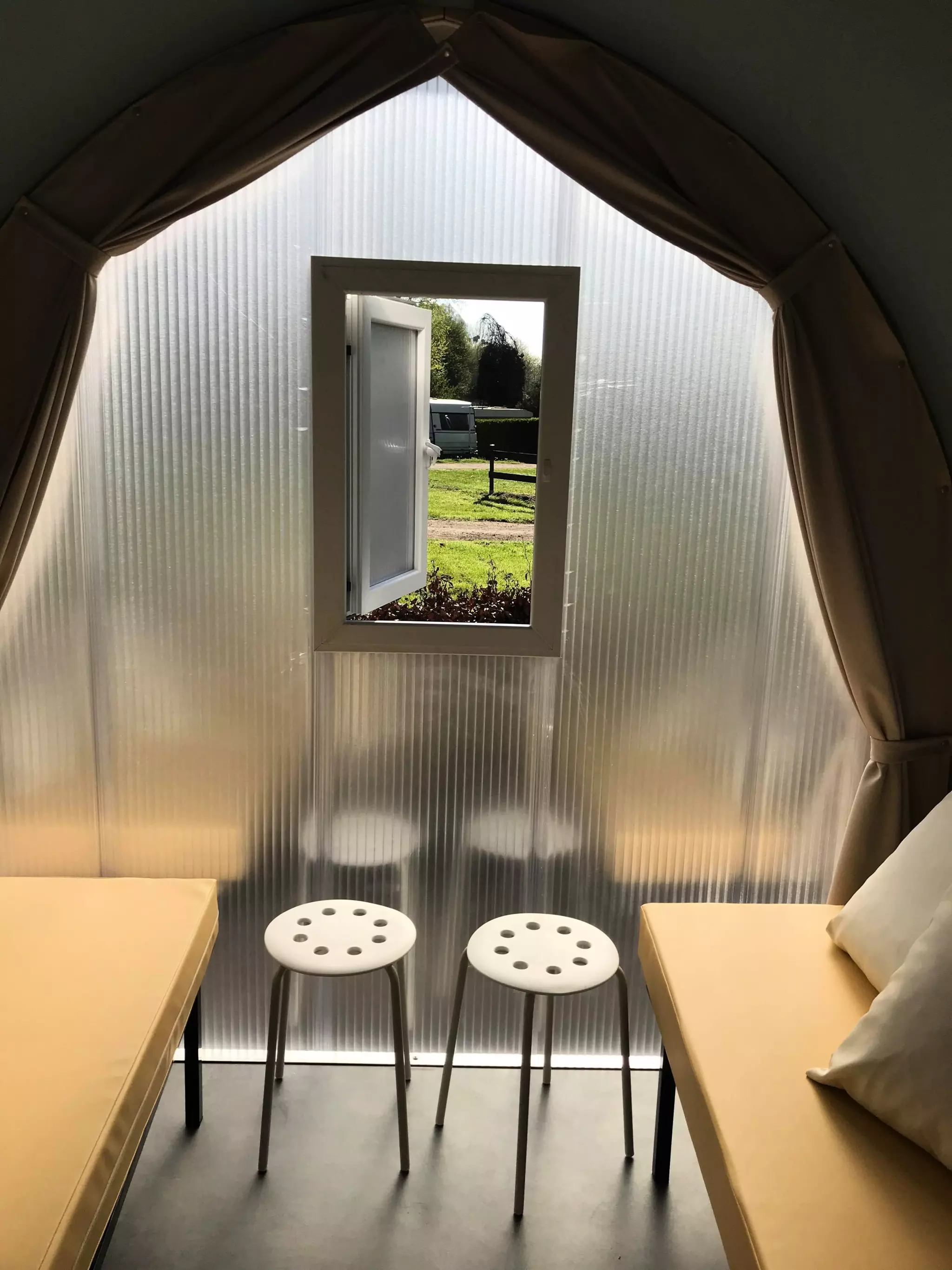 COCO est un mobil-home insolite entre tente et mobilhome, à la forme ronde recouverte d'une toile. Ses murs sont rigides et isolés, sa porte d'entrée se ferme à clé.