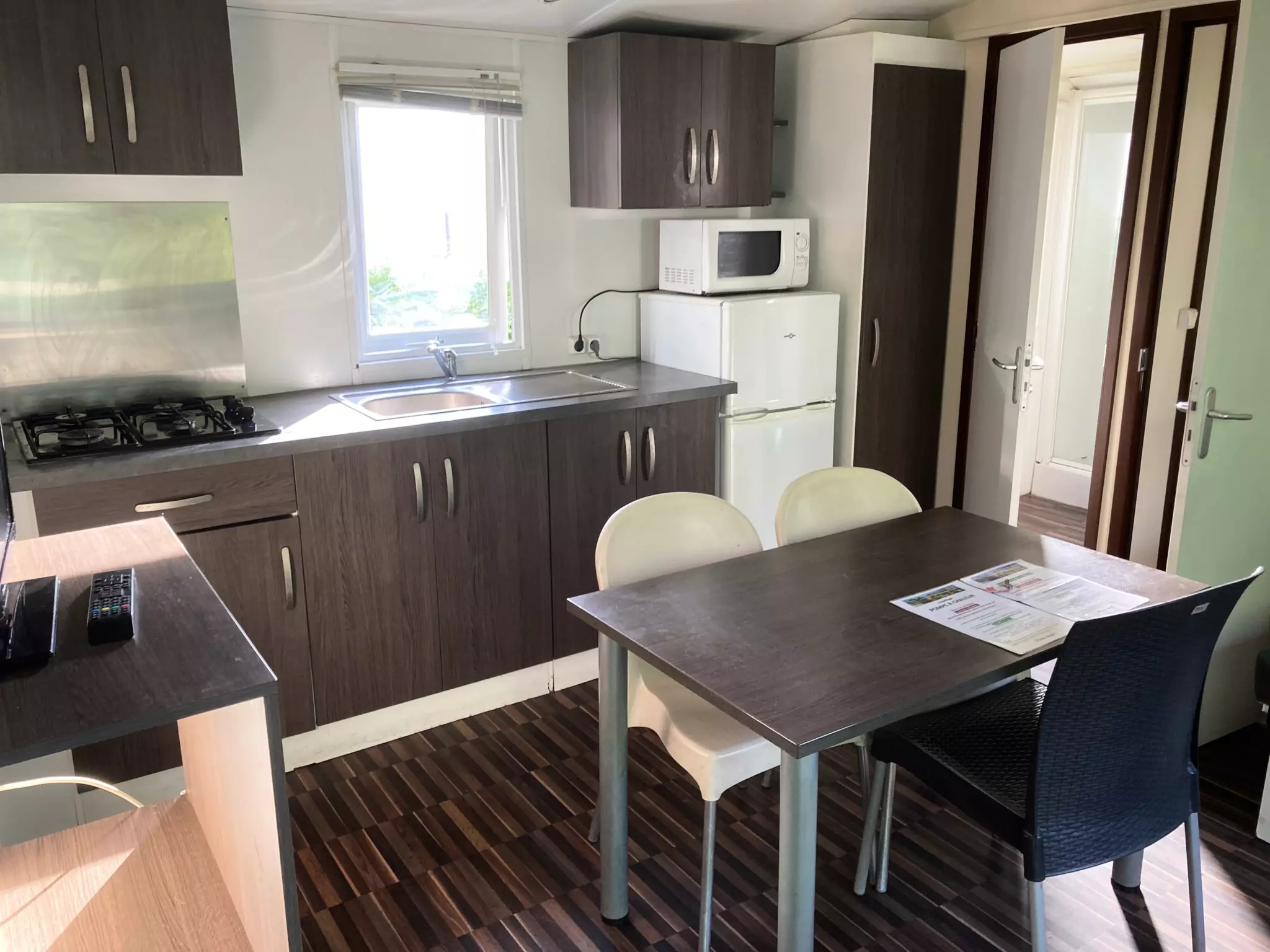 Pièce à vivre avec table, chaises et télé. Salle d'eau avec cabine de douche, toilettes, lavabo. Kitchenette avec frigo, 2 plaques gaz et micro-ondes, équipés des ustensiles de cuisine, assiettes, couverts, casseroles, etc.