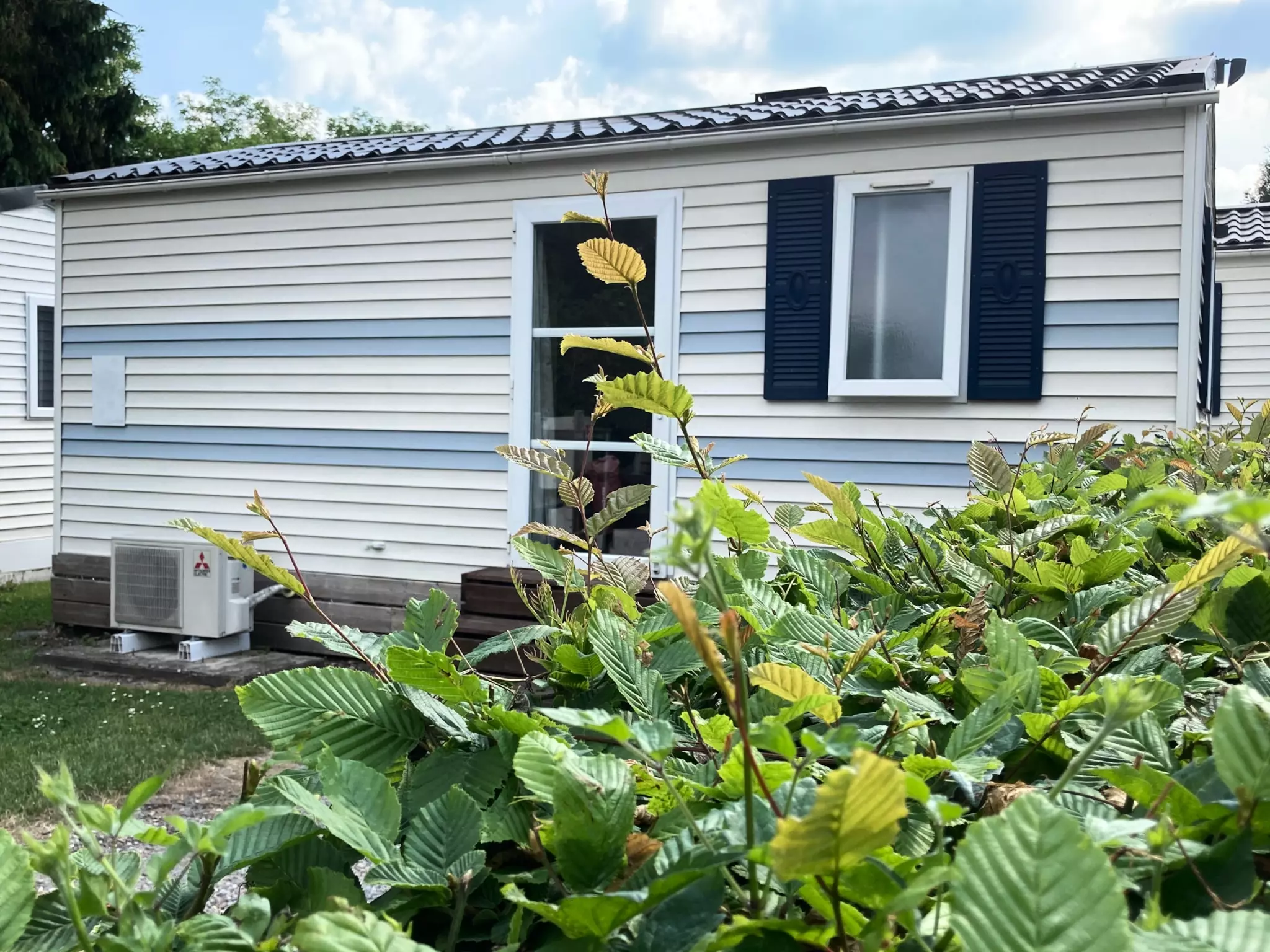 Il y adeux chambres, une chambreavec lit double140*190 et une chambre avec deux lits simples 90*190.Sur la terrasse un salon de jardin. Vous trouverez des barbecues partagés (charbon à apporter!) dans le camping. Chauffage et climatisation par pompe à chaleur.
