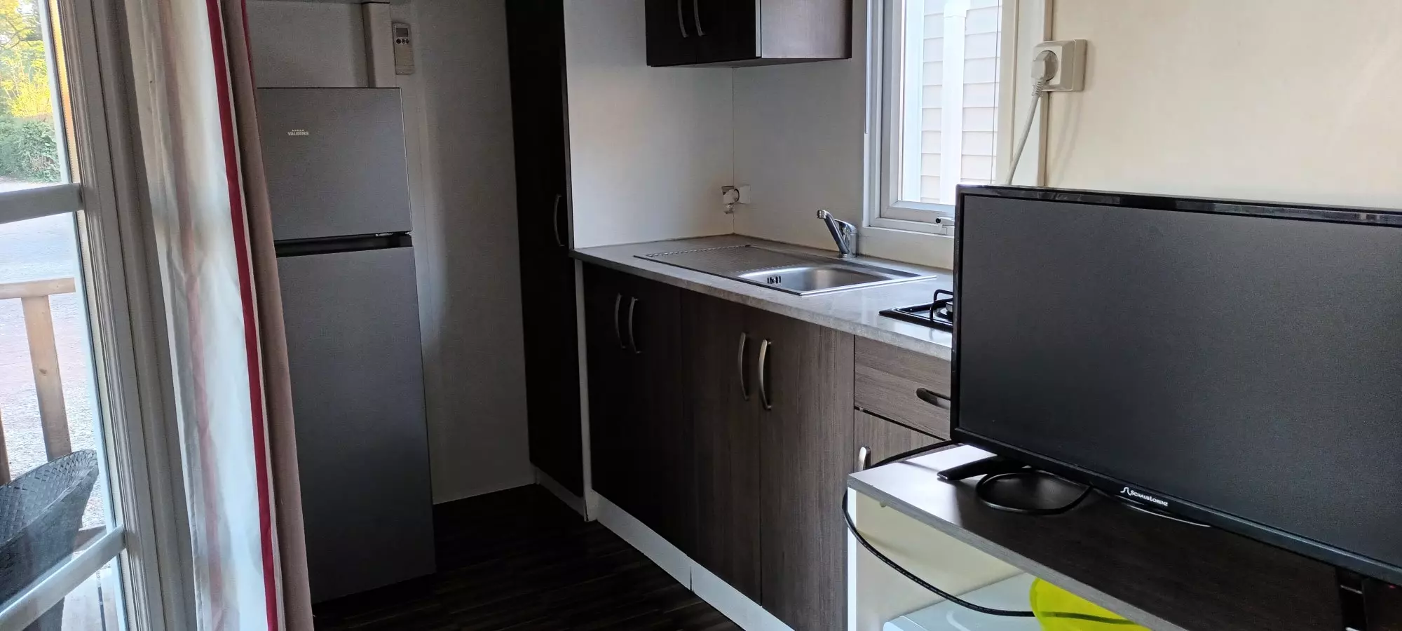 Pièce à vivre avec table, chaises et télé. Salle d'eau avec cabine de douche, toilettes, lavabo, kitchenette avec frigo, 2 plaques gaz et micro-ondes, équipés des ustensiles de cuisine, assiettes, couverts, casseroles, etc.