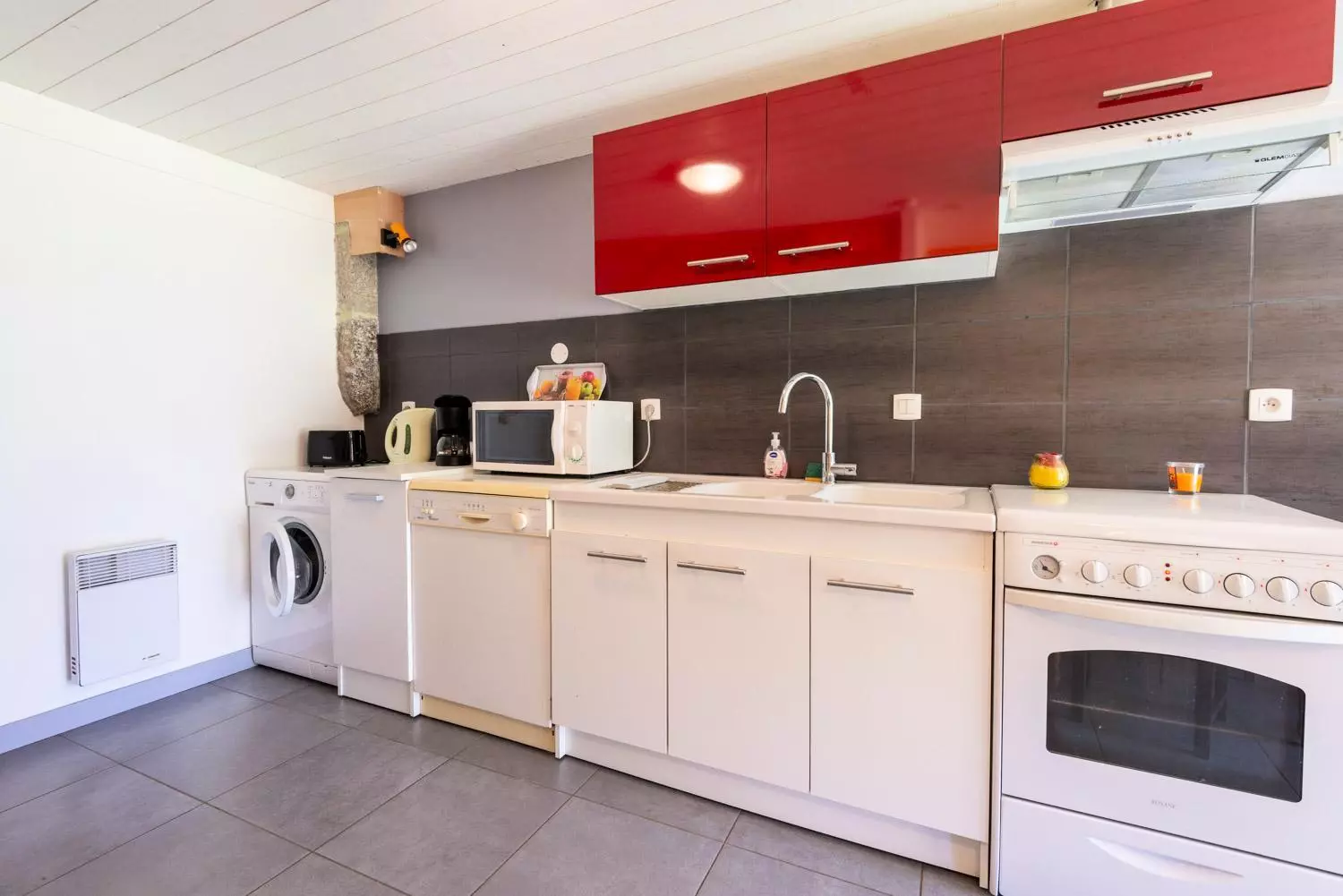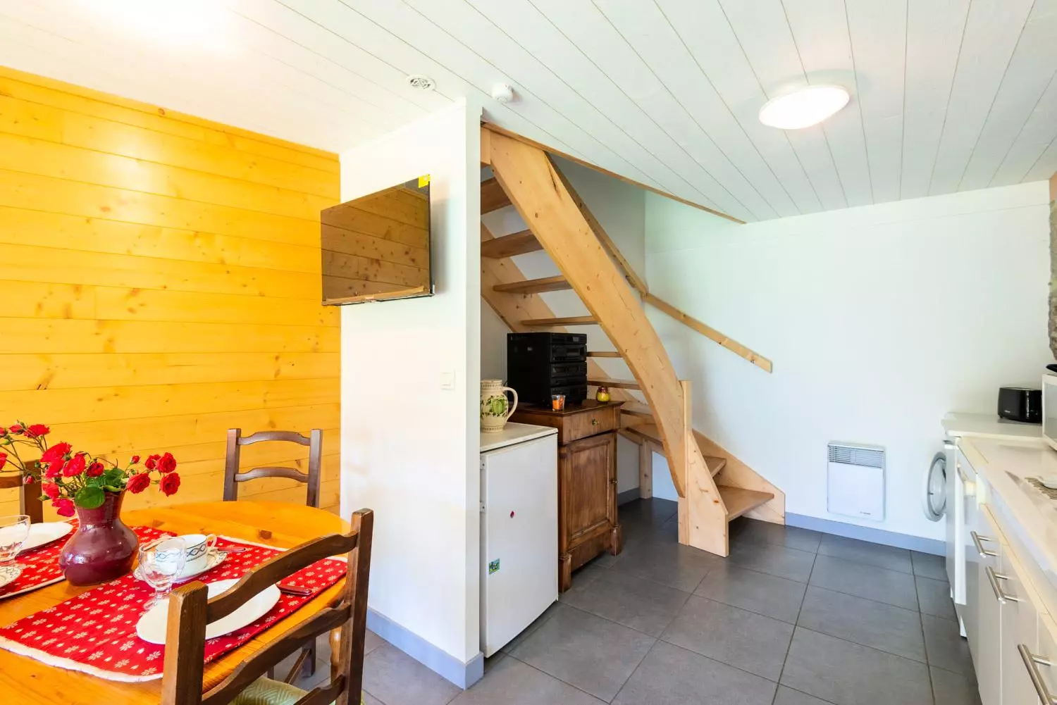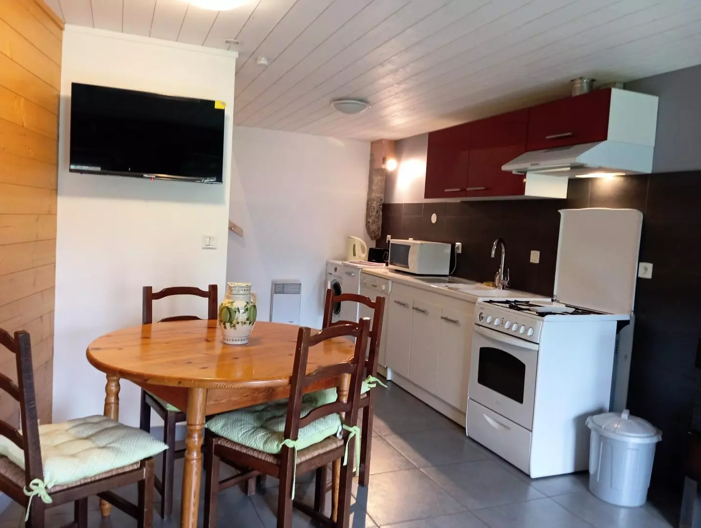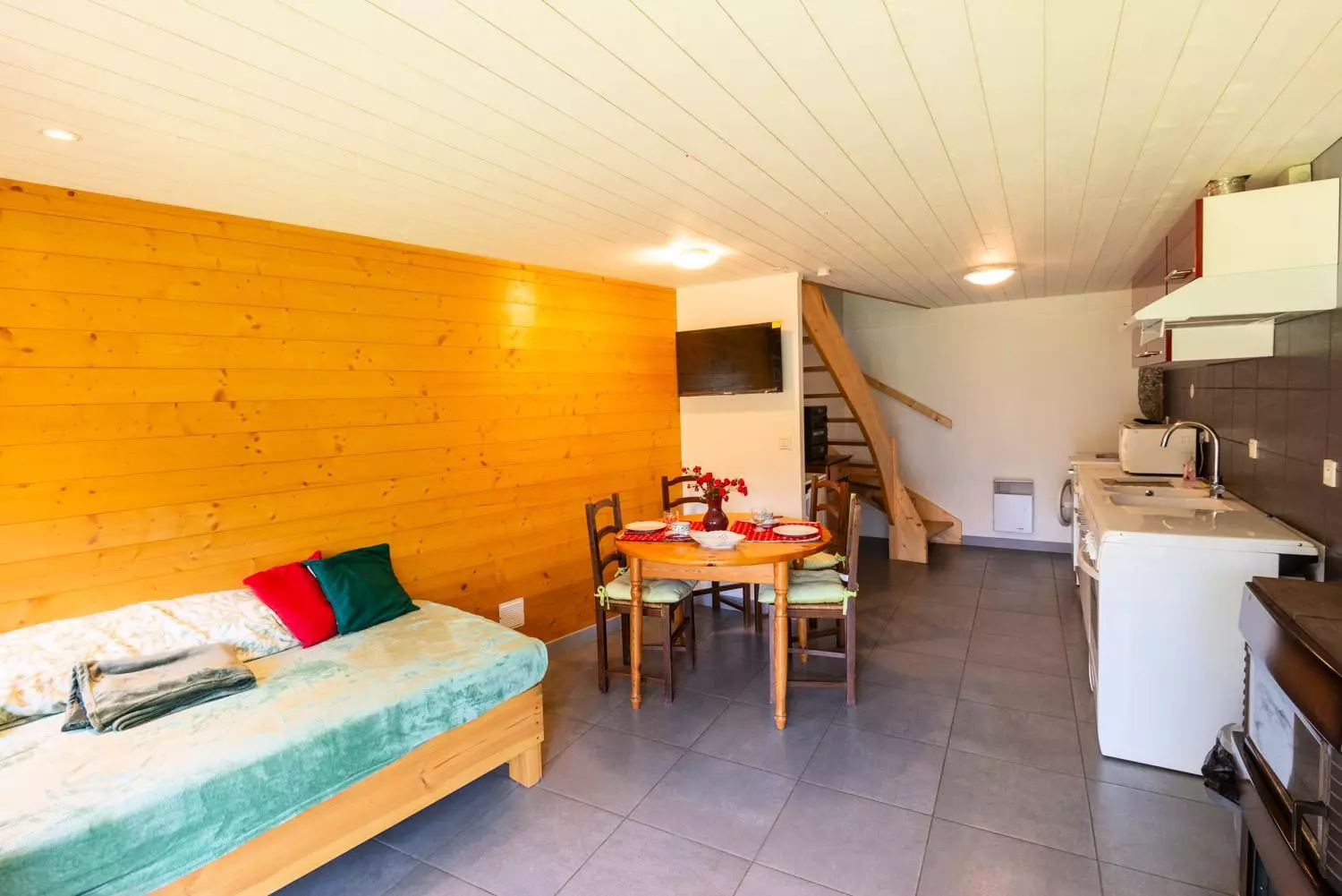 Au rez de chaussée, le séjour/cuisine (lave-linge, lave-vaisselle, gazinière avec four électrique, micro-ondes, réfrigérateur, cafetière, vaisselle, bouilloire) avec un lit en 90*190.