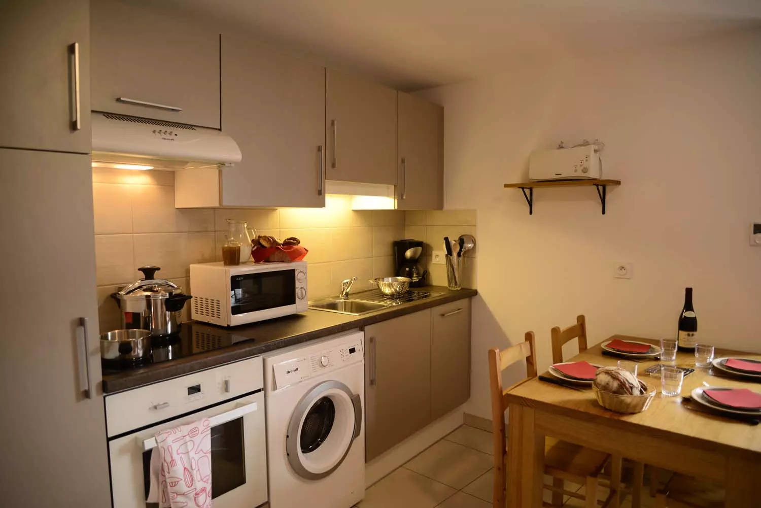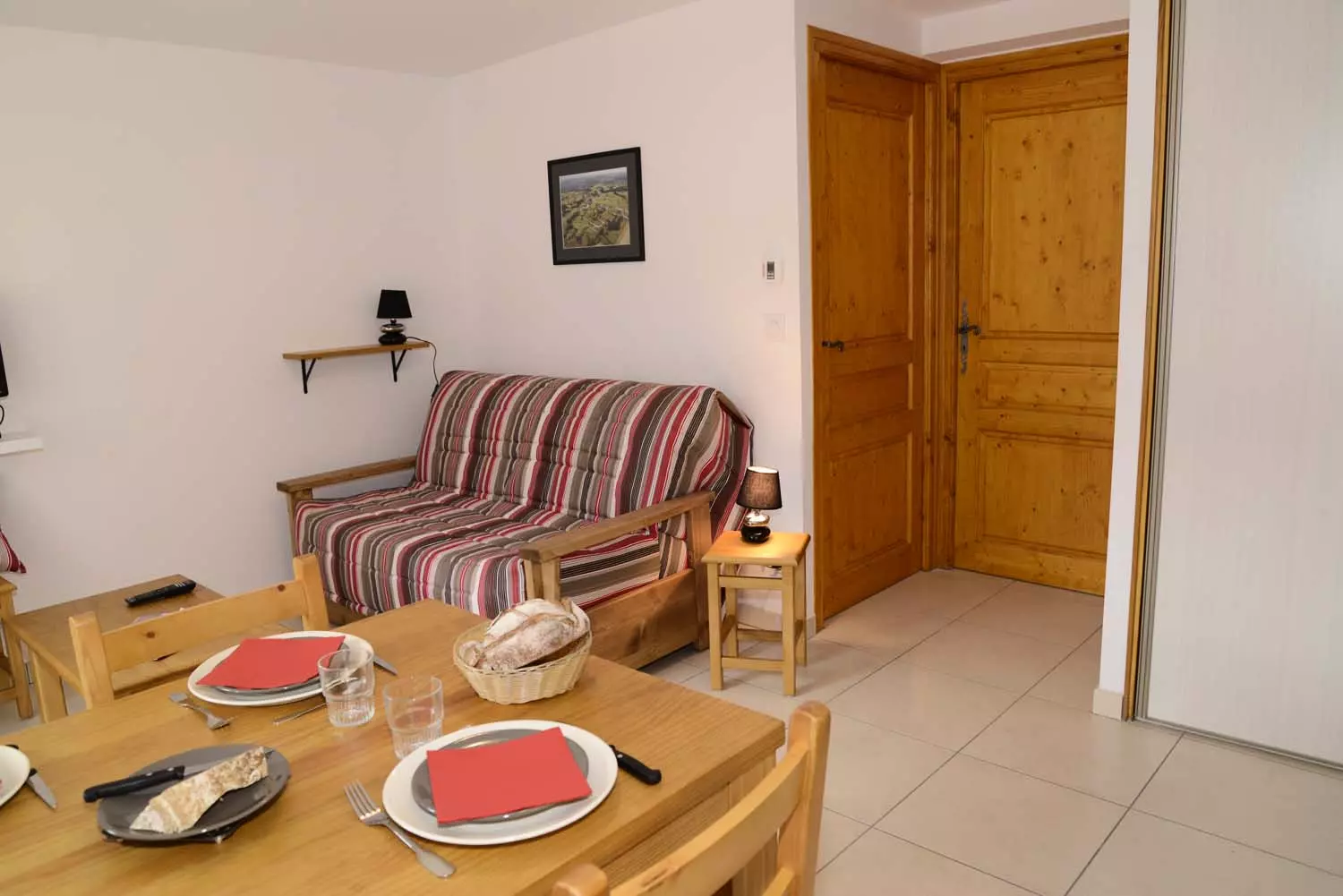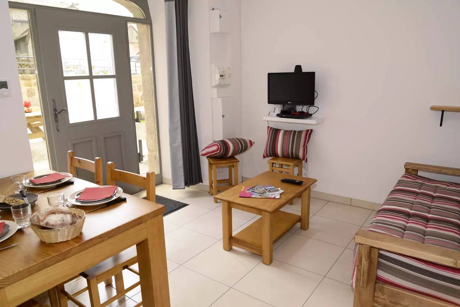 Salon (canapé BZ , télévision avec lecteur DVD), cuisine intégrée aménagée (micro-ondes, combiné congélation, lave vaisselle, lave-linge), une chambre (un lit deux places), salle d'eau et wc indépendant.