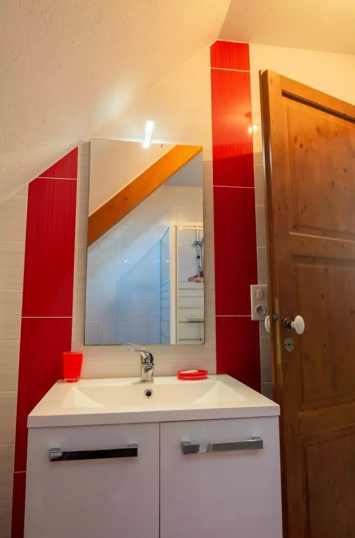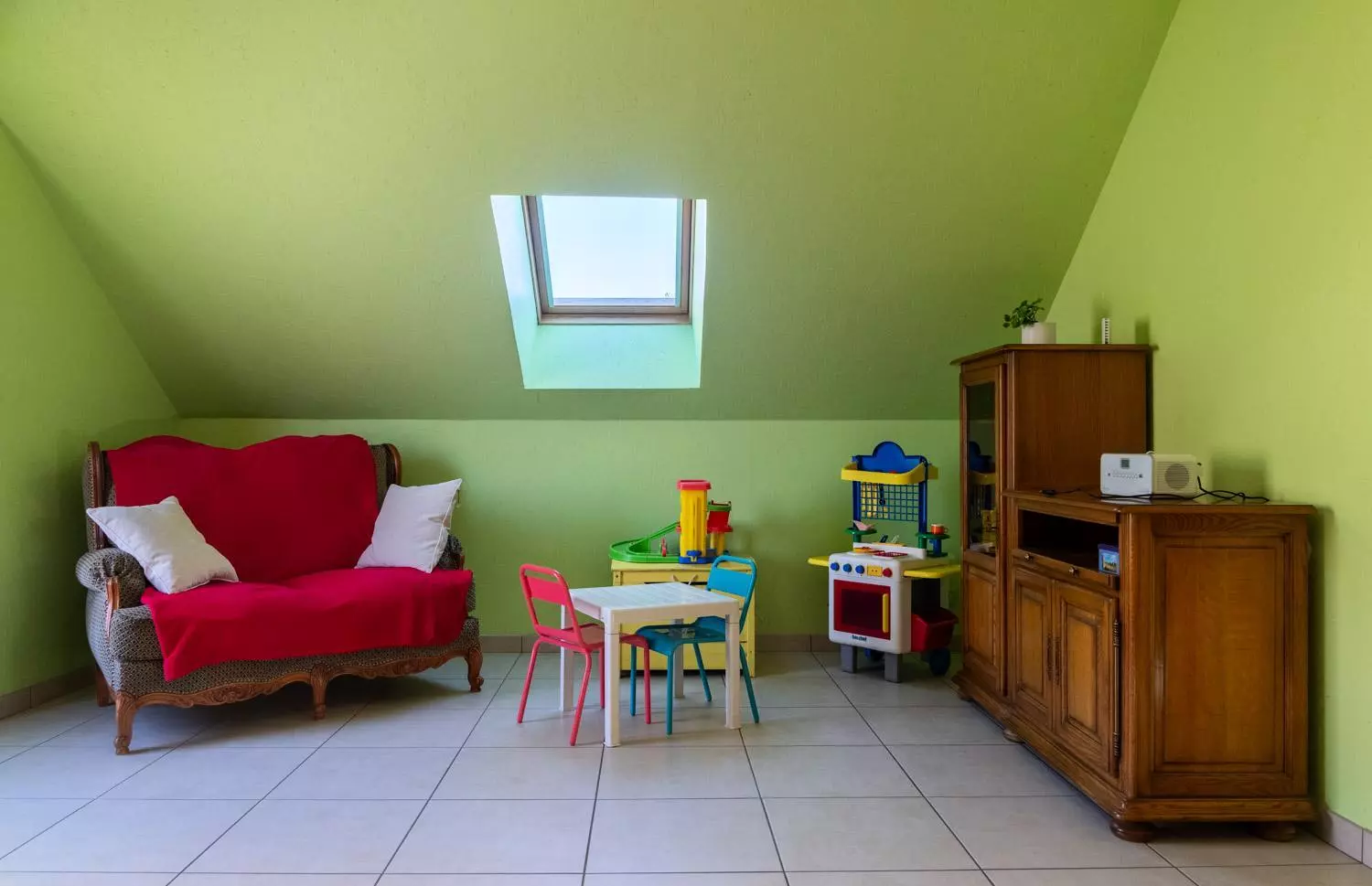 A l'étage : une mezzanine (espace jeux), une grande chambre (un lit double en 160), une chambre (un lit double en 140) communicante avec une chambre (un lit une place en 120 et un lit une place en 90), deux salles d'eau avec WC dont une avec lave-linge.