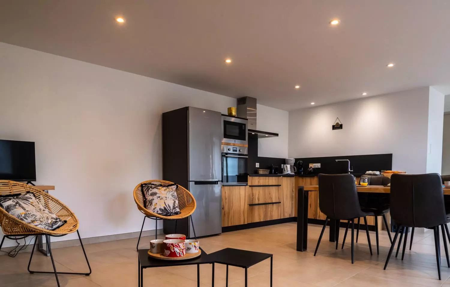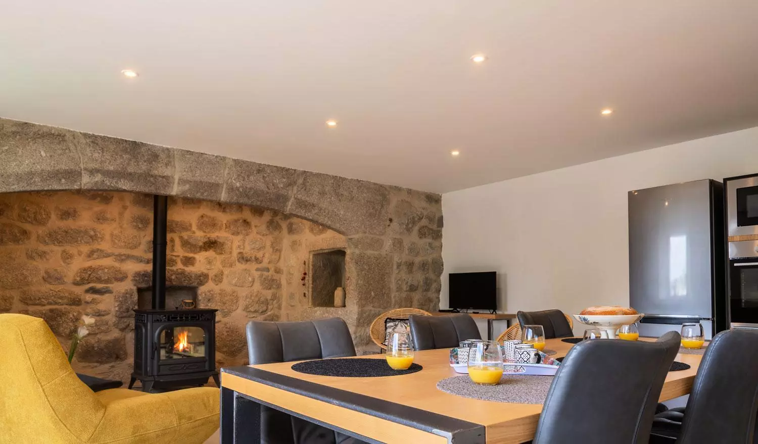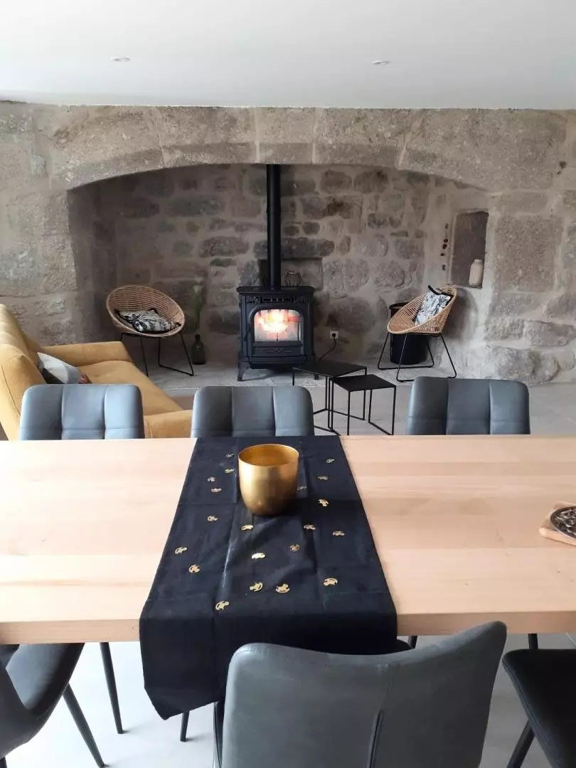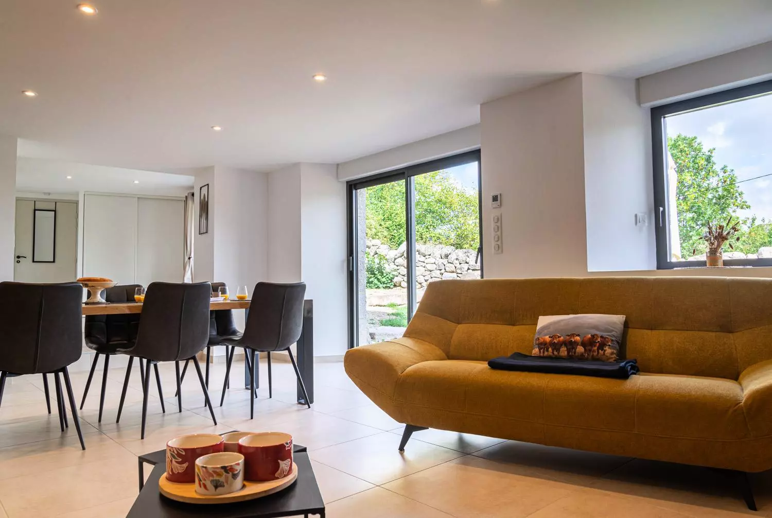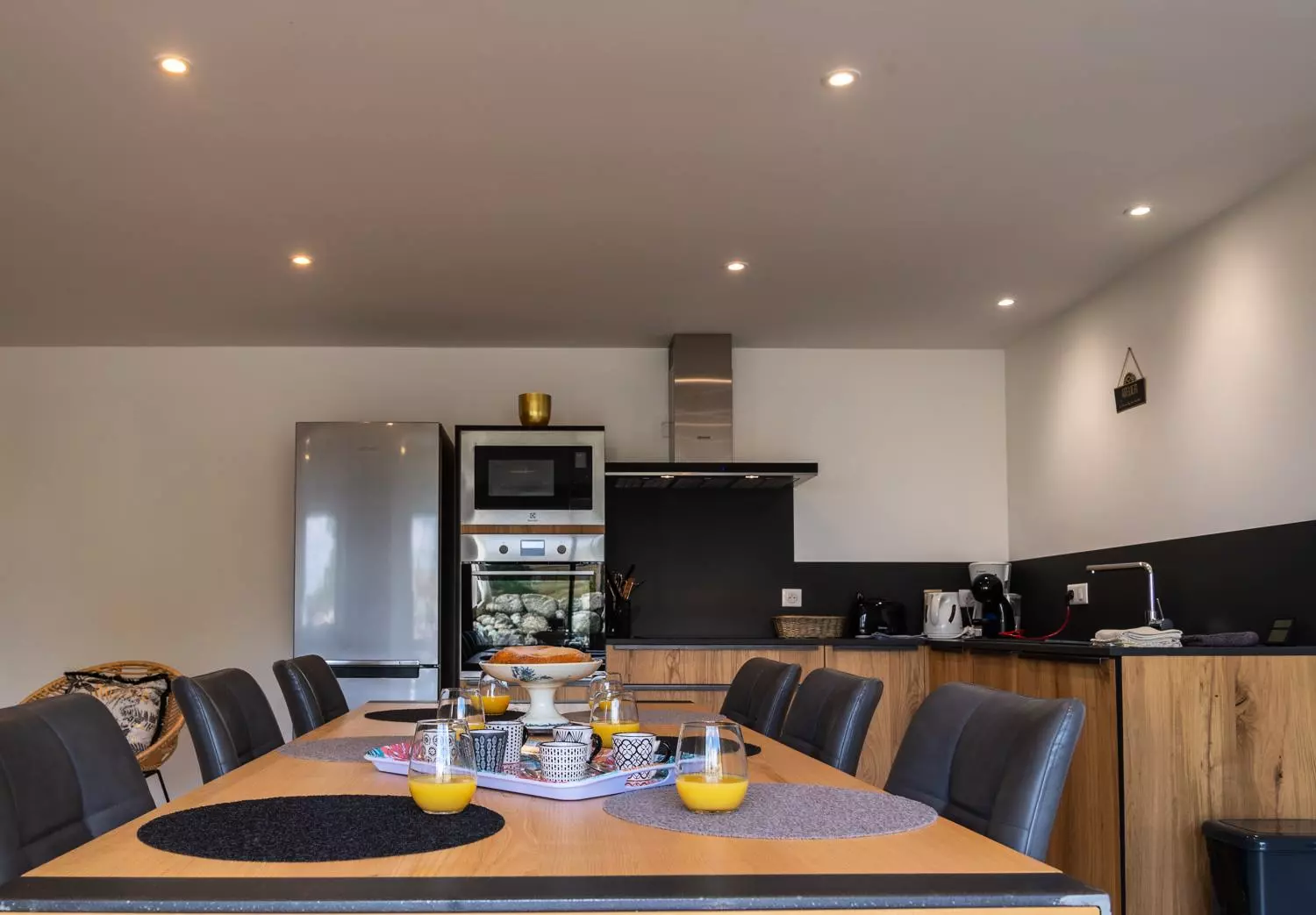 Gîte totalement indépendant de 120 m² : au rez-de-chaussée : grand séjour lumineux avec coin cuisine entièrement équipée, poêle à granulés, TV, 1 WC indépendant. La pièce principale donne sur la la terrasse.