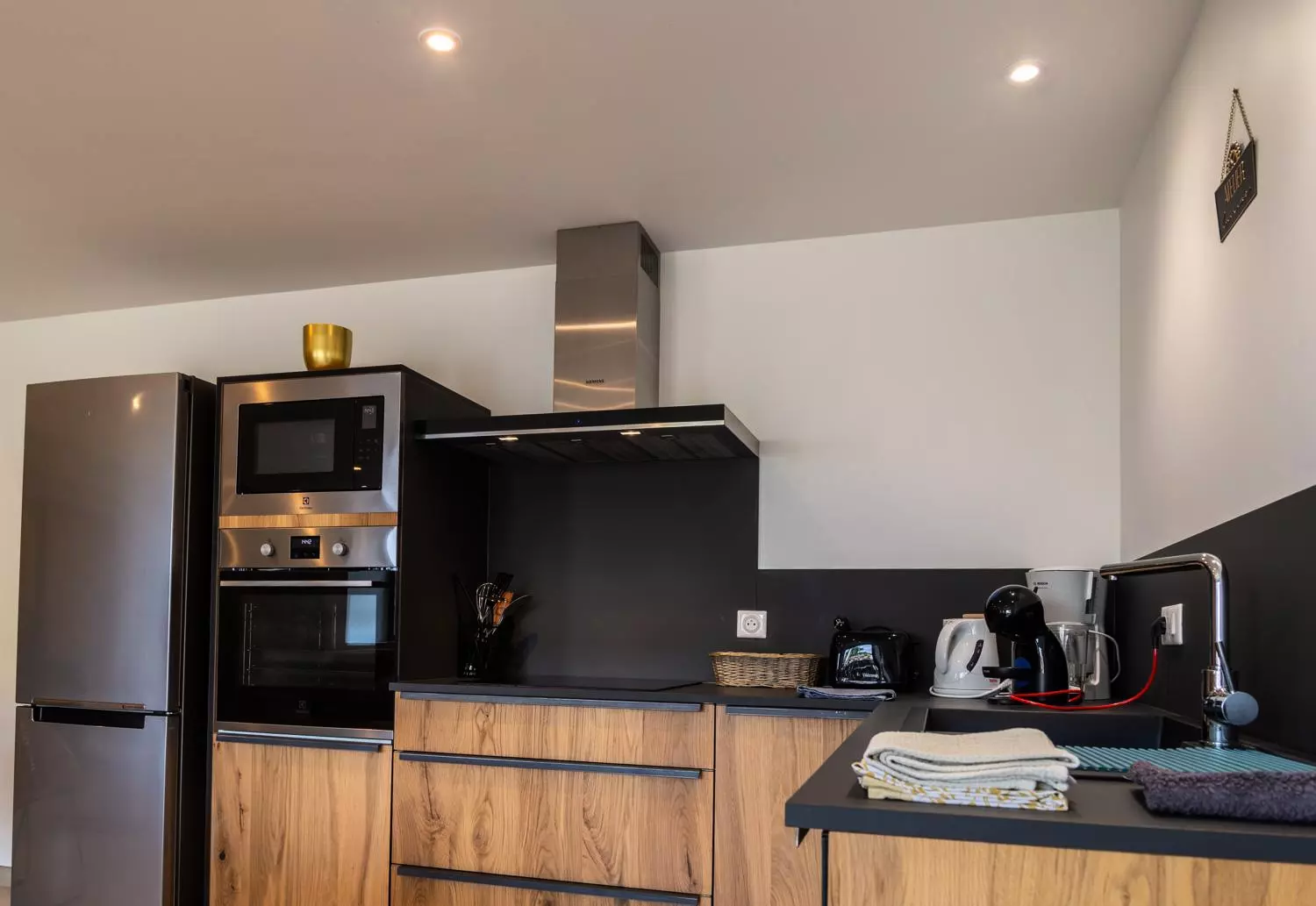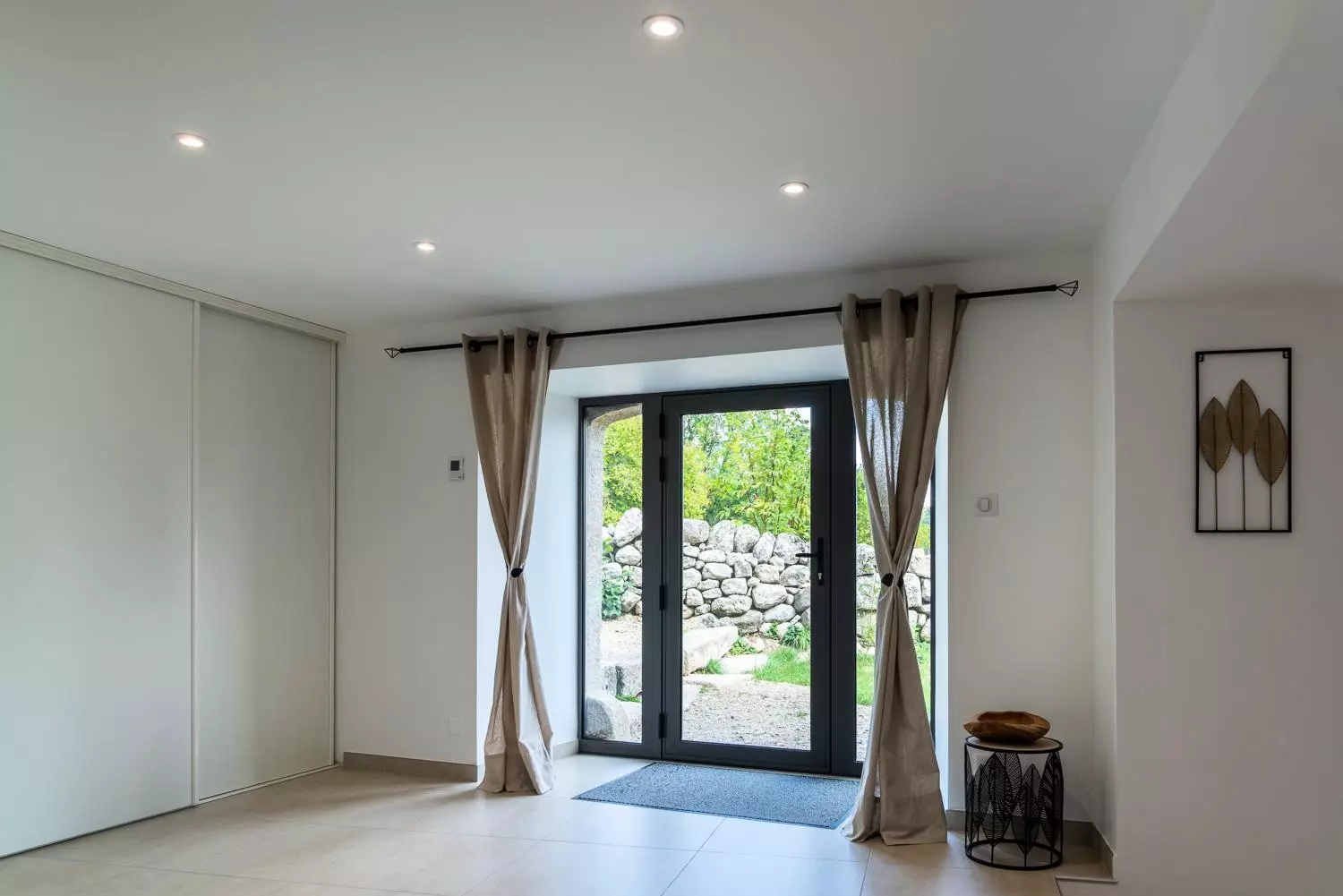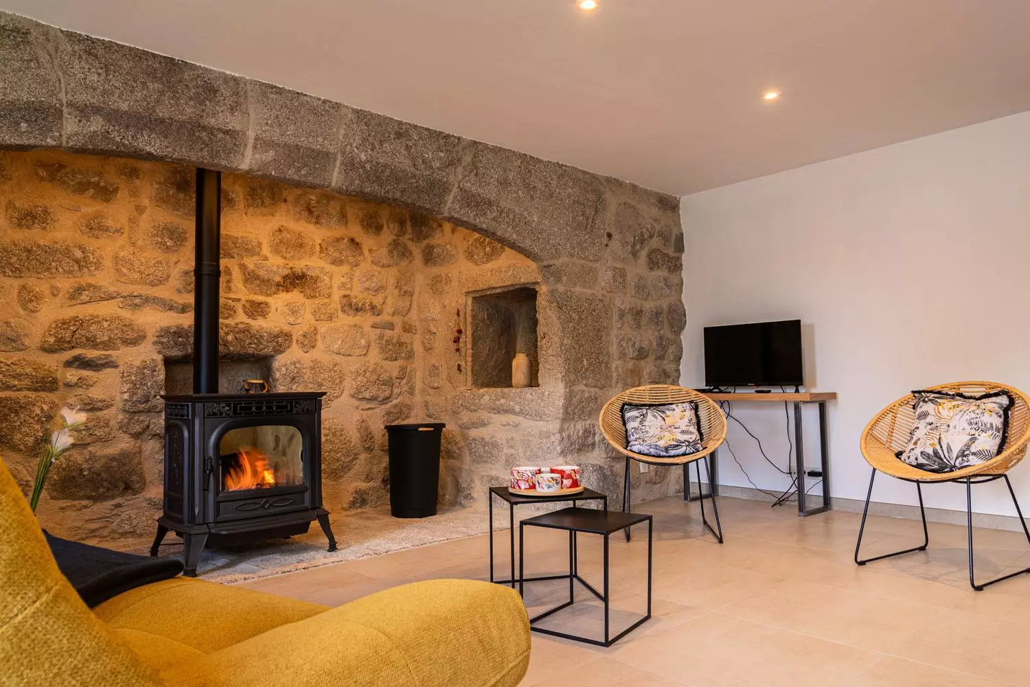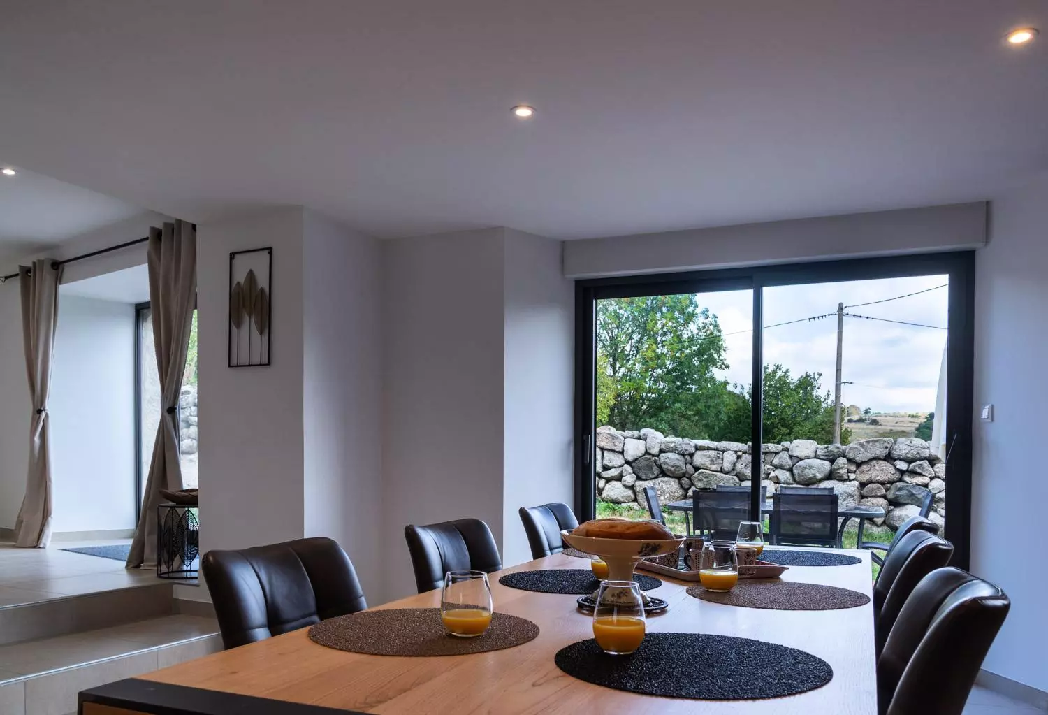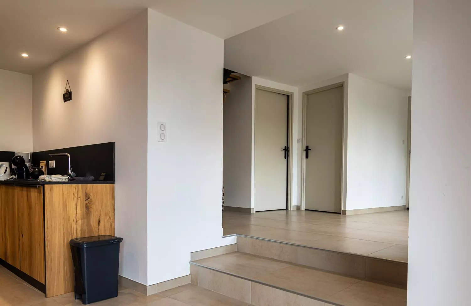 Gîte totalement indépendant de 120 m² : au rez-de-chaussée : grand séjour lumineux avec coin cuisine entièrement équipée, poêle à granulés, TV, 1 WC indépendant. La pièce principale donne sur la la terrasse.