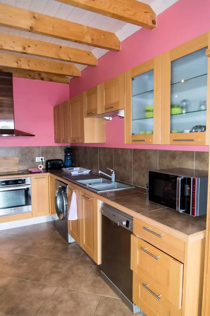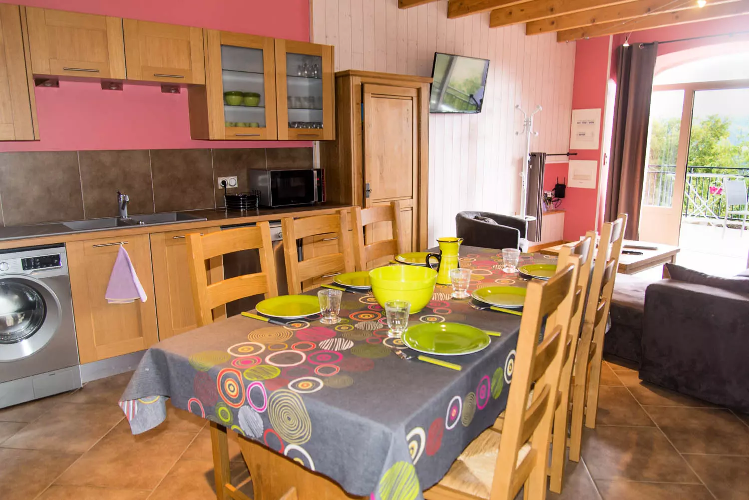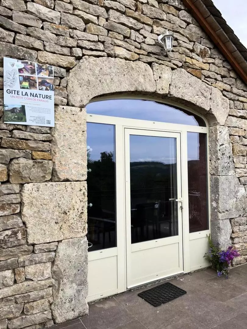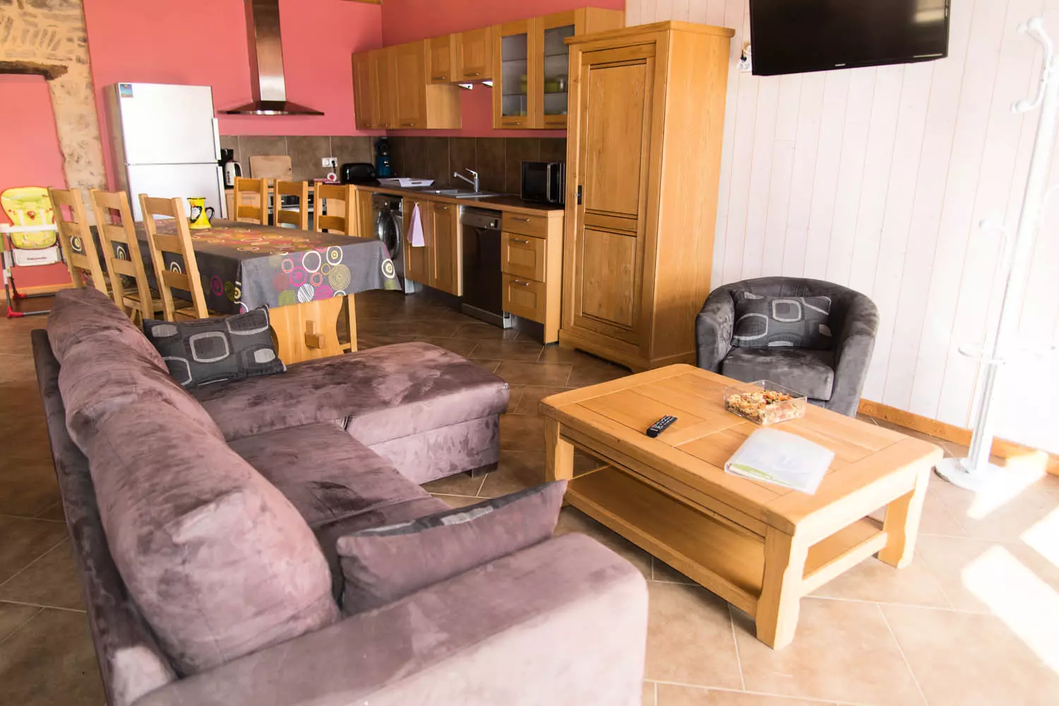 Au RDC : l'entrée du gîte "La Nature" par la terrasse exposée Est donne sur un salon/séjour avec télévision, et une cuisine équipée (lave-linge, micro-ondes, réfrigérateur/congélateur, lave-vaisselle, plaque induction, four).