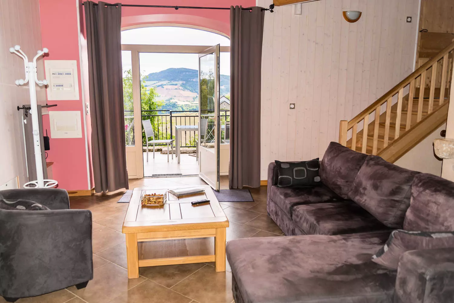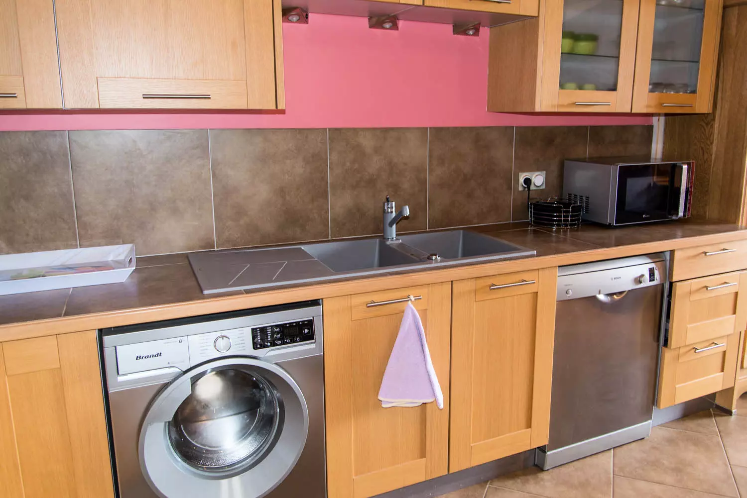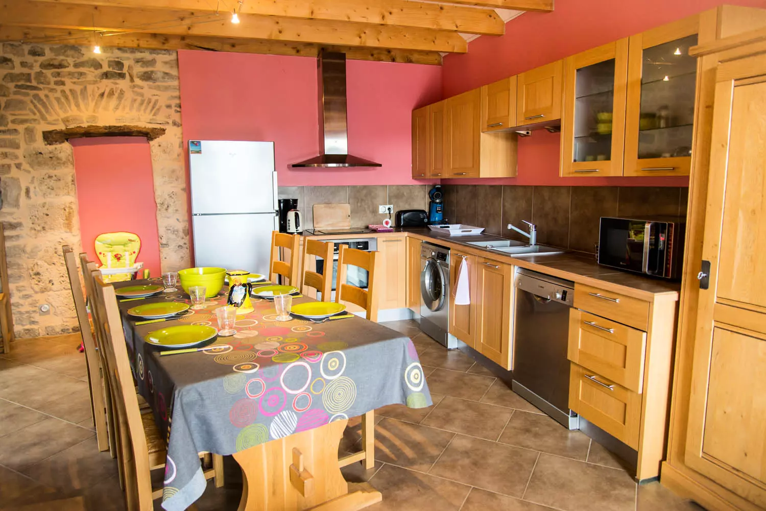 Au RDC : l'entrée du gîte "La Nature" par la terrasse exposée Est donne sur un salon/séjour avec télévision, et une cuisine équipée (lave-linge, micro-ondes, réfrigérateur/congélateur, lave-vaisselle, plaque induction, four).
