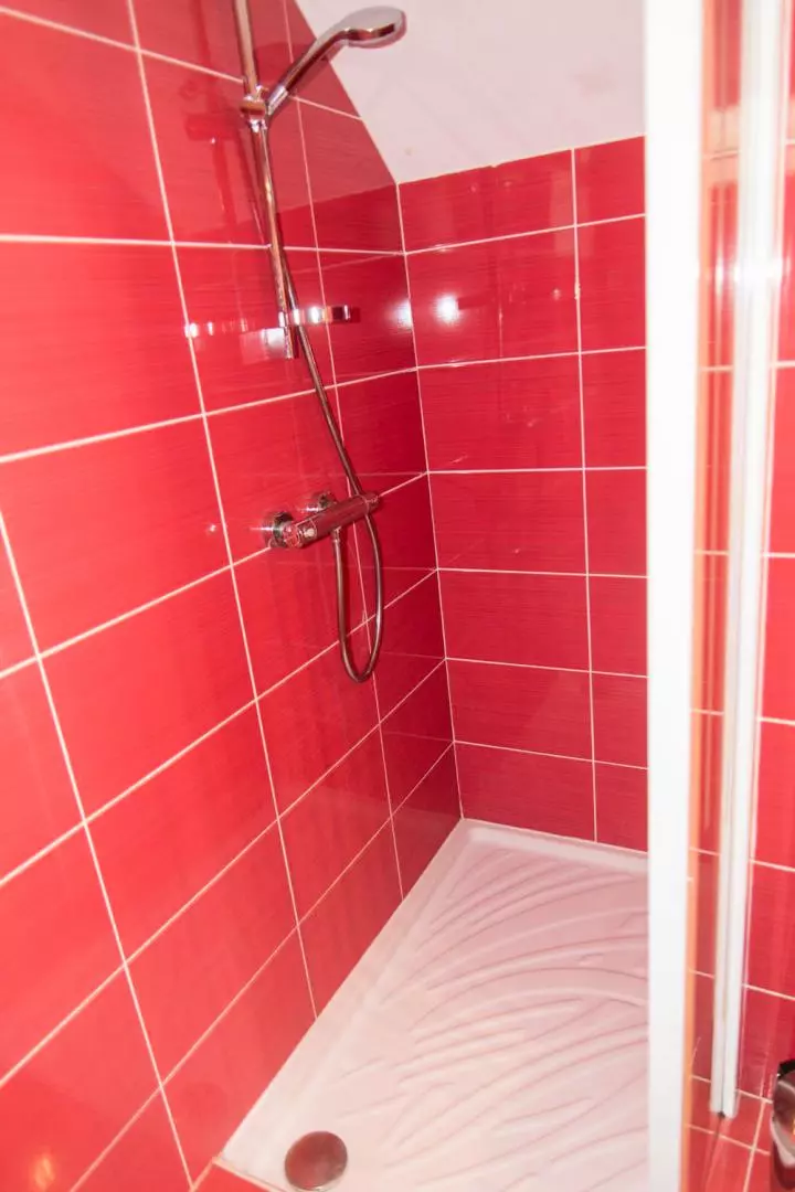 A demi-niveau supérieur : du salon, accès par quelques marches à une chambre avec 1 lit en 160, salle d'eau avec douche et wc.