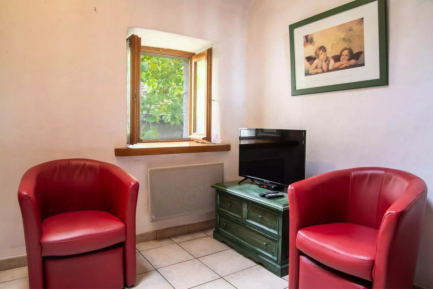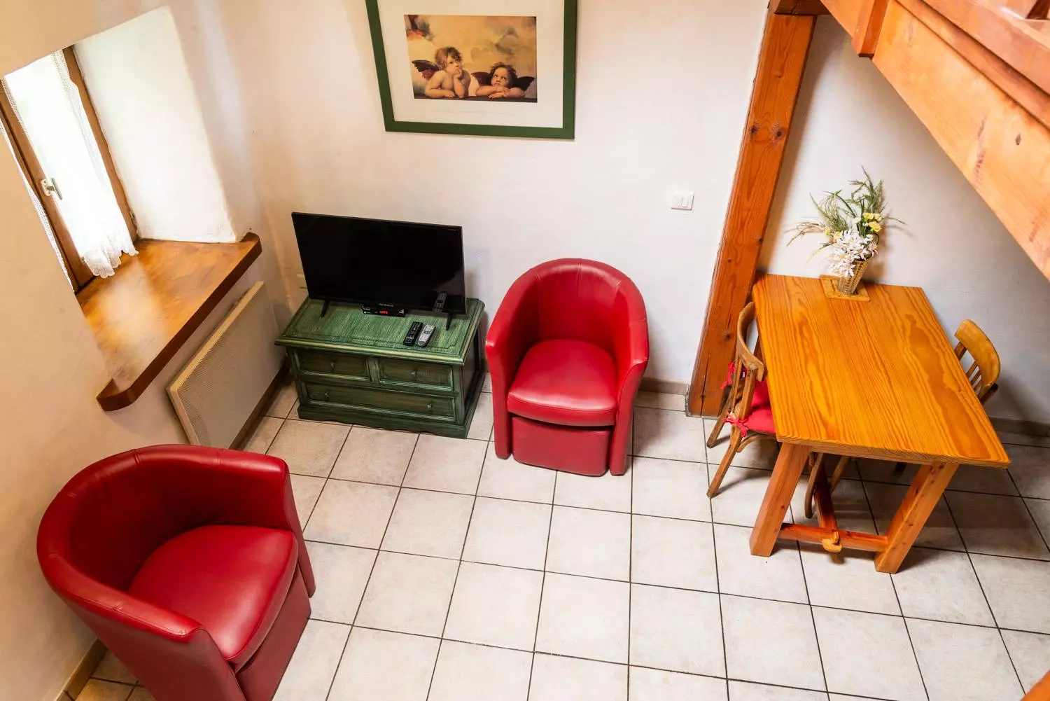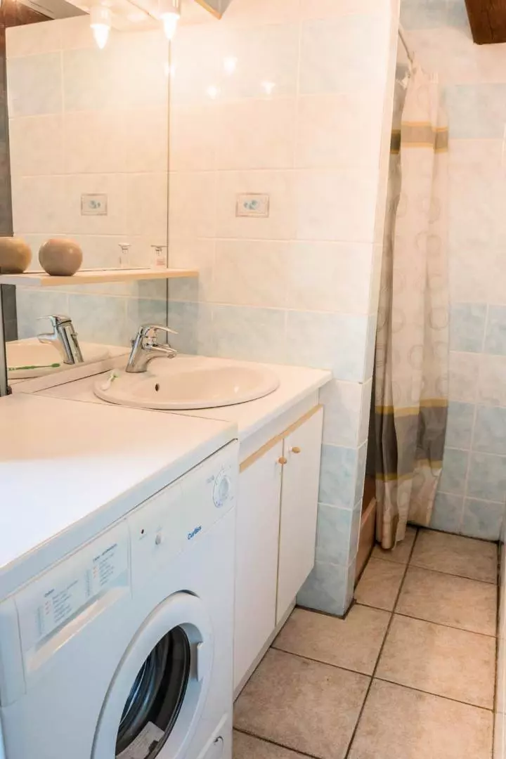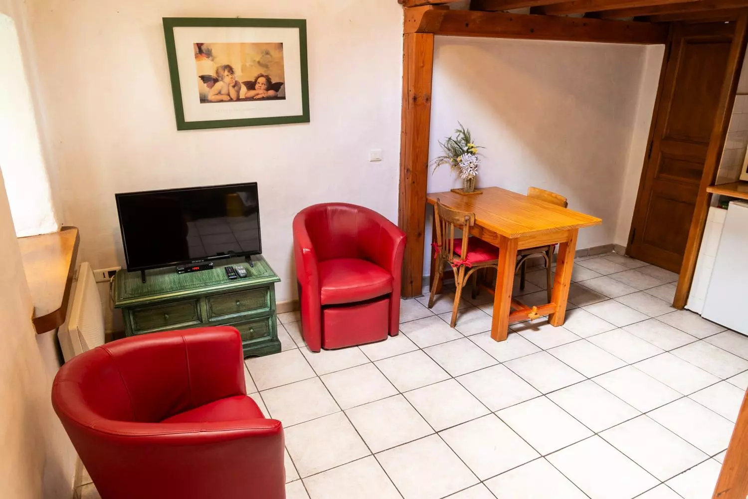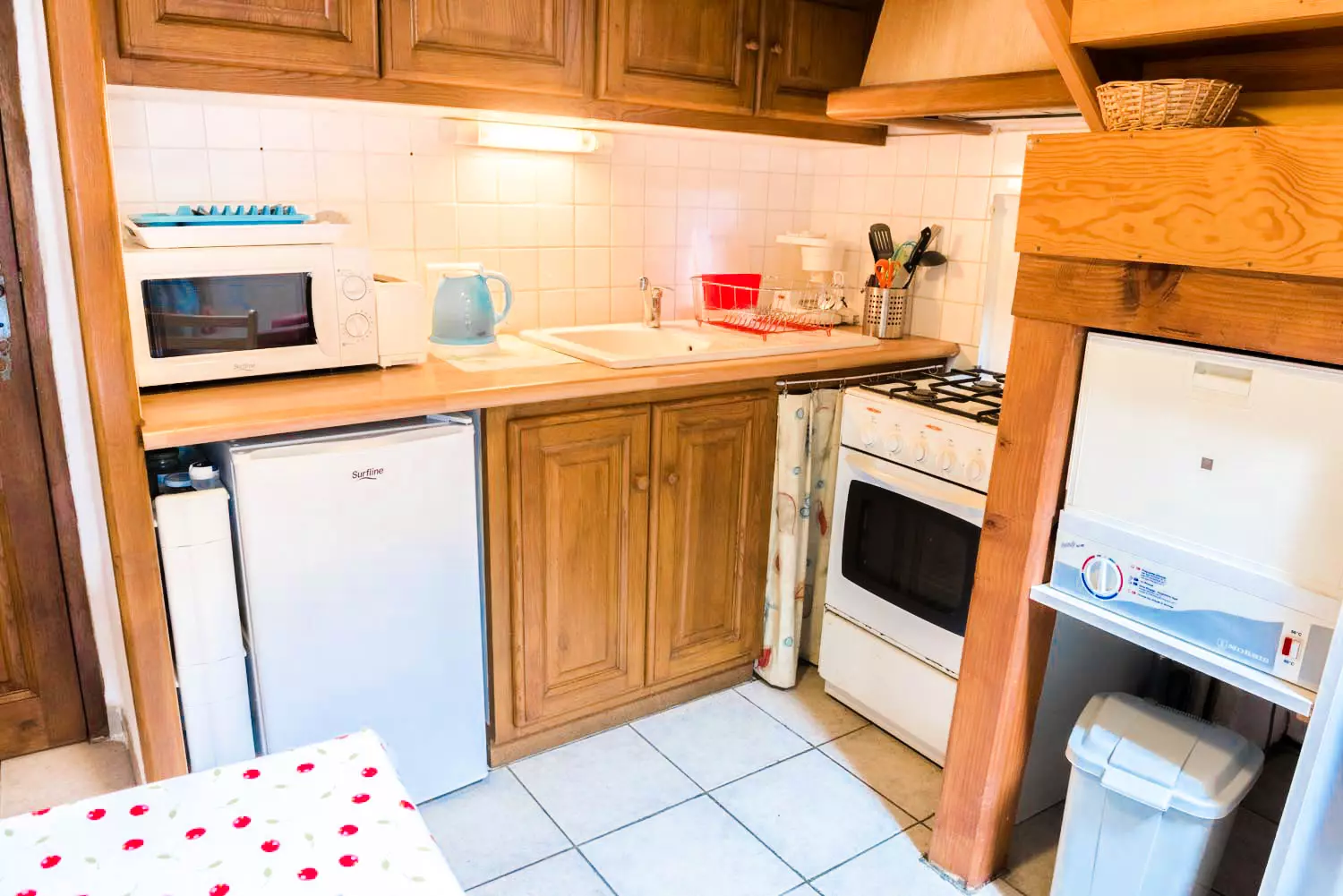 Au rez-de-chaussée : Séjour (télévision) avec coin cuisine équipée (micro-ondes, réfrigérateur, gazinière avec four), salle de d'eau avec WC et lave-linge.