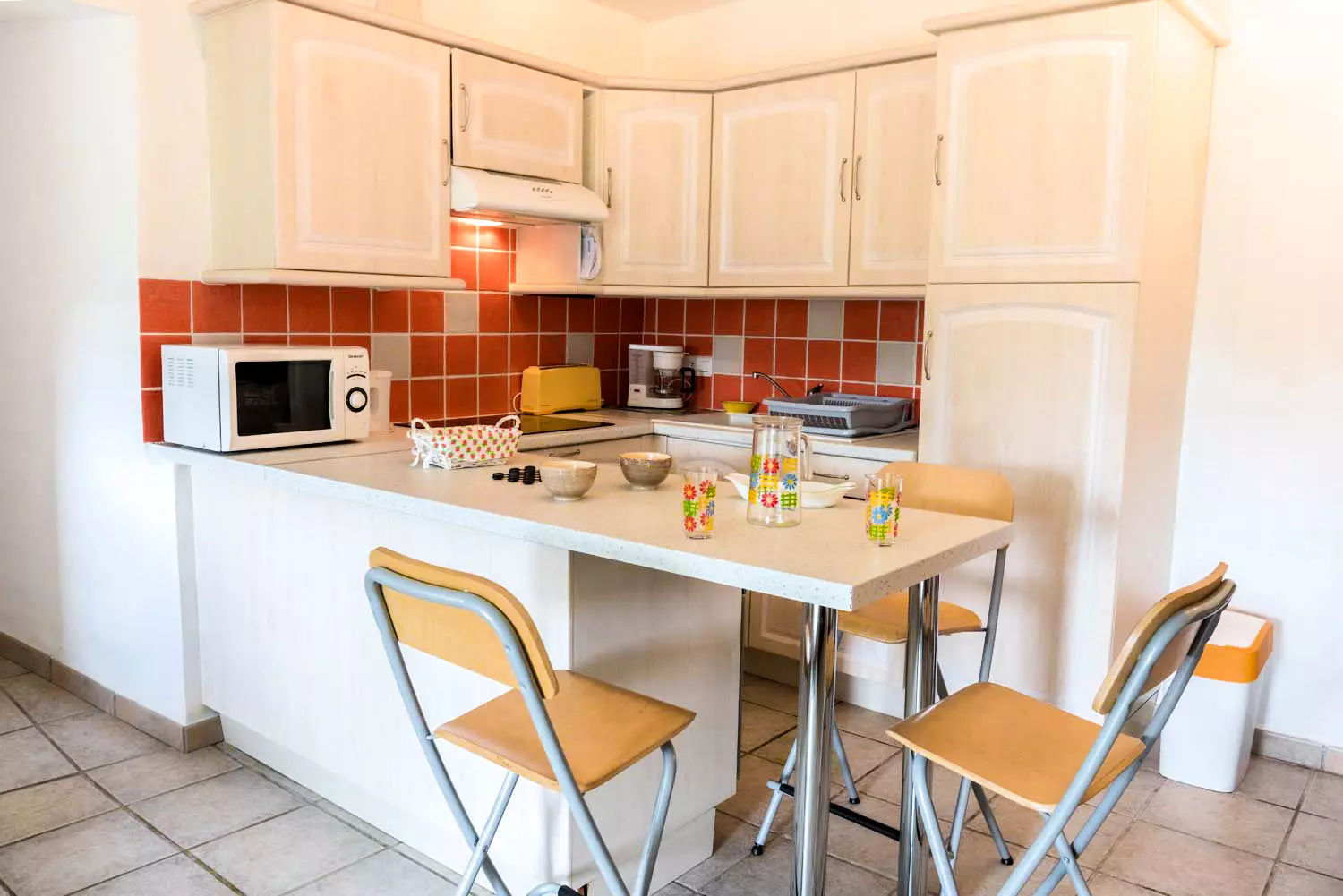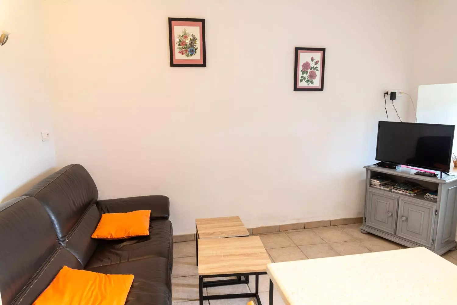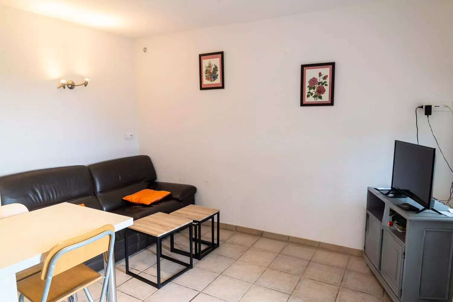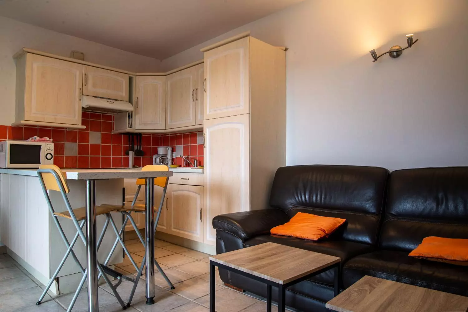 Séjour (télévision, canapé fixe) avec coin cuisine équipée (micro-ondes, frigo/congélateur, four électrique, plaques à induction), salle d'eau avec WC (lave-linge), 1 chambre (1 lit 2 places).