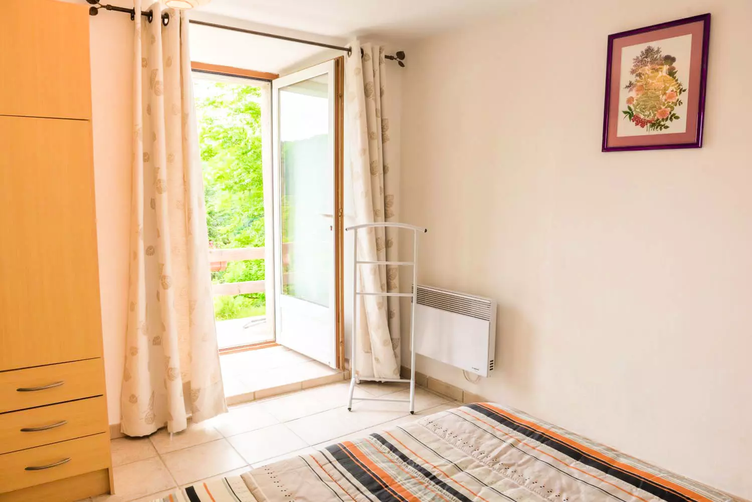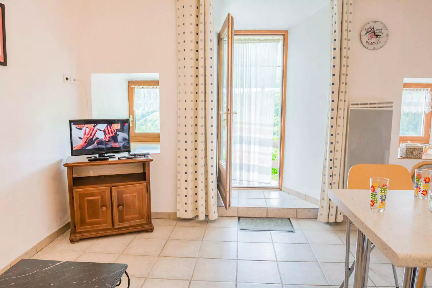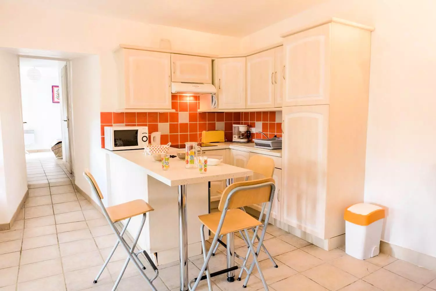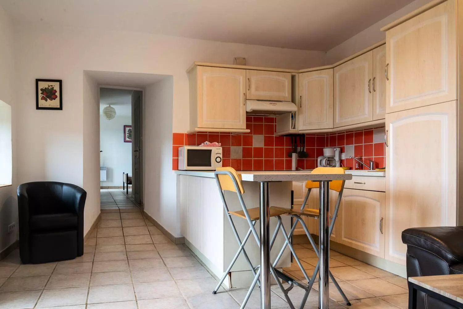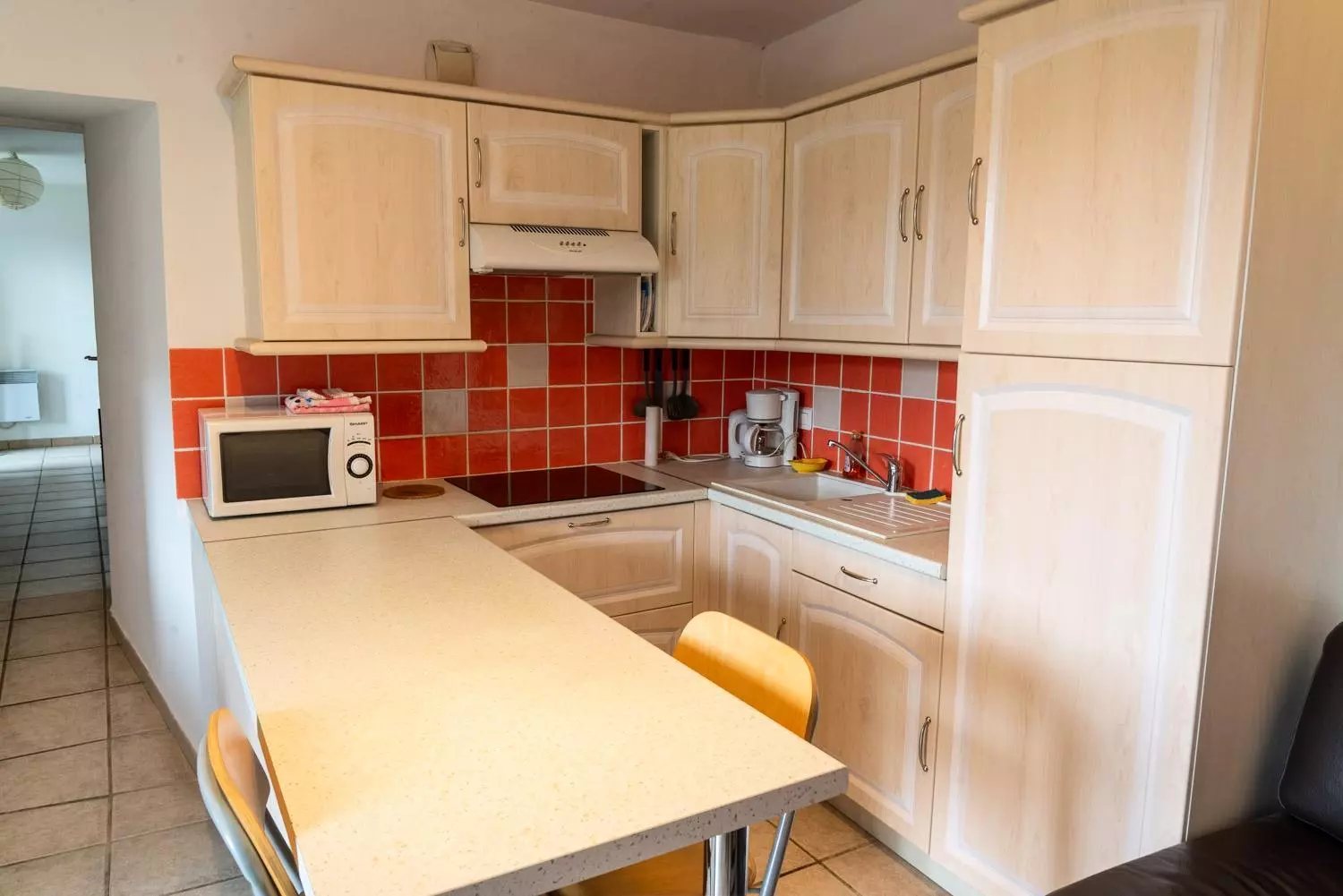 Séjour (télévision, canapé fixe) avec coin cuisine équipée (micro-ondes, frigo/congélateur, four électrique, plaques à induction), salle d'eau avec WC (lave-linge), 1 chambre (1 lit 2 places).