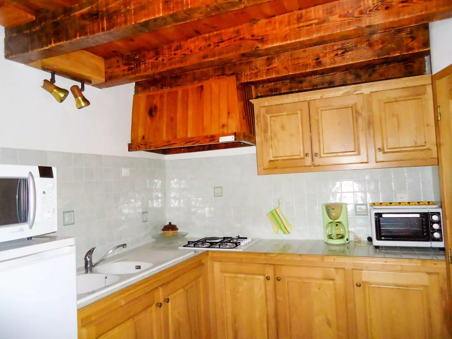 Séjour (canapé, télévision), coin cuisine (réfrigérateur, plaque de cuisson avec 1 feu électrique et 3 feux gaz, micro-ondes, mini four).