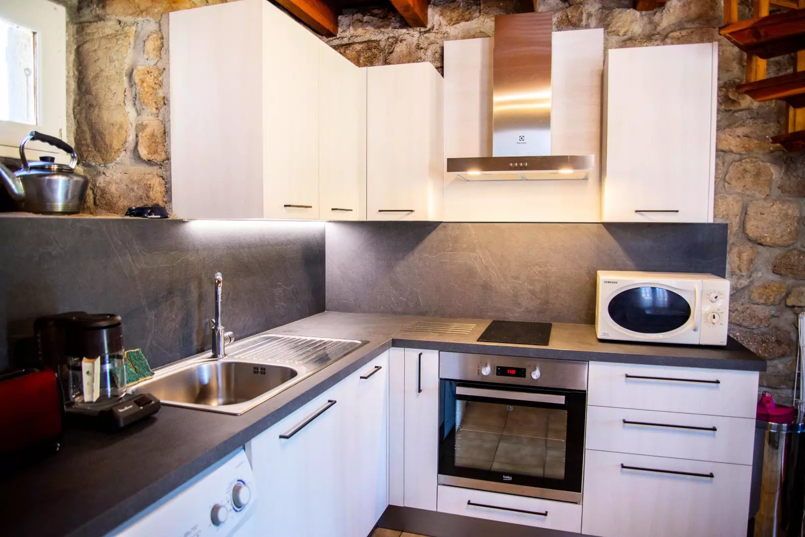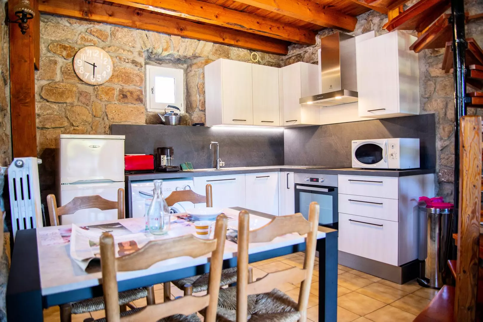 Au rez de chaussée : séjour (cheminée avec insert, télévision), coin cuisine (lave-vaisselle, réfrigérateur/congélateur, cafetière électrique, four, micro-ondes, lave-linge).