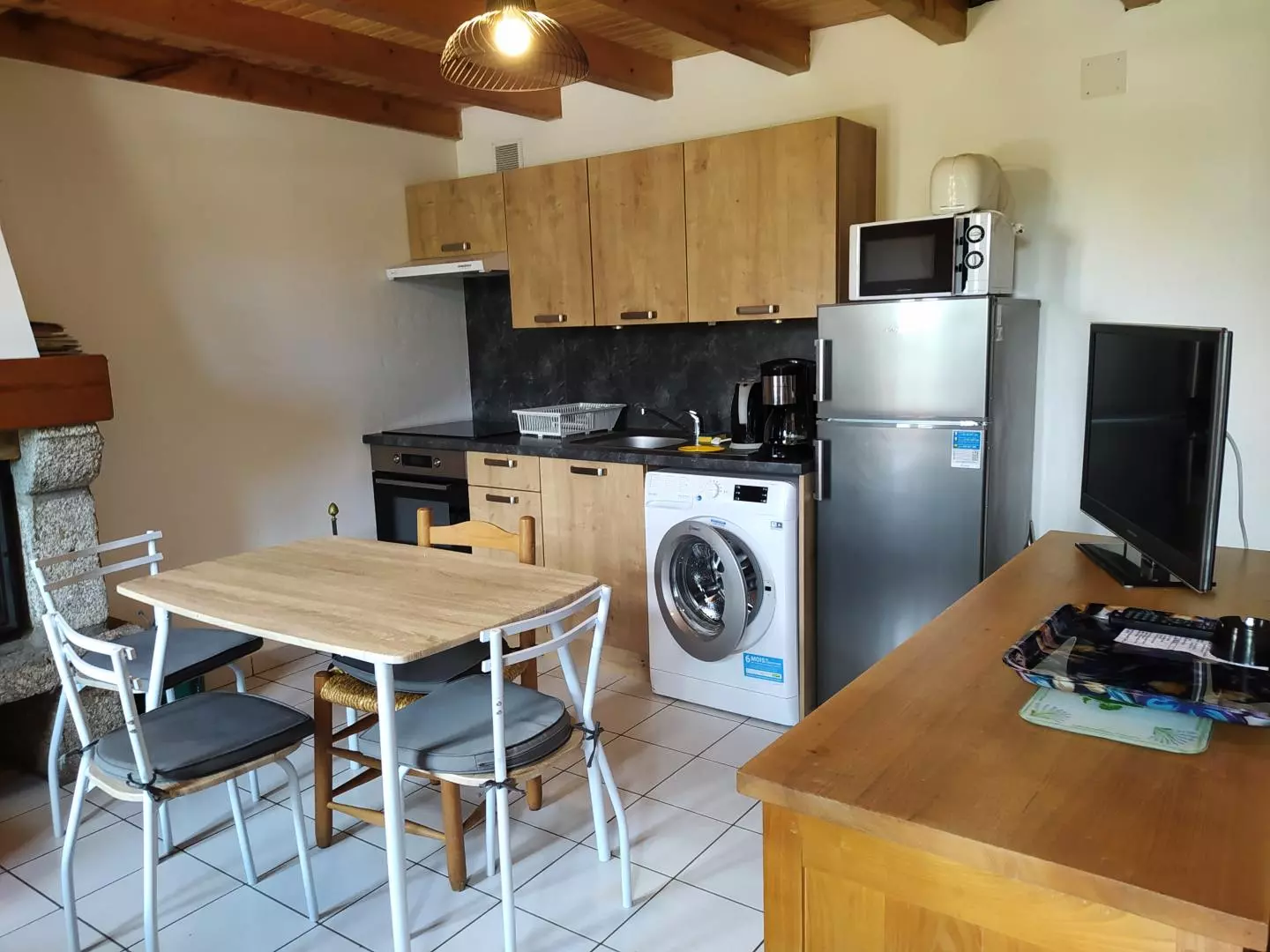 Au rez de chaussée : salle de séjour (cheminée insert, télévision), coin cuisine (réfrigérateur, cuisinière à gaz, four électrique), WC.