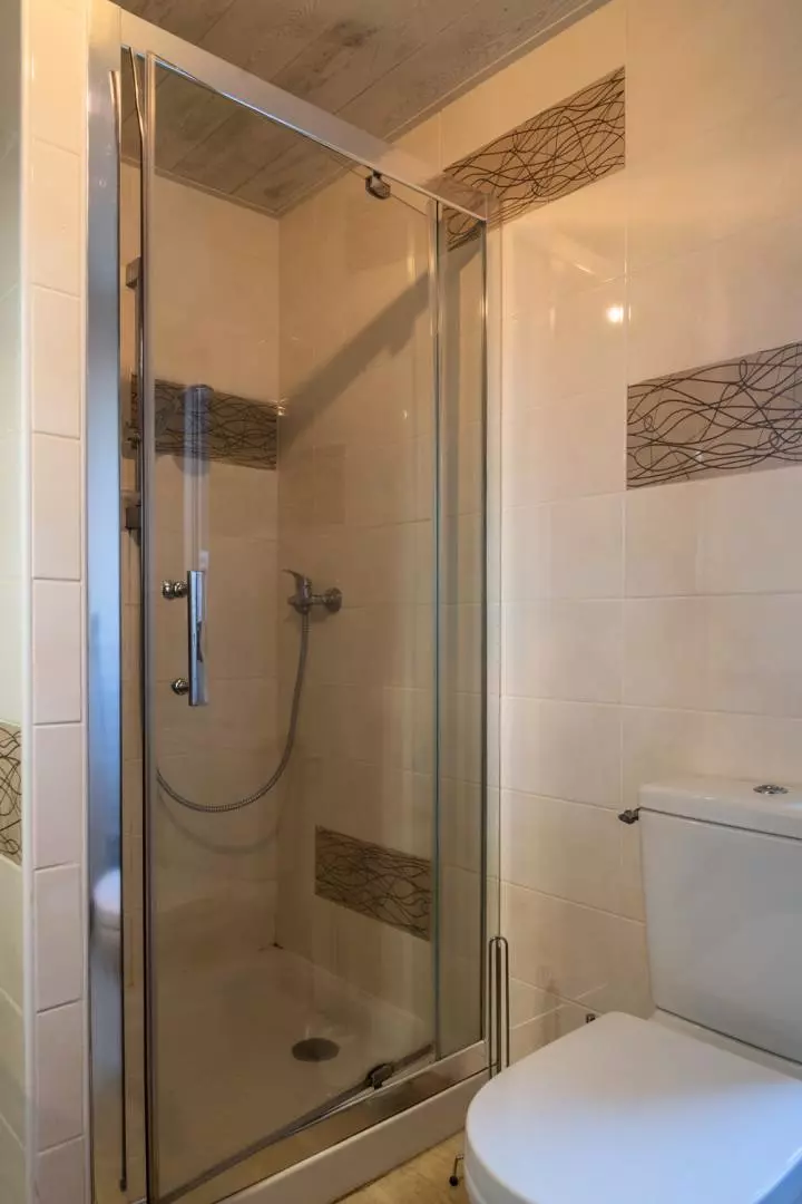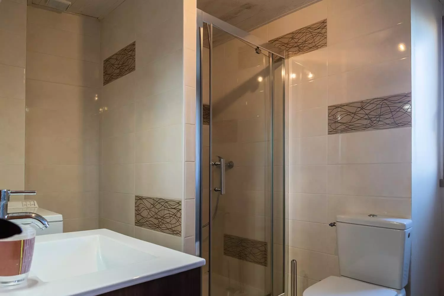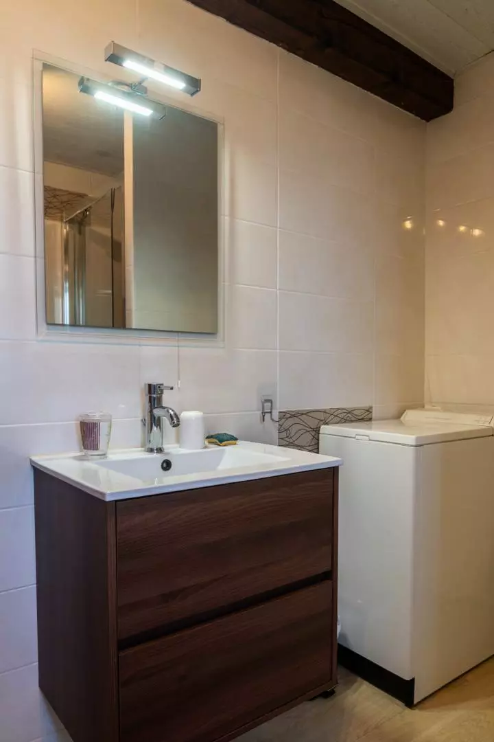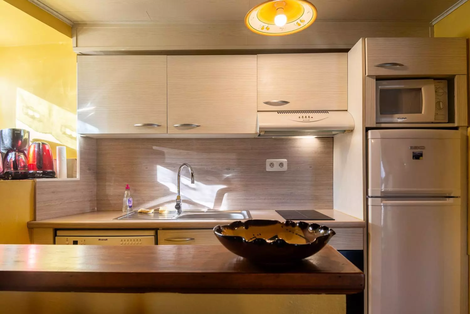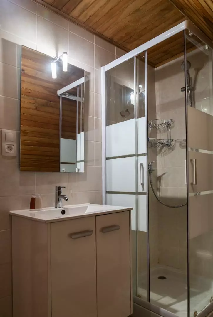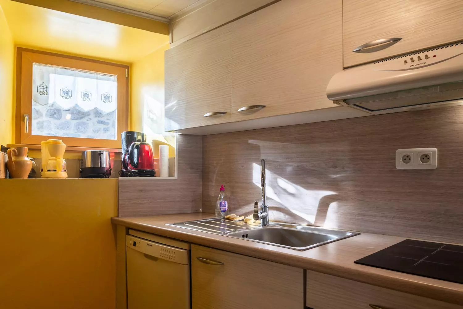 Rez-de-chaussée : séjour avec télévision et cheminée (bois non fourni), coin cuisine (réfrigérateur/congélateur, plaque et four électrique, micro-ondes, lave-linge, lave-vaisselle, service à fondue), WC.