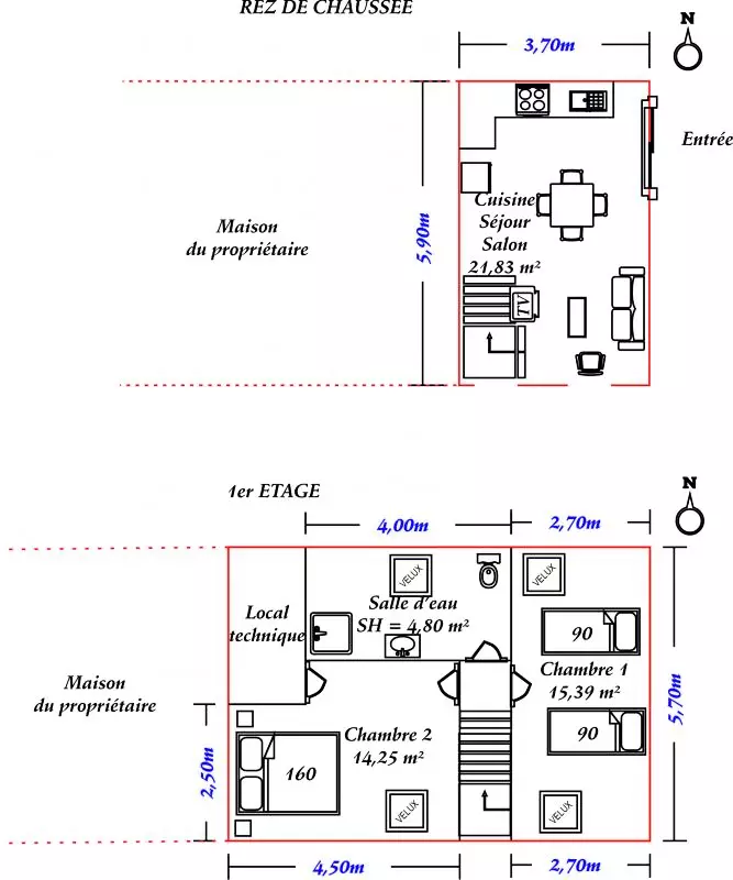 - 1 chambre (1 lit 2 personnes 160x200cm + 1 lit de 90cm),