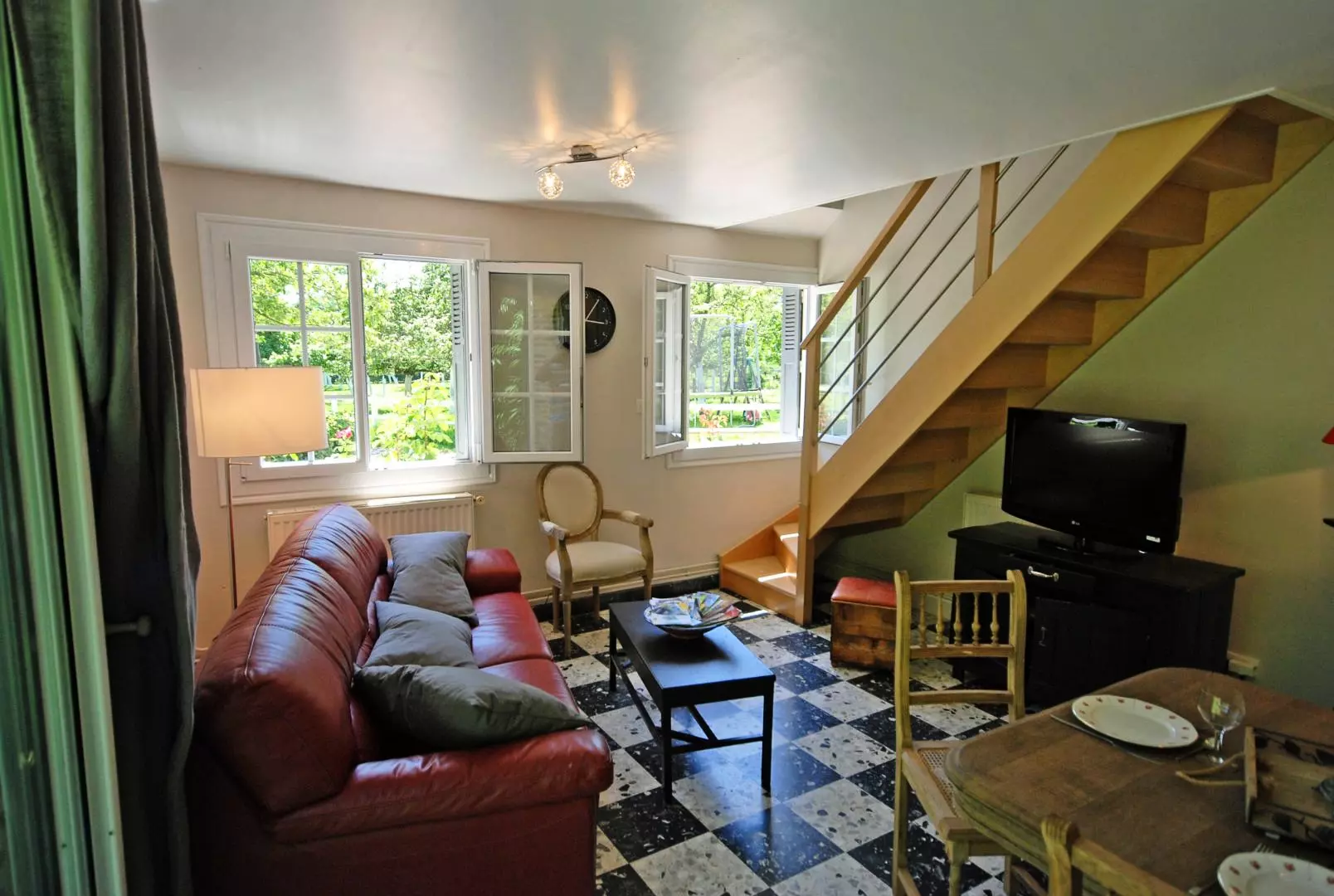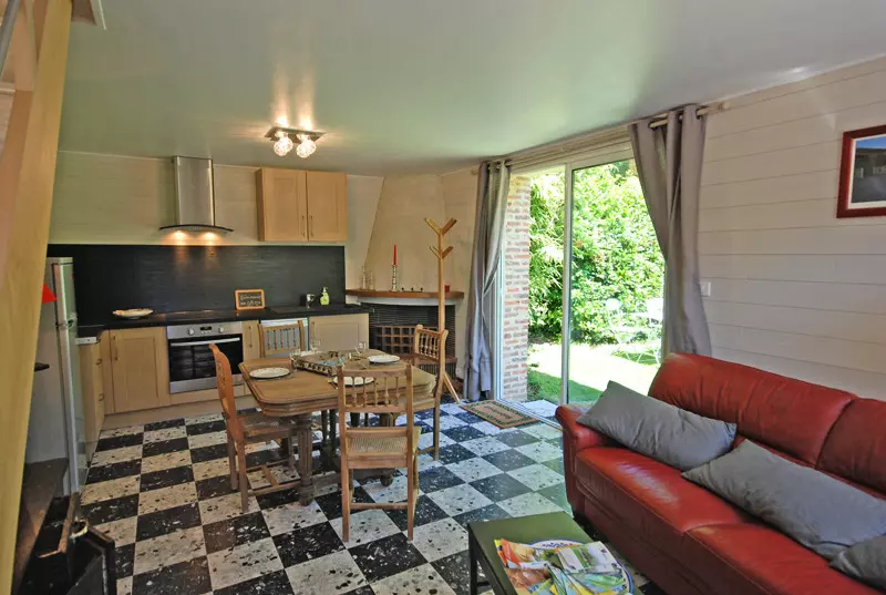 - salon/salle à manger (TV écran plat) avec poêle à pellets, et coin cuisine (plaques vitrocéramique, four, lave-vaisselle, micro-ondes, congélateur),