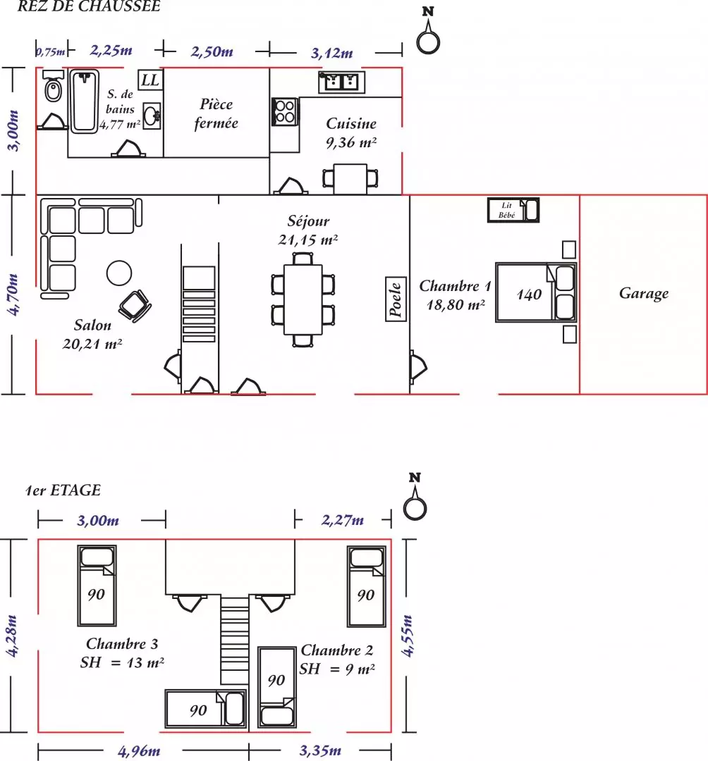 - 2 chambres (2 lits 1 personne 90 x 190 cm).