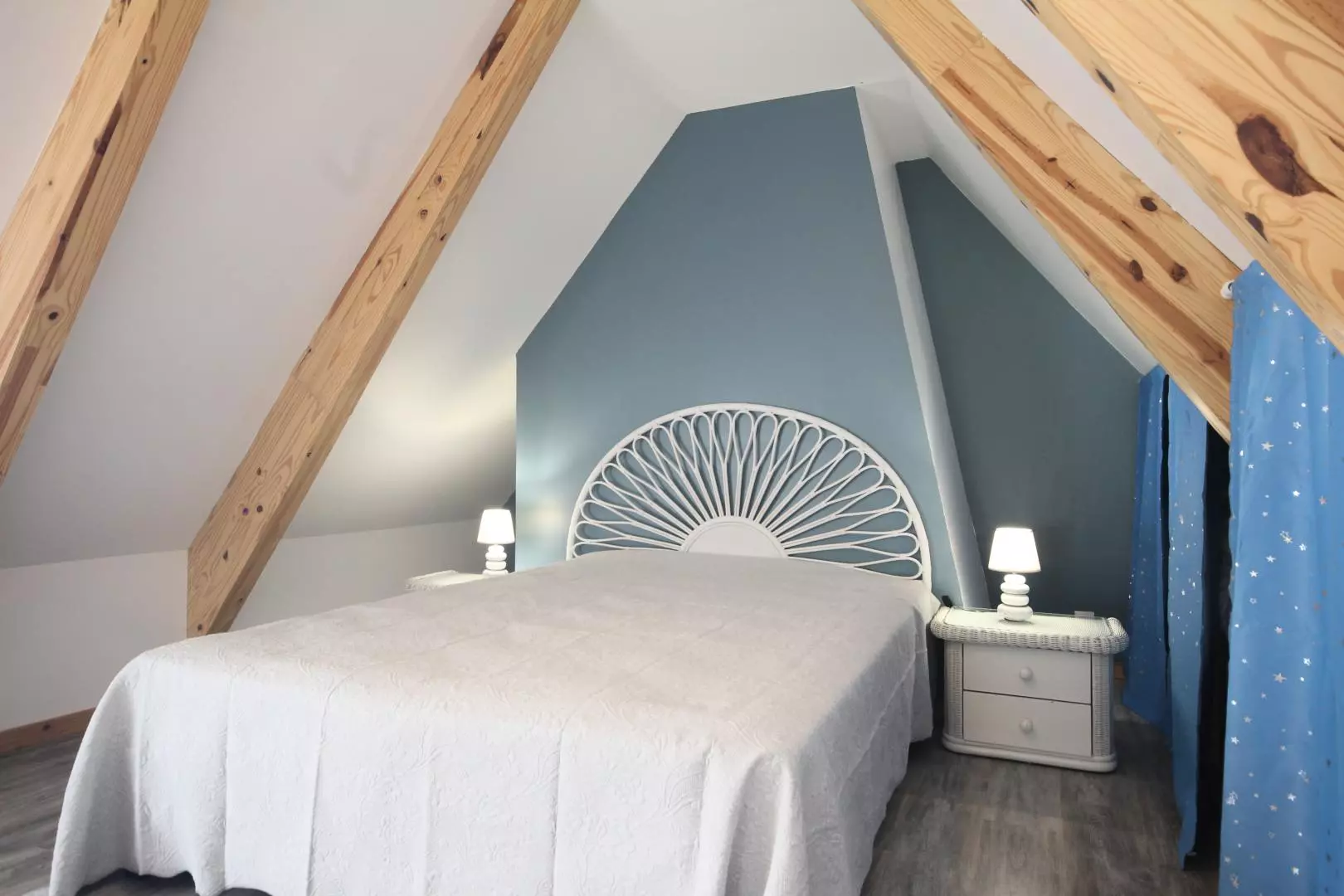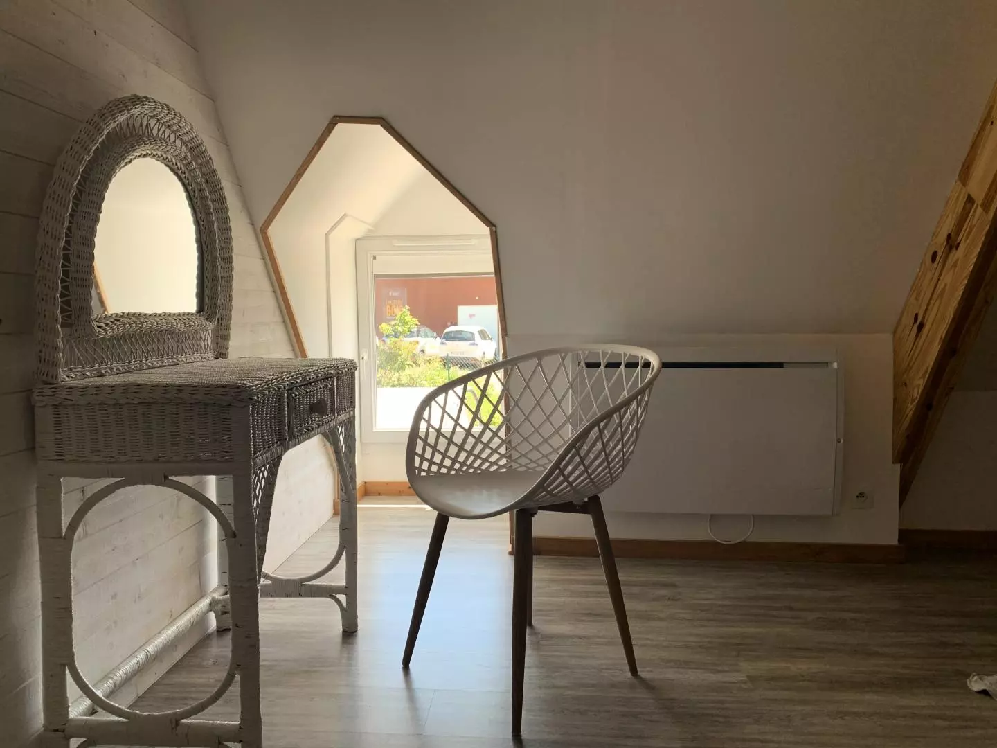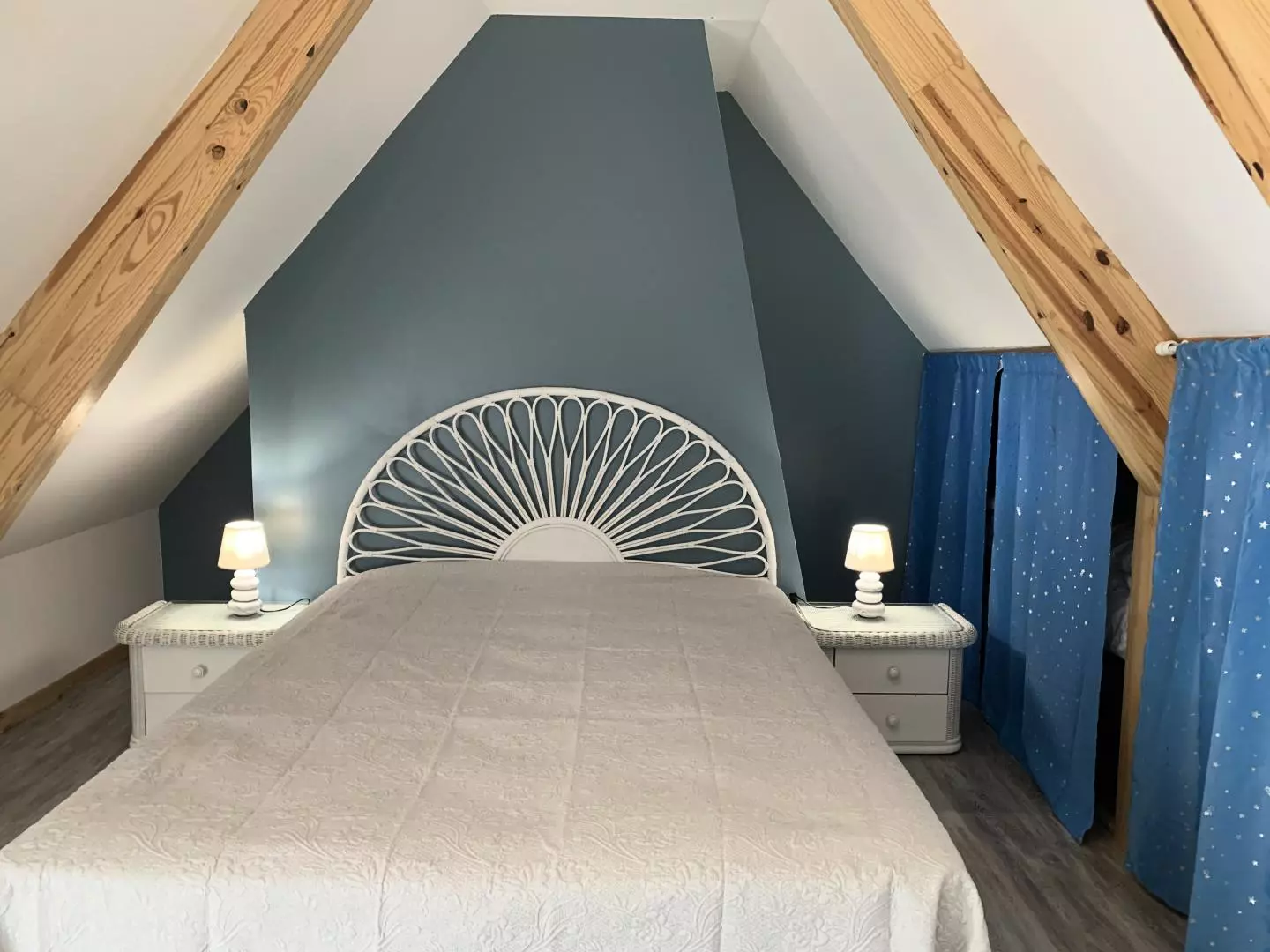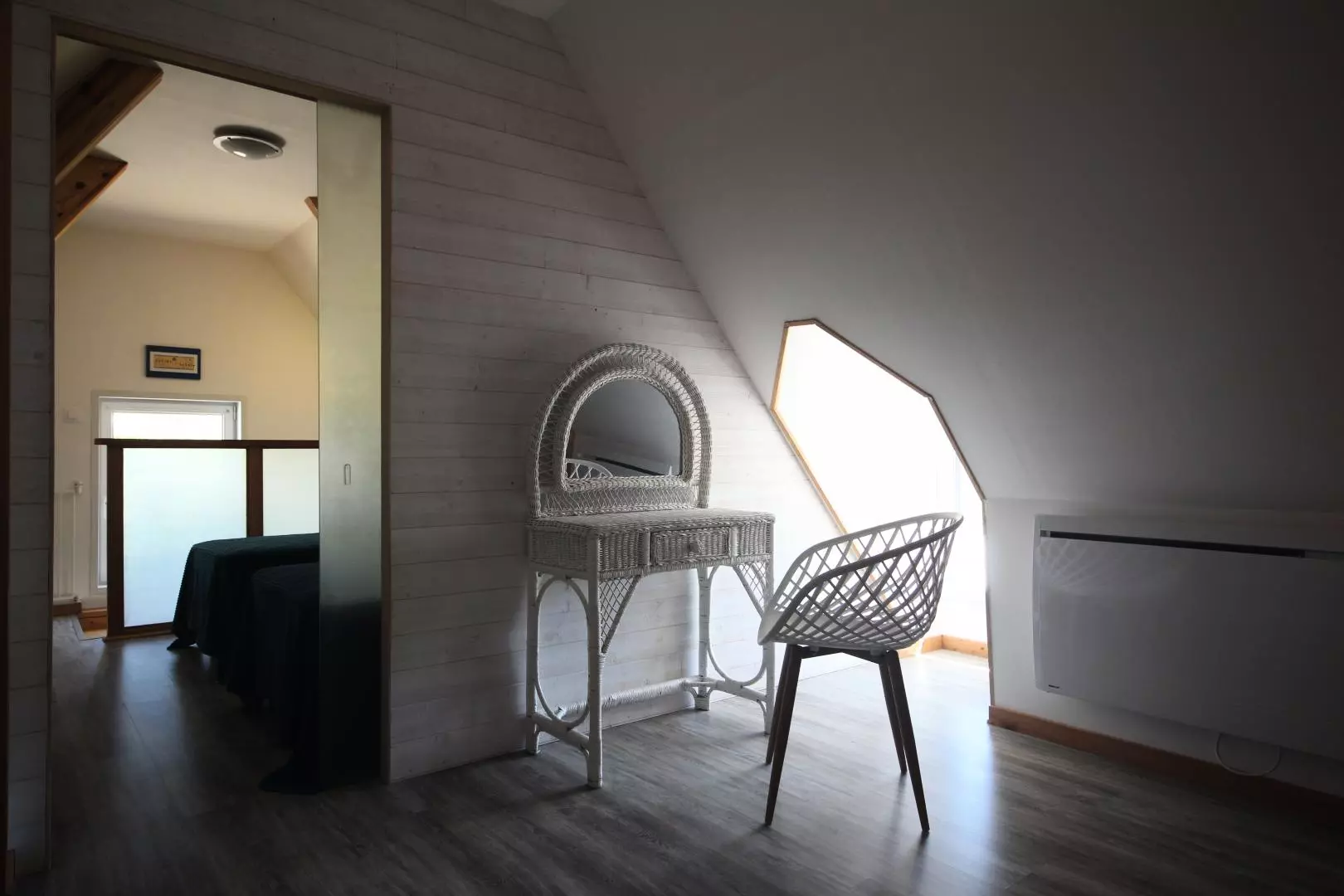 - en enfilade de la 1ère chambre : 1 chambre mansardée avec 1 lit 2 personnes 160x200cm, coiffeuse.