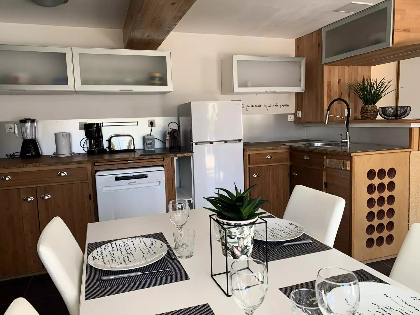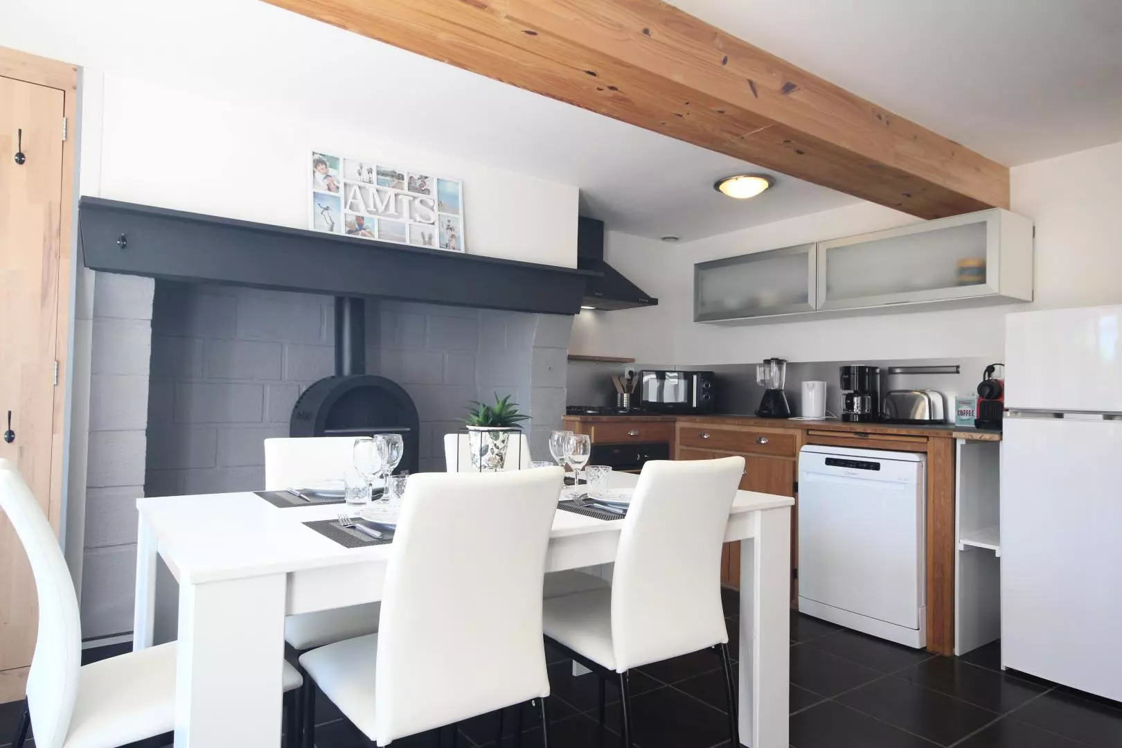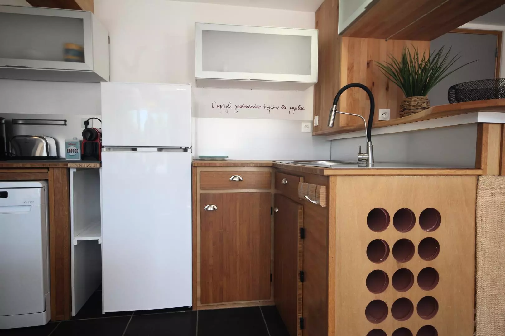 - cuisine ouverte équipée (micro-ondes, four, réfrigérateur/congélateur, lave-vaisselle, cafetière Nespresso...),