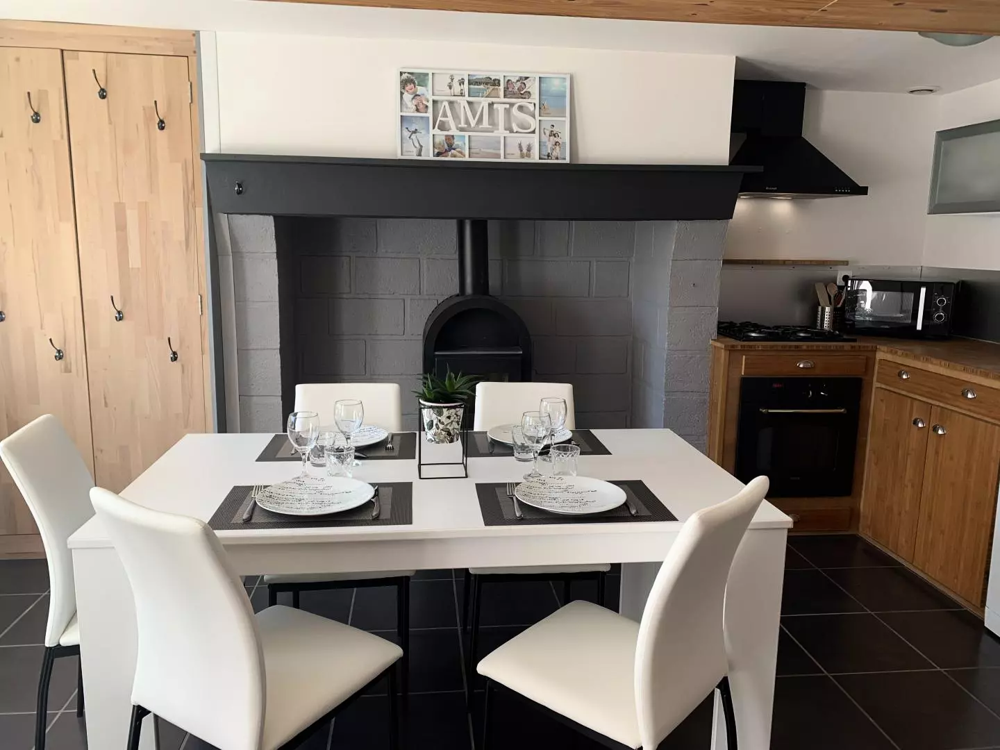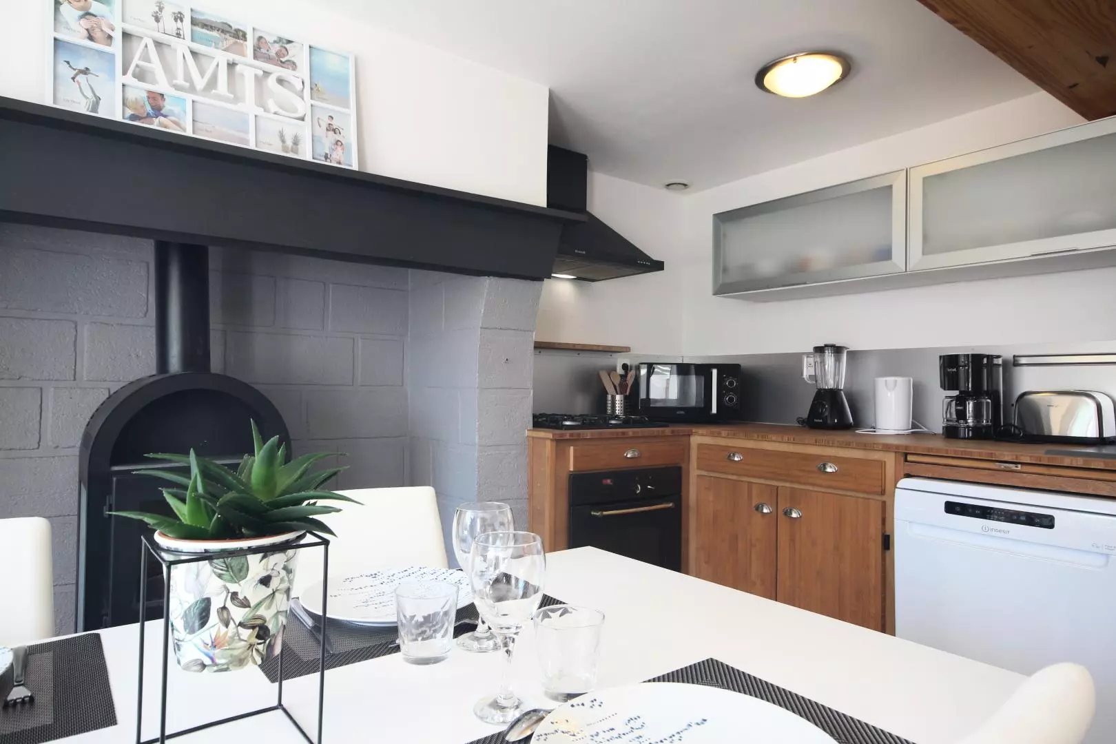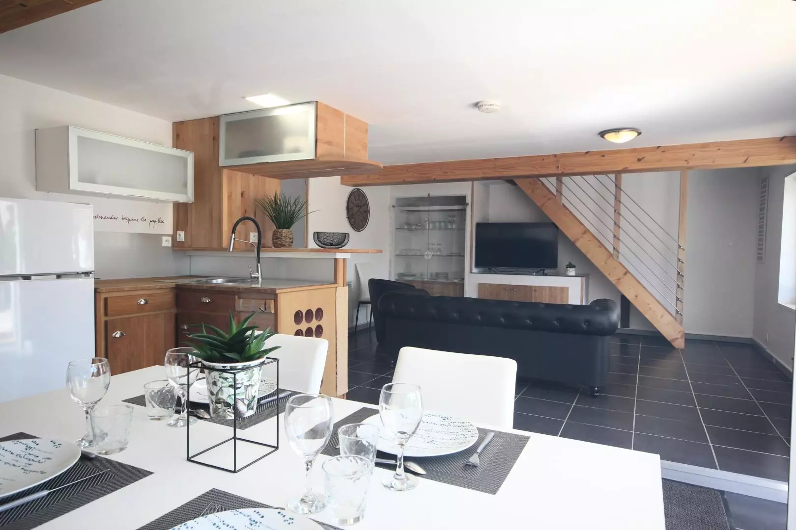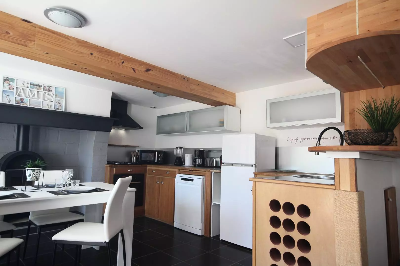 - cuisine ouverte équipée (micro-ondes, four, réfrigérateur/congélateur, lave-vaisselle, cafetière Nespresso...),