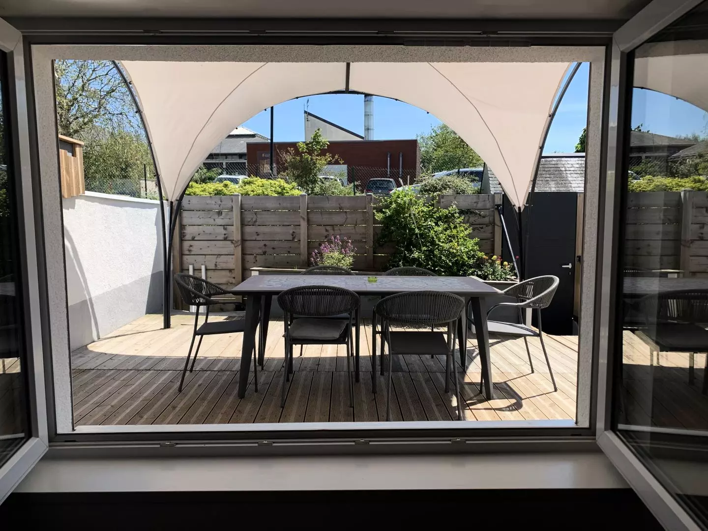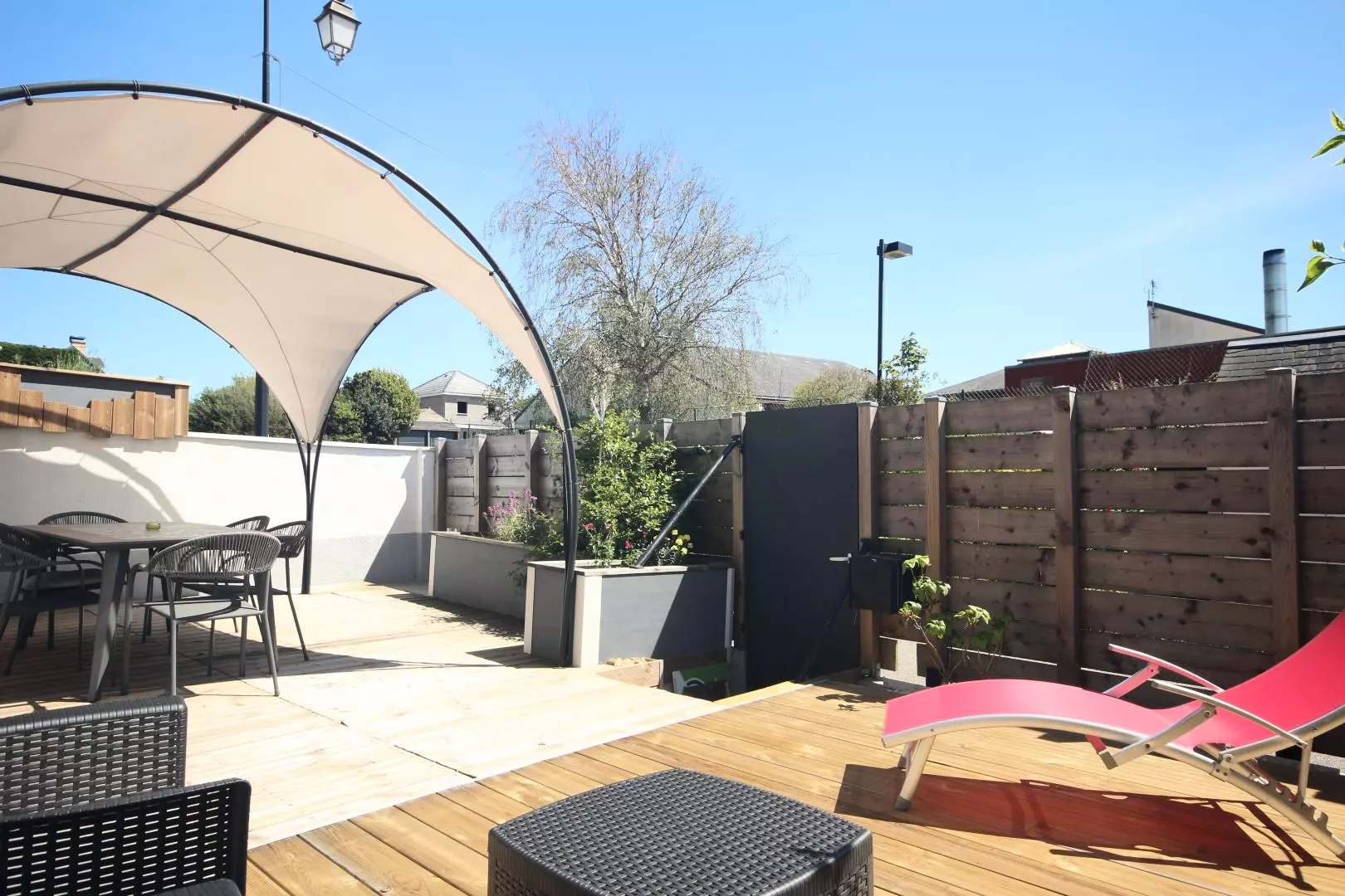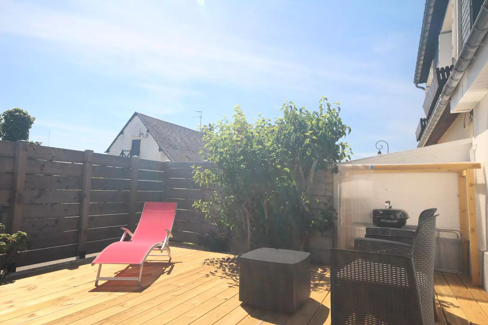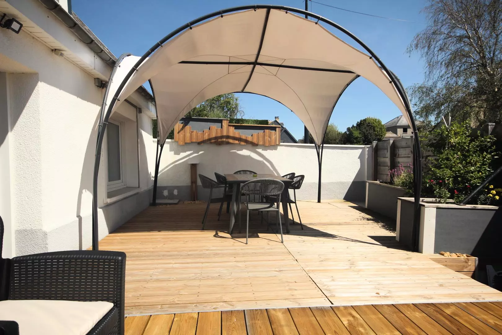 - terrasse avec tonnelle, salon de jardin, barbecue, bains de soleil.