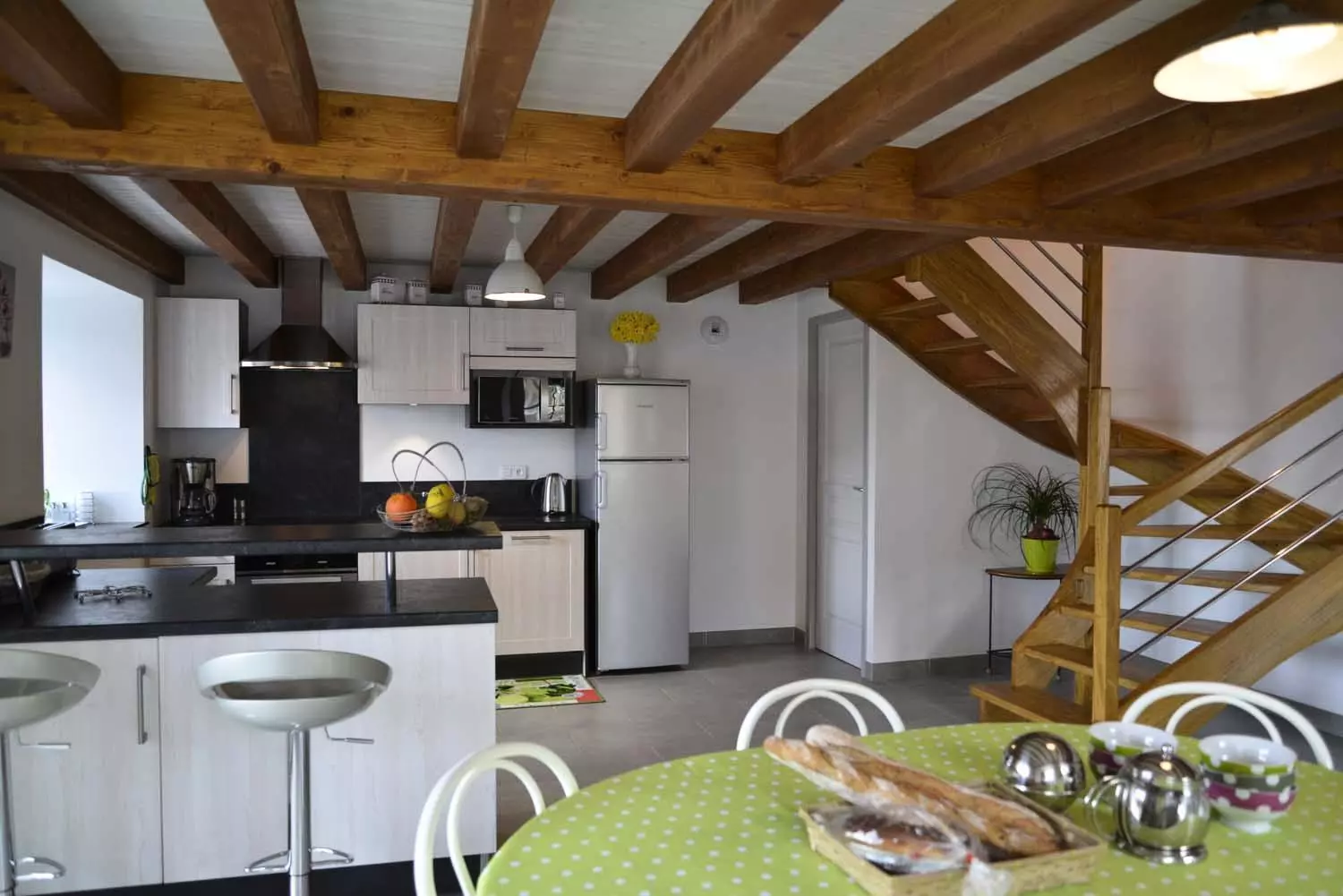 Au rez de chaussée : cuisine entièrement aménagée (lave-vaisselle, micro-ondes, réfrigérateur/congélateur), salle à manger et salon avec chauffage au sol et poêle à bois, télévision, accès WIFI, buanderie (lave-linge) avec WC indépendant.