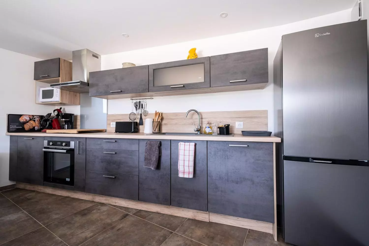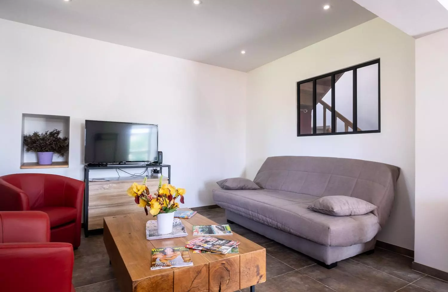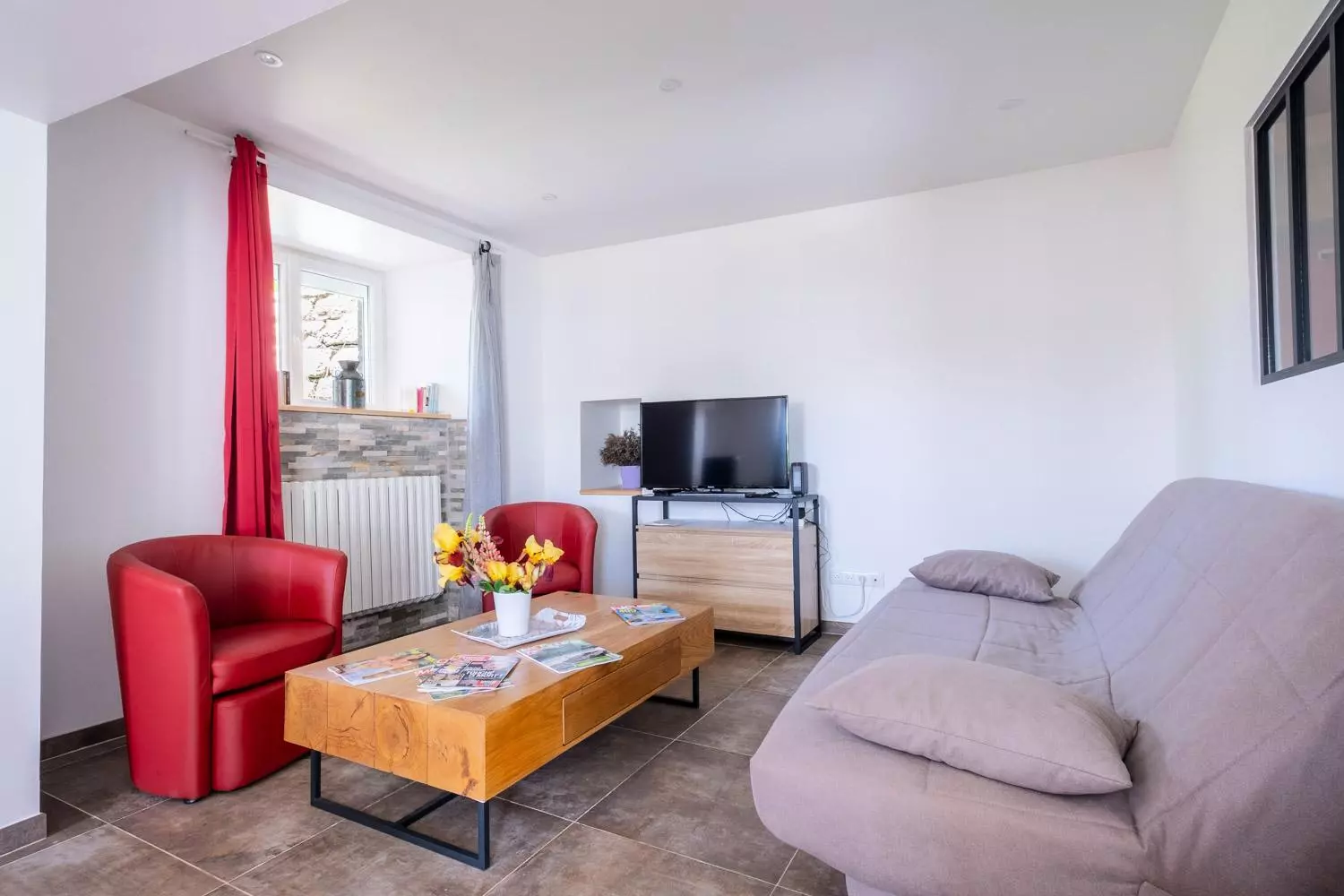 Au rez-de-chaussée, vous trouverez une cuisine entièrement équipée, un grand salon avec un canapé convertible deux places et un poêle à granulés, une salle d'eau (avec lave-linge et sèche-linge) et un wc indépendant.
