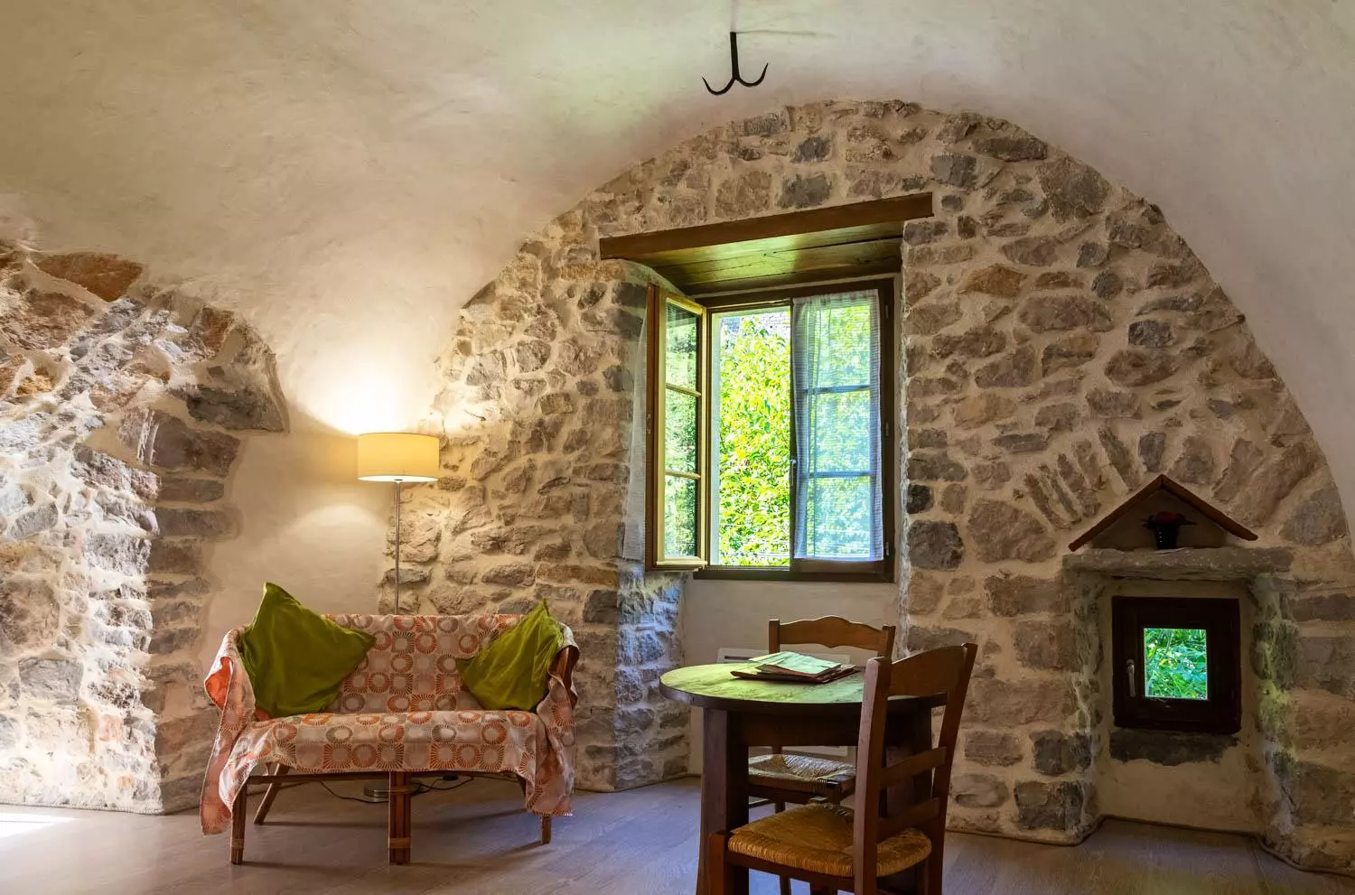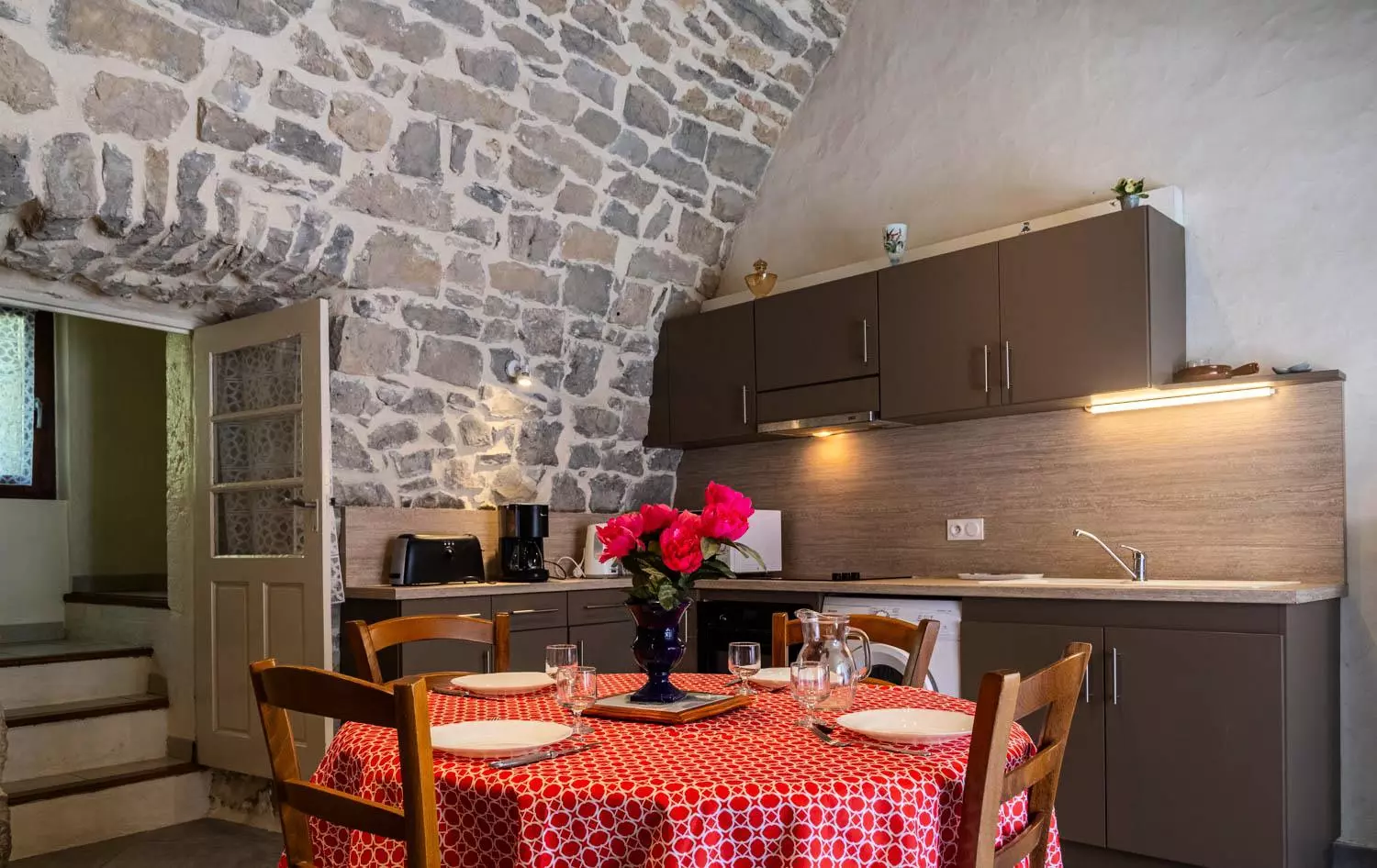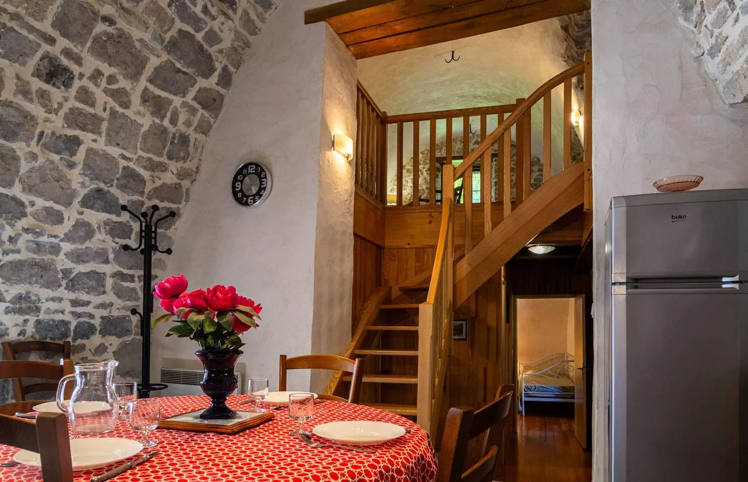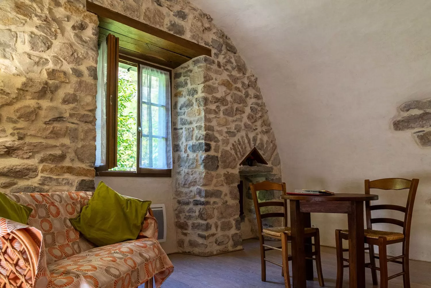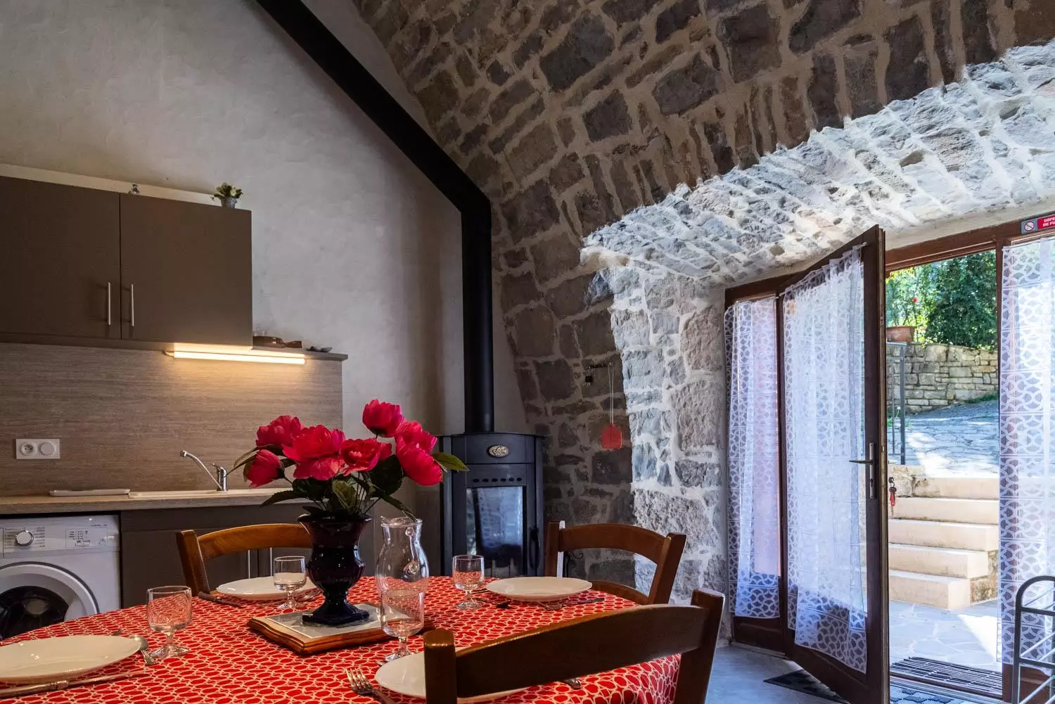 Au rez-de-chaussée : salle à manger voûtée (poêle à bois) avec cuisine équipée (réfrigérateur, congélateur, 3 plaques électriques, micro-ondes, lave-vaisselle, four), 1 chambre (1 lit 2 places), 1 chambre (1 lit 2 places et 1 lit 1 place), salle d'eau, WC.