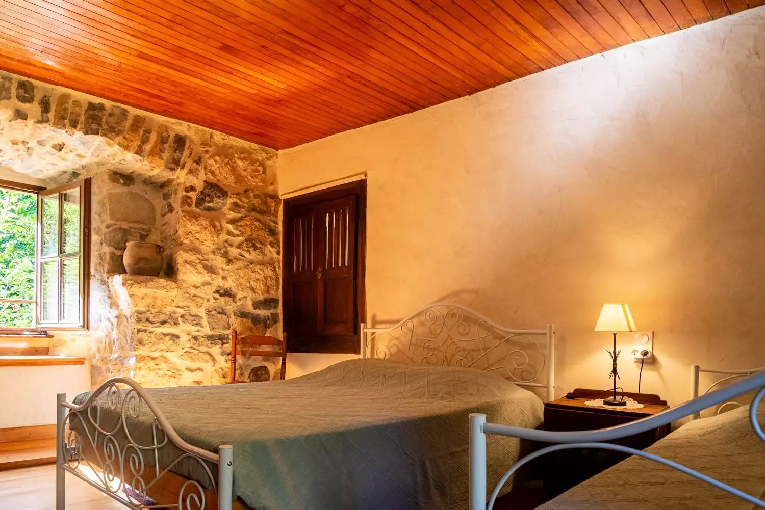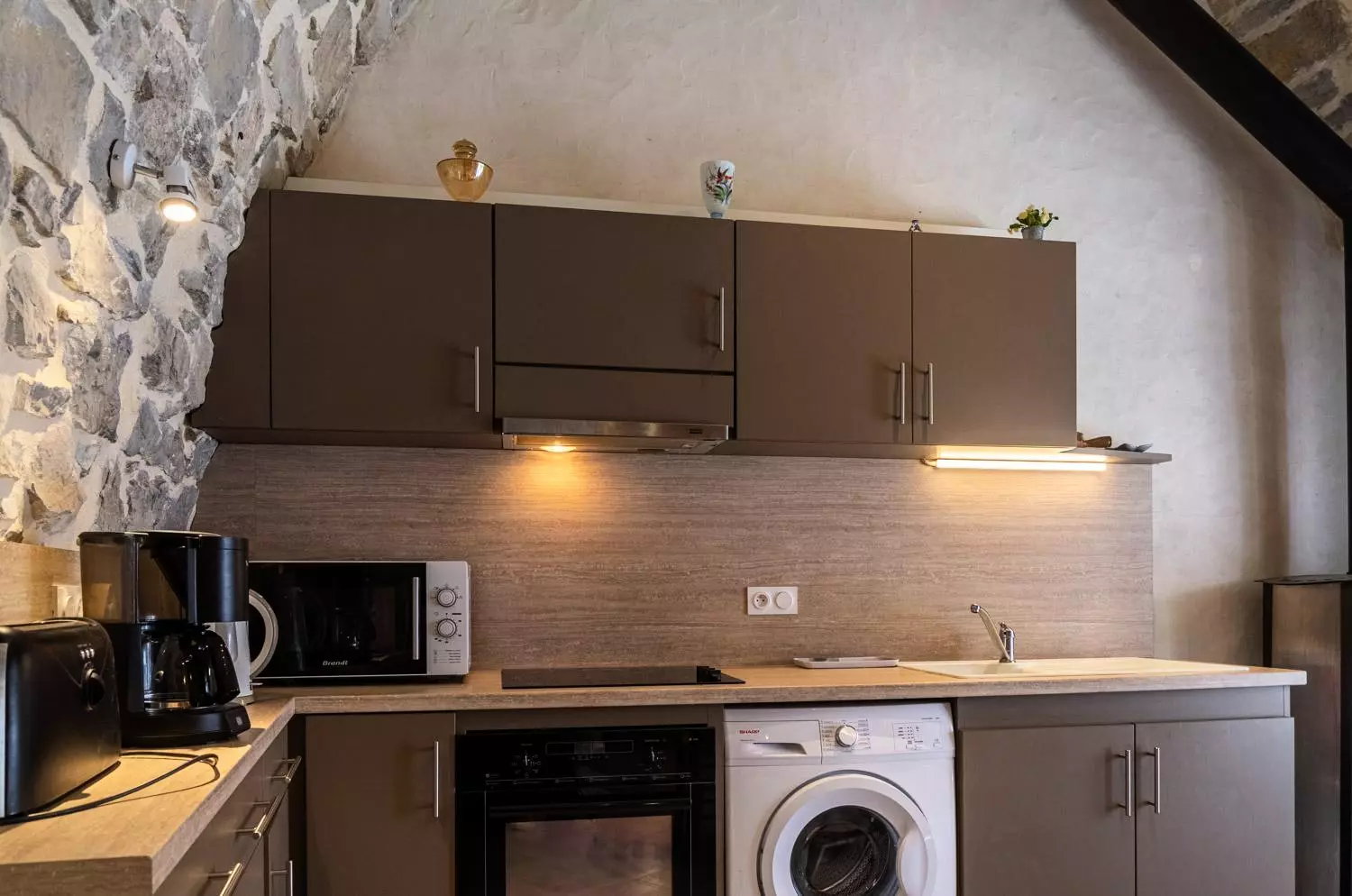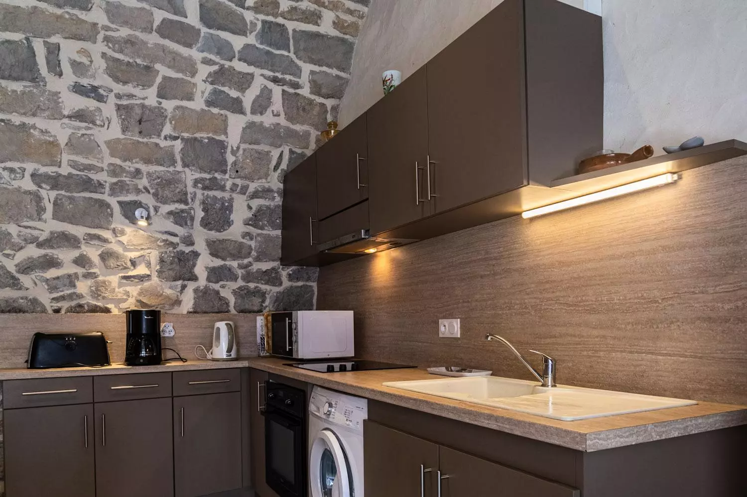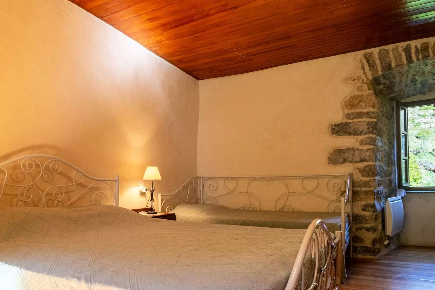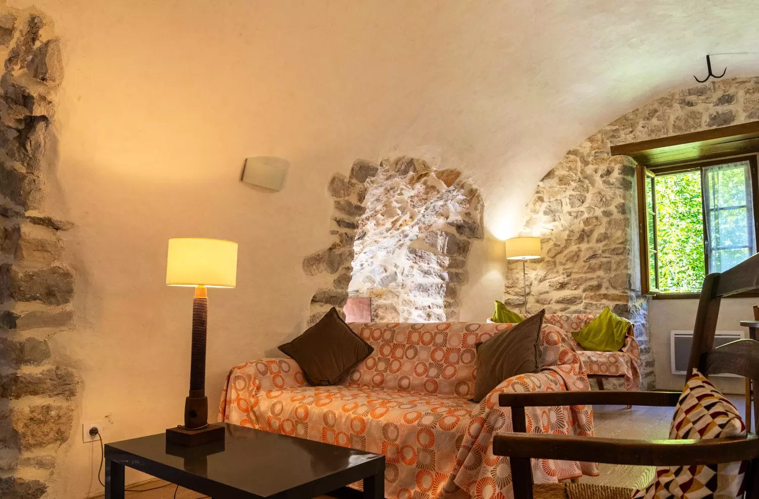 Au rez-de-chaussée : salle à manger voûtée (poêle à bois) avec cuisine équipée (réfrigérateur, congélateur, 3 plaques électriques, micro-ondes, lave-vaisselle, four), 1 chambre (1 lit 2 places), 1 chambre (1 lit 2 places et 1 lit 1 place), salle d'eau, WC.
