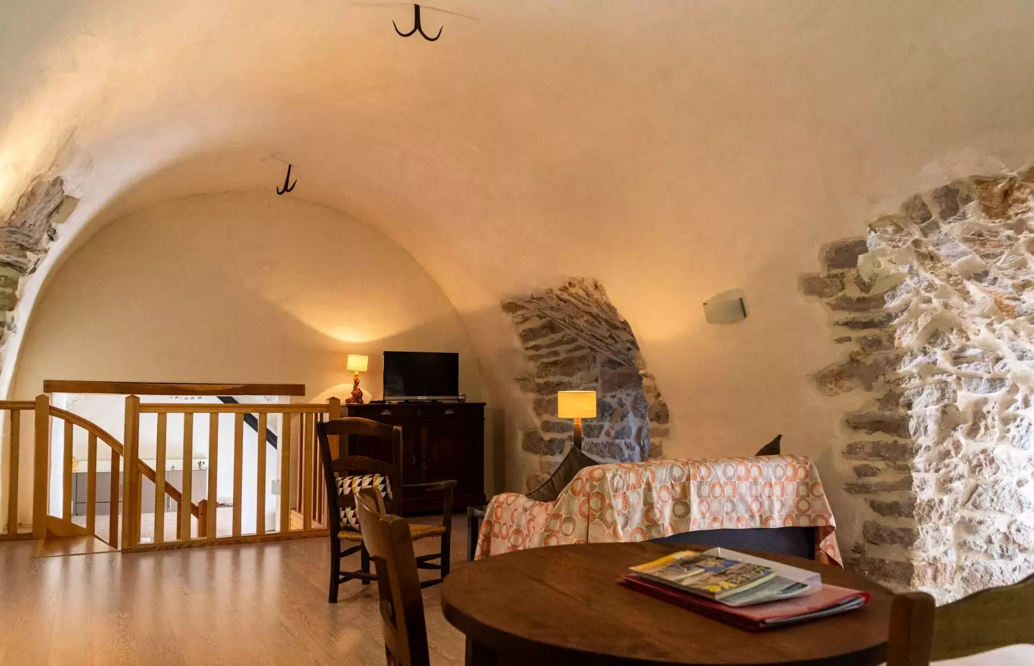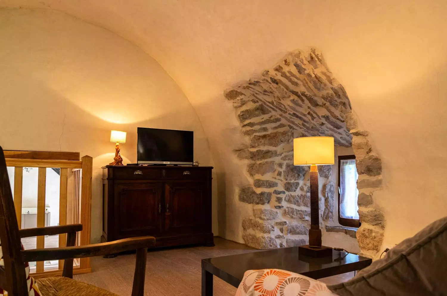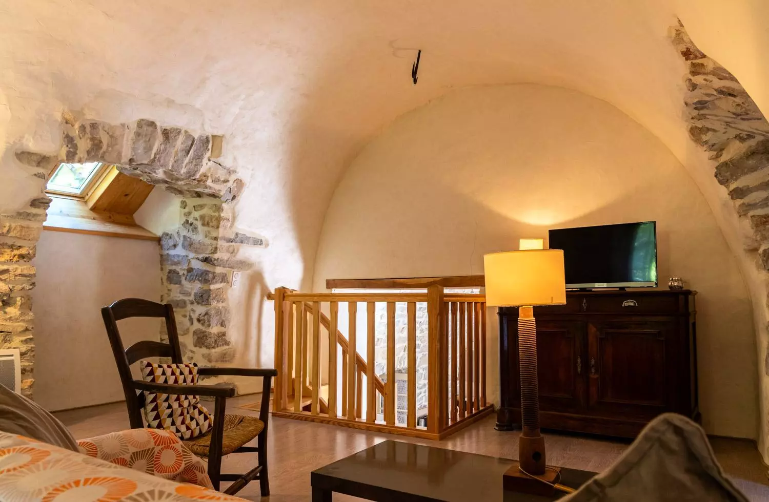 A l'étage : grande pièce voûtée aménagée en espace séjour (télévision).