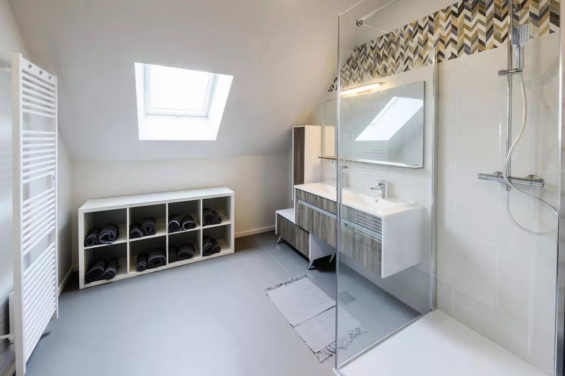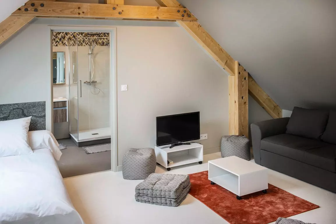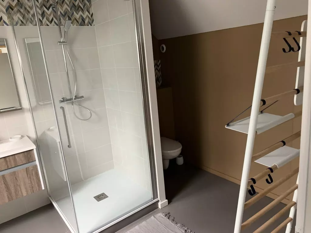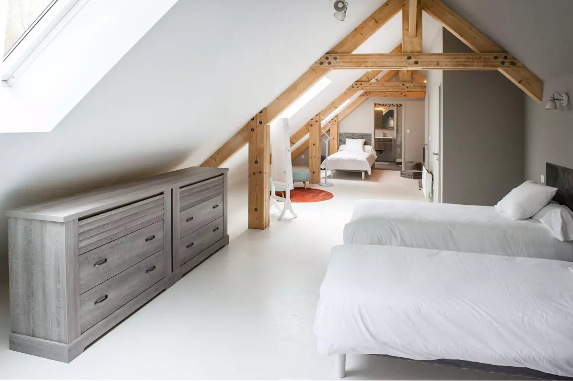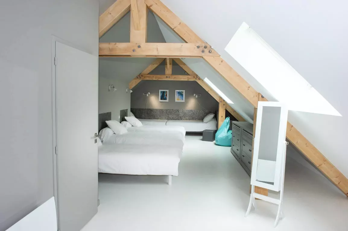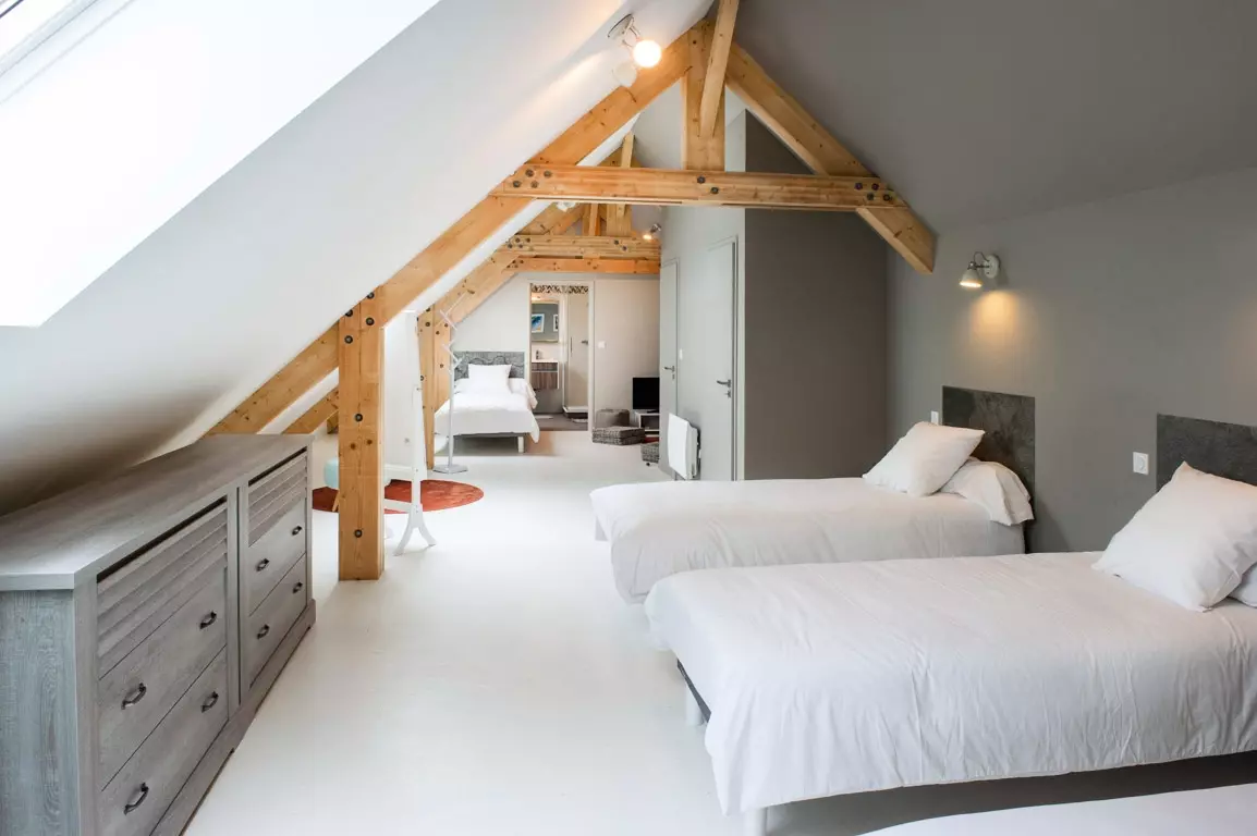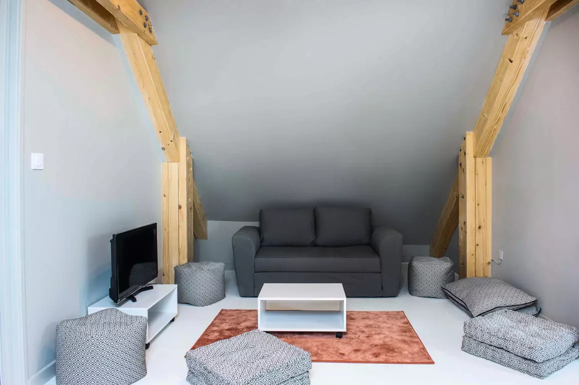 2ème étage : 1 coin salon télévision, 1 dortoir sous les combes avec 6 lits individuels, 1 salle d'eau, 1 WC