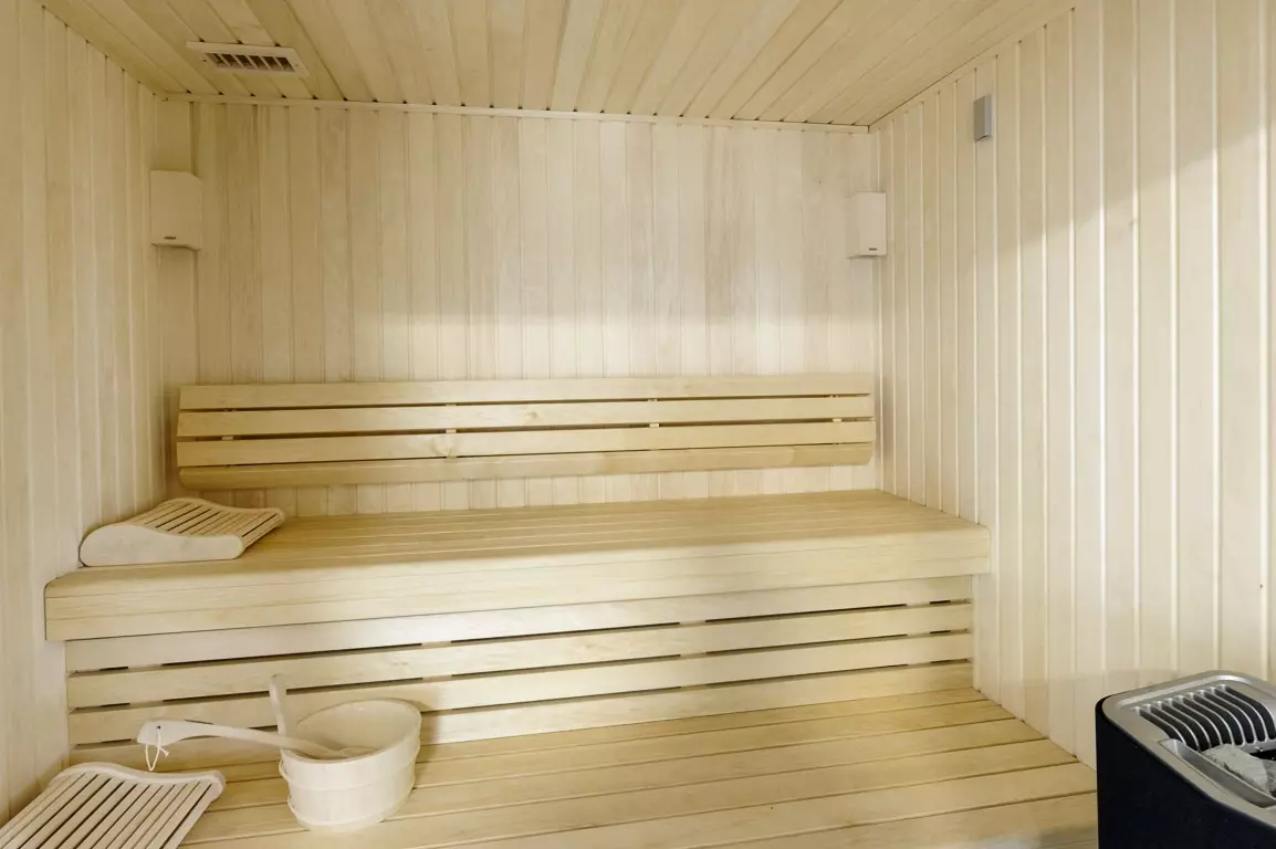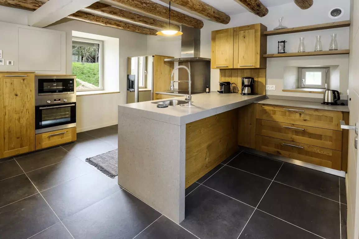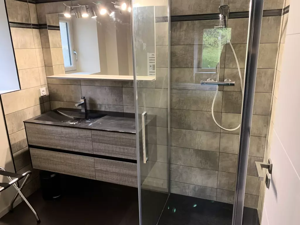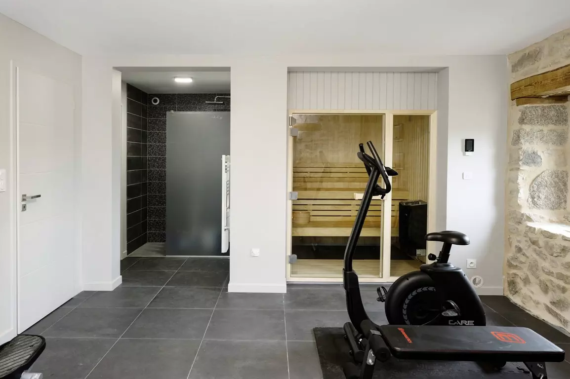 RDC: 1 cuisine, 1 salle à manger, 1 grand salon/séjour avec 1 poêle à bois, 1 salle de sport, sauna, salle d'eau et WC