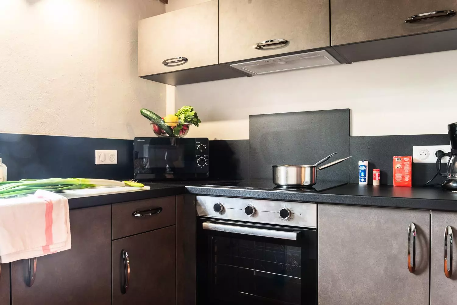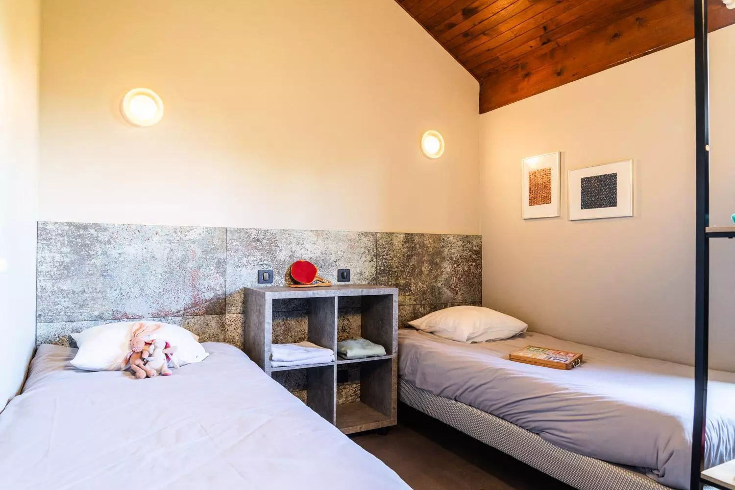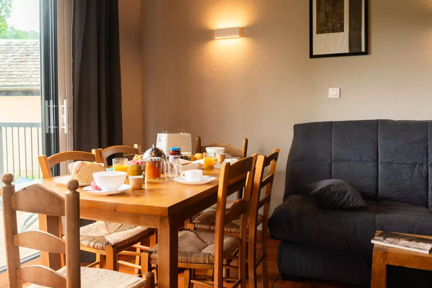 Hébergement de 38m² pour 4 à 6 personnes, entièrement rénové, disposant d'un coin cuisine équipée (réfrigérateur-congélateur, lave-vaisselle, plaque de cuisson, four, micro-ondes, hotte aspirante, cafetière), d'un séjour avec une télévision et un canapé-lit double (140x190), d'une première chambre avec un lit double (140x190), d'une seconde chambre avec deux lits simples (80x190), d'une salle d'eau et d'un wc indépendant. Terrasse privative équipée d'un salon de jardin.