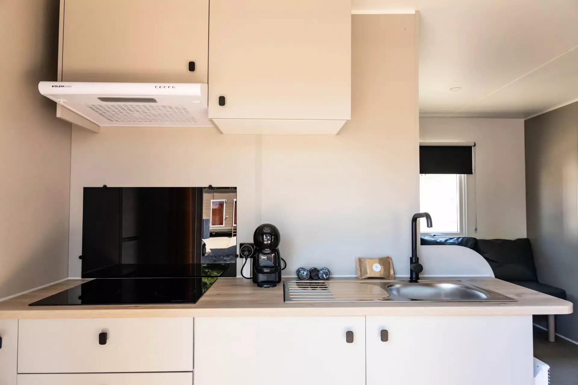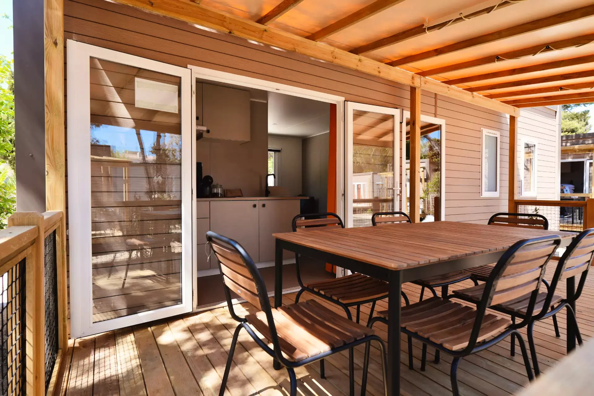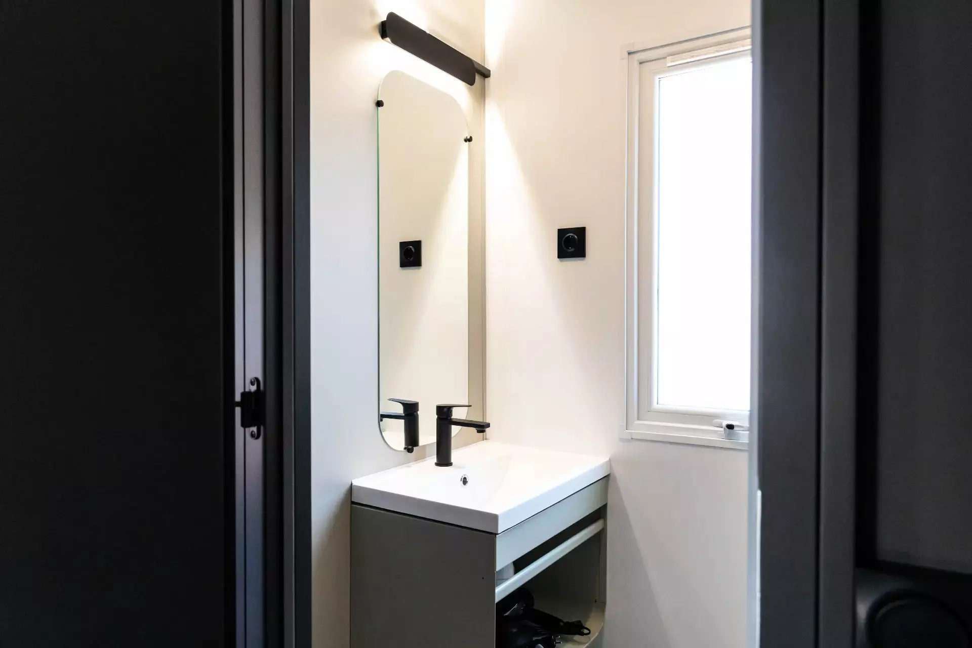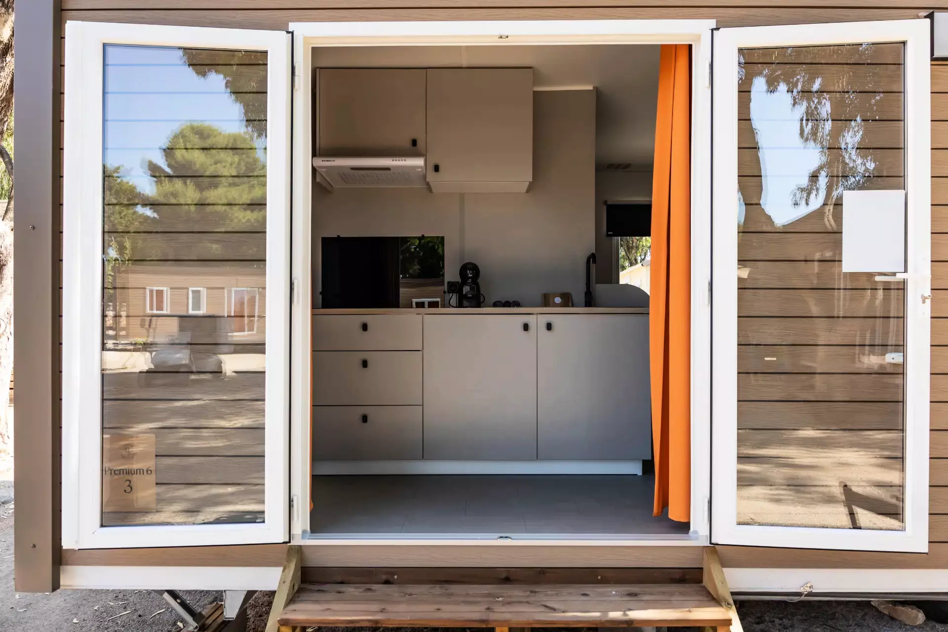 À l'intérieur, vous trouverez deux chambres : l'une avec un lit double, parfaite pour un repos profond, et l'autre avec deux lits simples, idéale pour que les enfants ou les amis aient leur propre espace. La cuisine est équipée d'un réfrigérateur, d'un micro-ondes et d'une cafetière. Le logement comprend une salle de bain privée avec douche, un coin repas intérieur climatisé et une terrasse meublée.