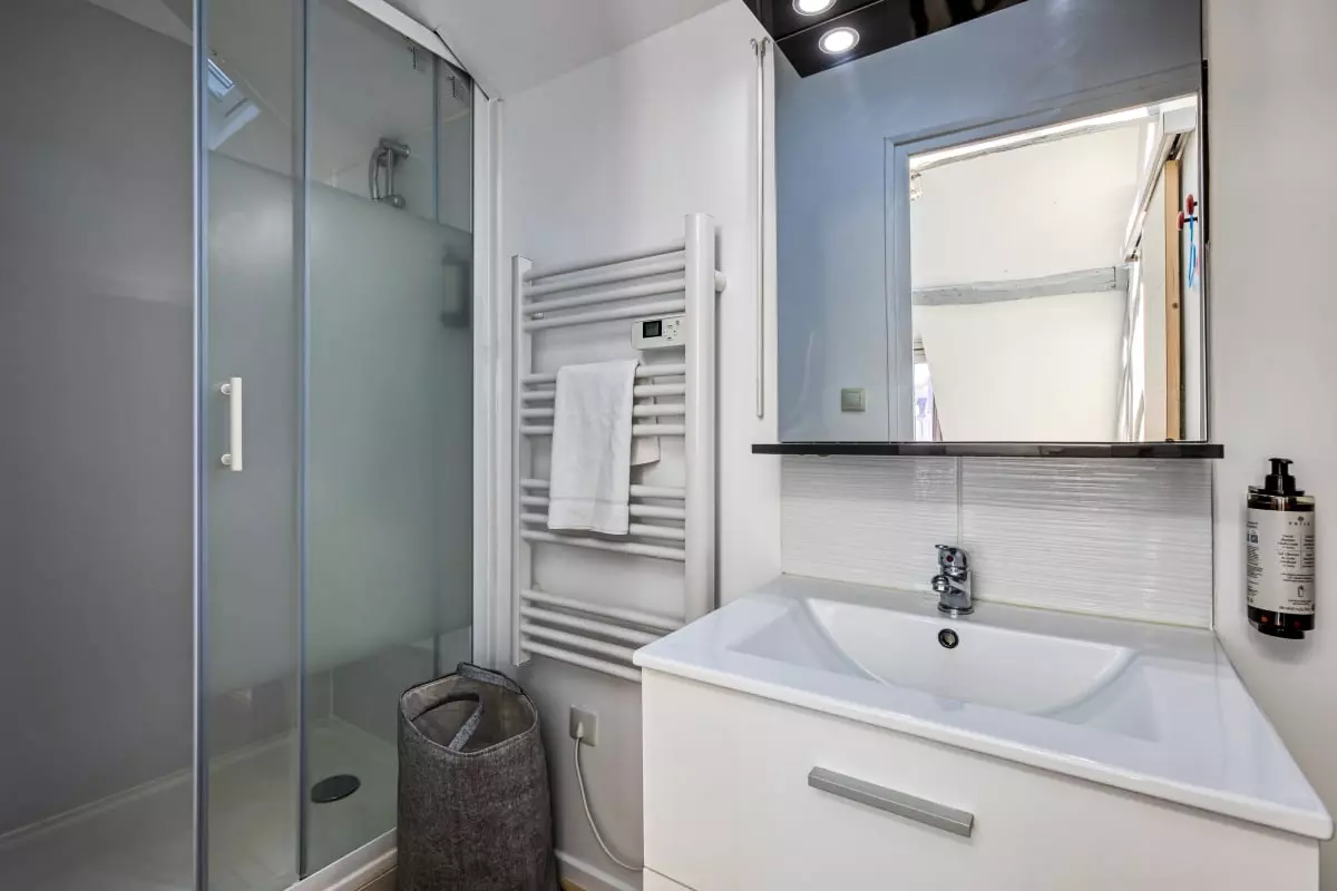 La chambre est indépendante avec grand lit double de marque Emma (180x200) et de rangements. La salle de douche est annexée à la chambre avec tout le confort d'un réveil matinal et équipée d'une machine pour laver le linge. Les WC sont indépendants.