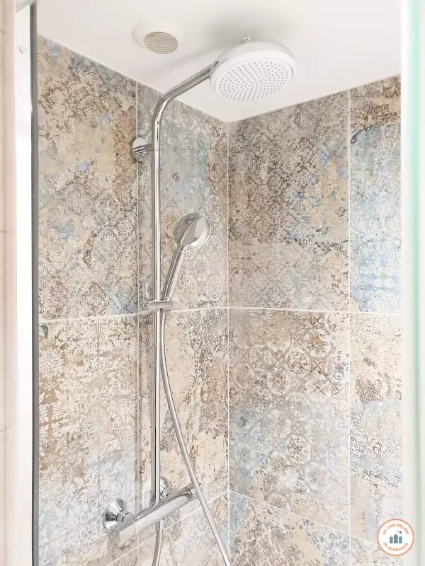 - Une salle de douche italienne avec colonne à effet pluie et machine à laver.