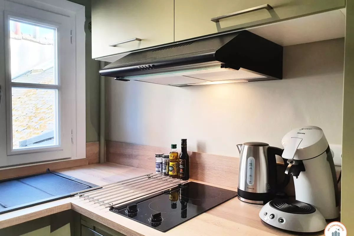 - Une cuisine entièrement équipée avec cuisinière, four, micro-ondes, réfrigérateur, machine à café, lave-vaisselle, et tout ce qu'il faut pour cuisiner de bons petits plats (ou juste un café, on ne juge pas).