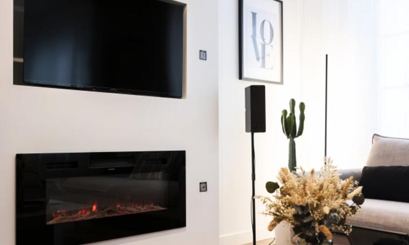 Un salon spacieux et raffiné, à la décoration moderne et élégante, parfait pour se détendre ou laisser libre cours à vos envies. Une cheminée électrique ajoute une touche chaleureuse et intimiste, propice à la relaxation ou à des moments de complicité.