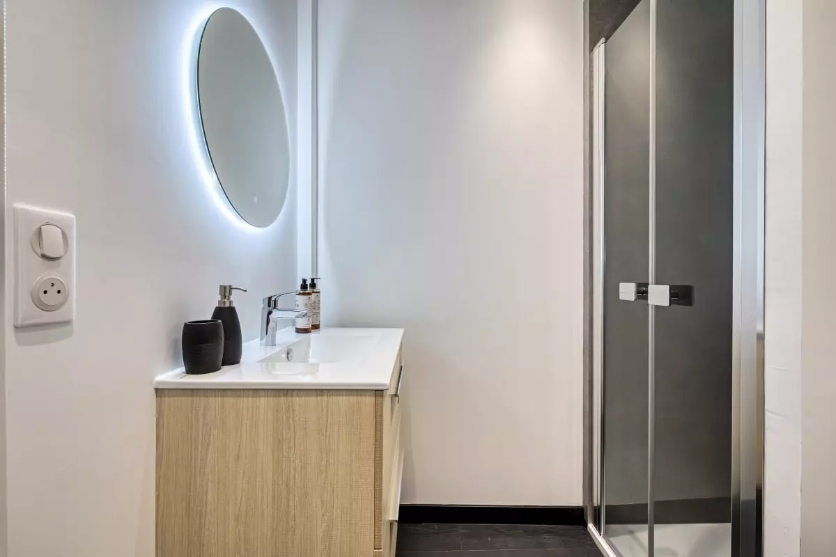 Dans la chambre profitez du lit et de ses rangements. La salle de douche est moderne et fonctionnelle.