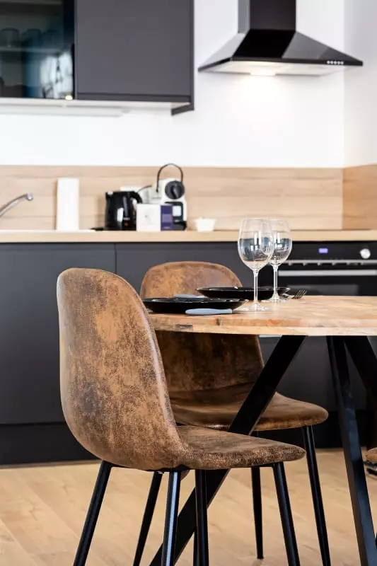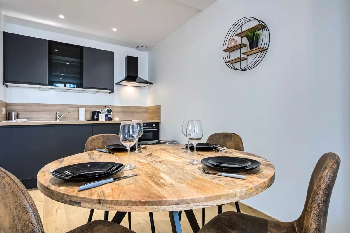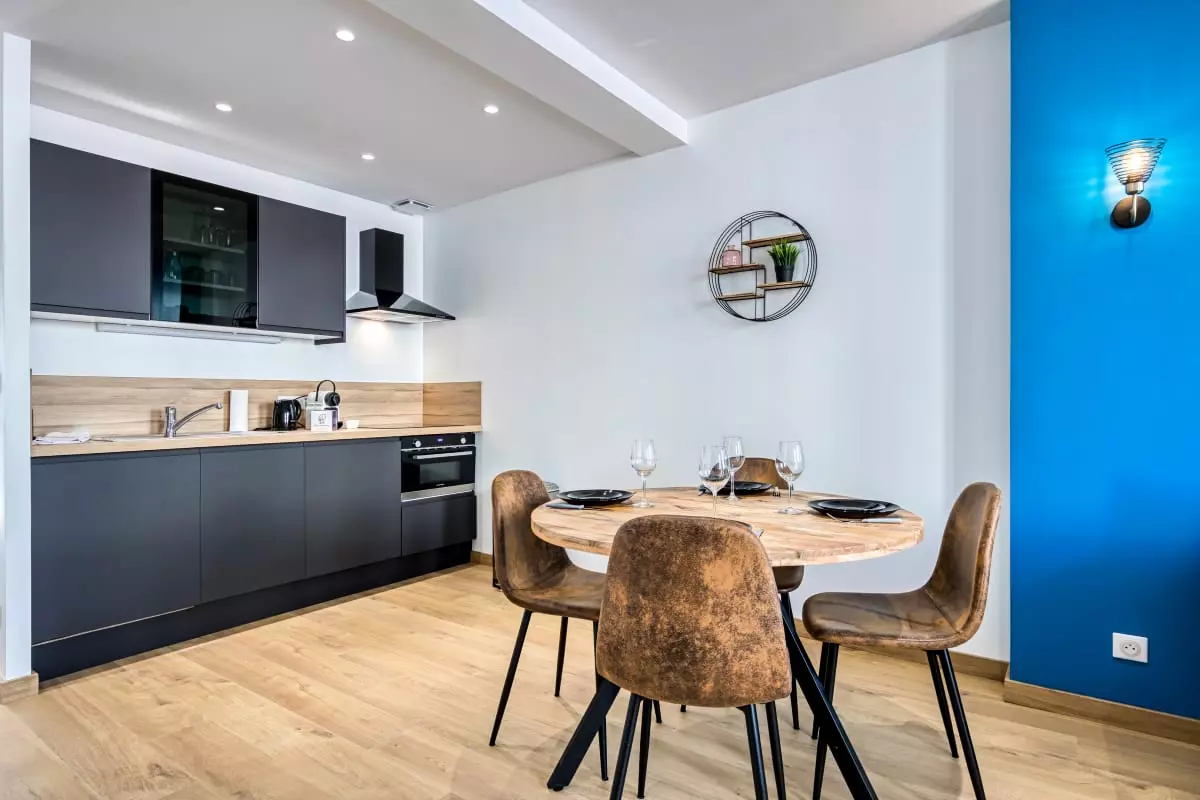 La cuisine est aménagée et équipée et vous offre tout le nécessaire de cuisine ainsi qu'un lave-vaisselle, plaques de cuisson, bouilloire, cafetière de type Nespresso, mini four combi micro-ondes et un petit réfrigérateur/congélateur.